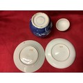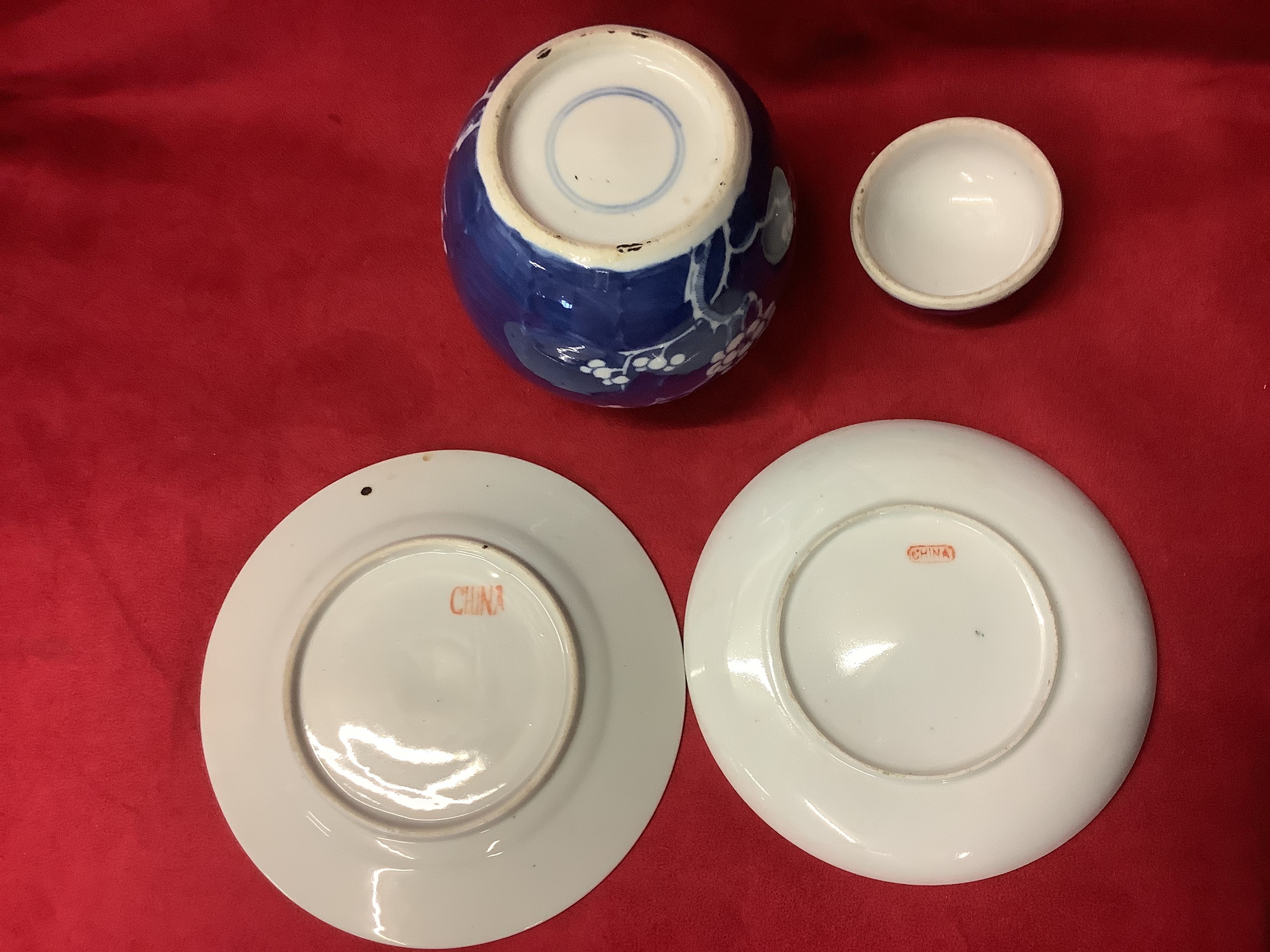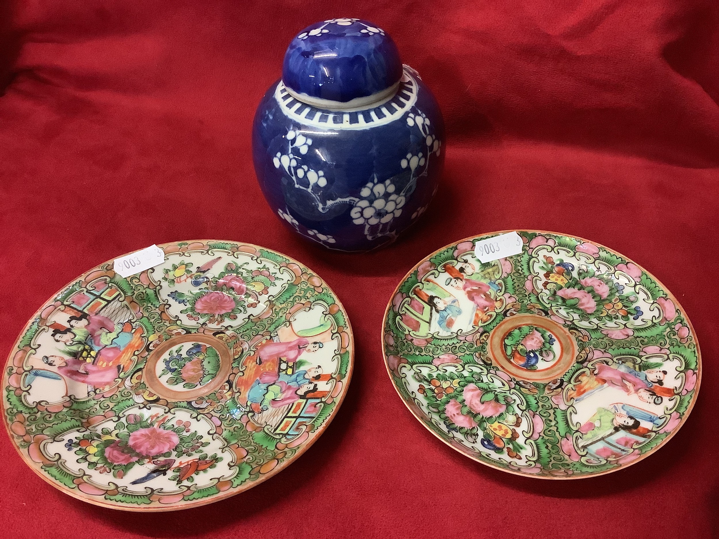 A Chinese small famille rose plate and saucer together with a prunus ginger jar with lid