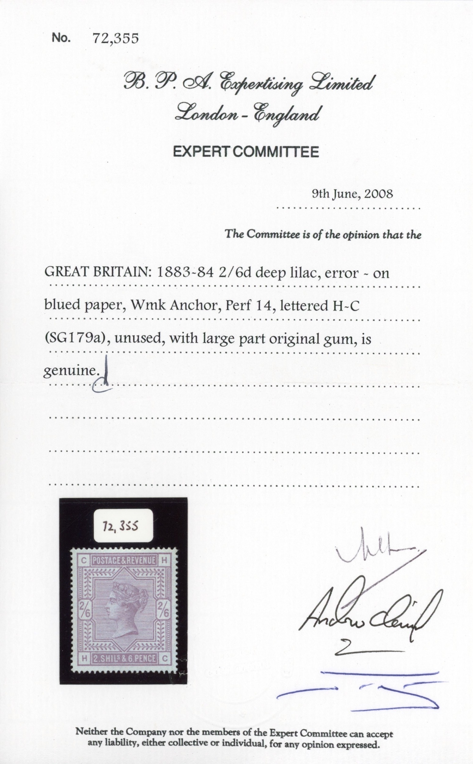 GB SG 179a 1883 2s6d on blued paper error mint