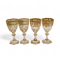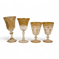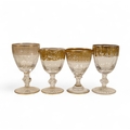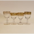 De Lamerie Fine Bone China Glass Goblets, heavily gilded with various designs, Made in England. (4)