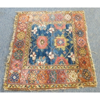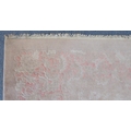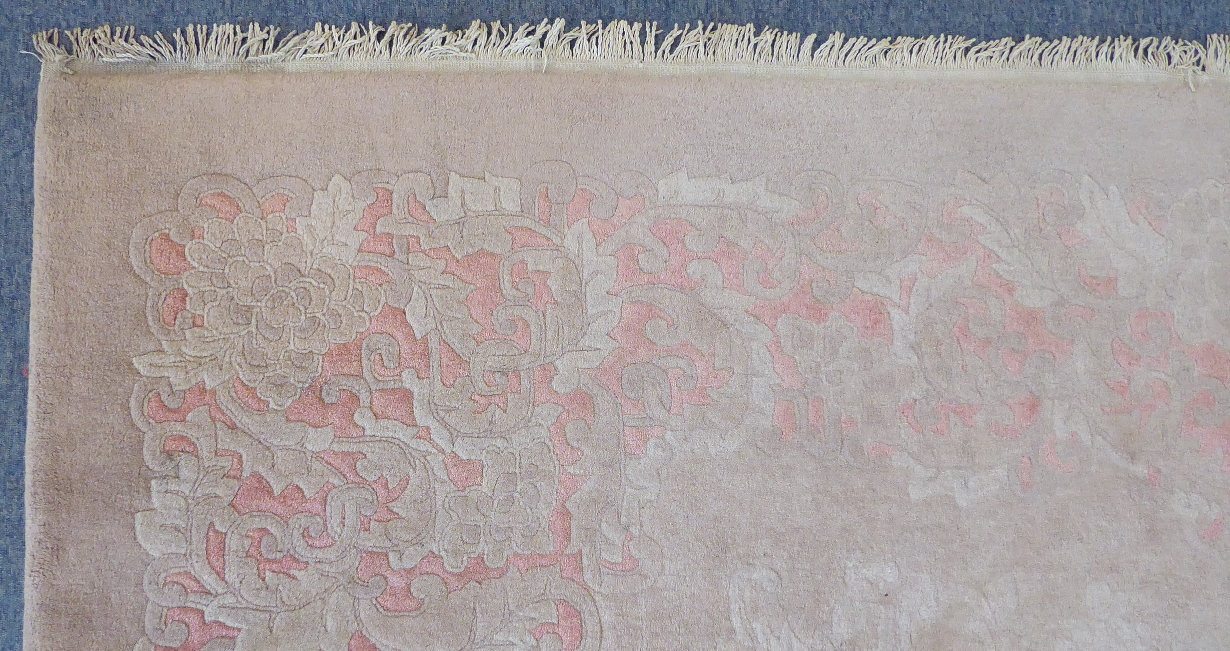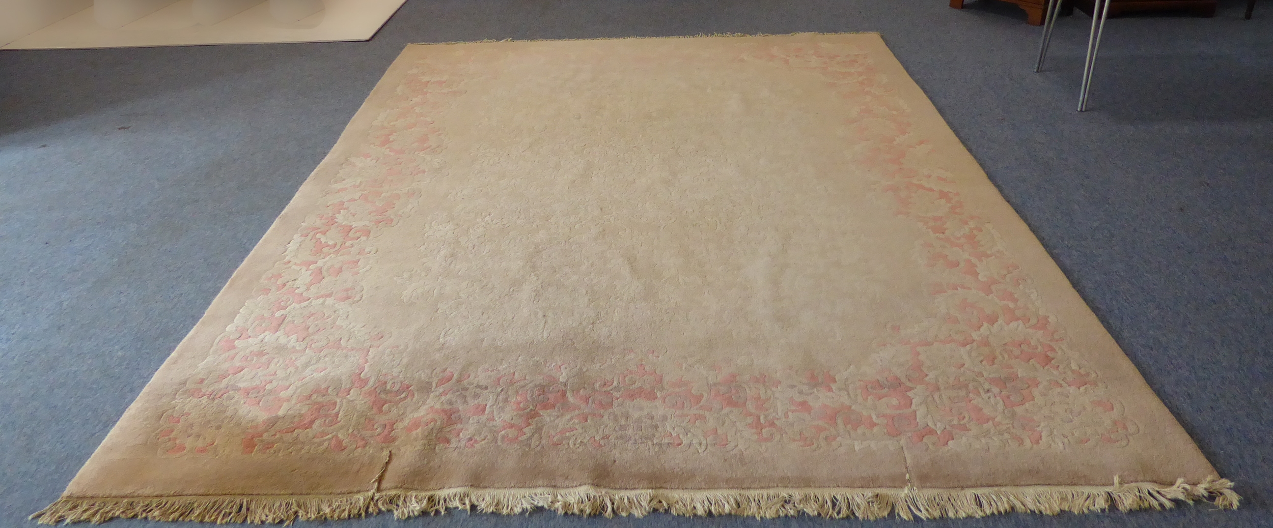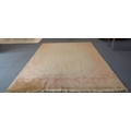 A large Chinese beige ground woollen carpet with rose pink border: cut at one end to accommodate a fireplace (360 x 270 cm)
