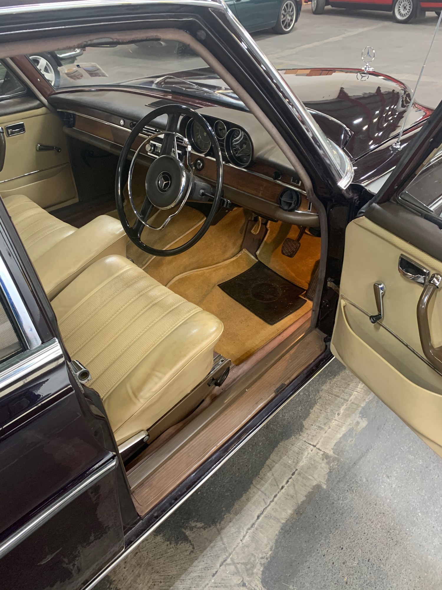 Mercedes 250 S (2.5L), 1967, Auto, 4 door saloon, showing 60,000 miles, dark burgundy with light beige Mex-Tex interior, vintage taxed 11/20. This is a magnificent example with in my opinion the perfect colour combo of Black exterior and cream/beige Mex-tex interior.