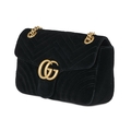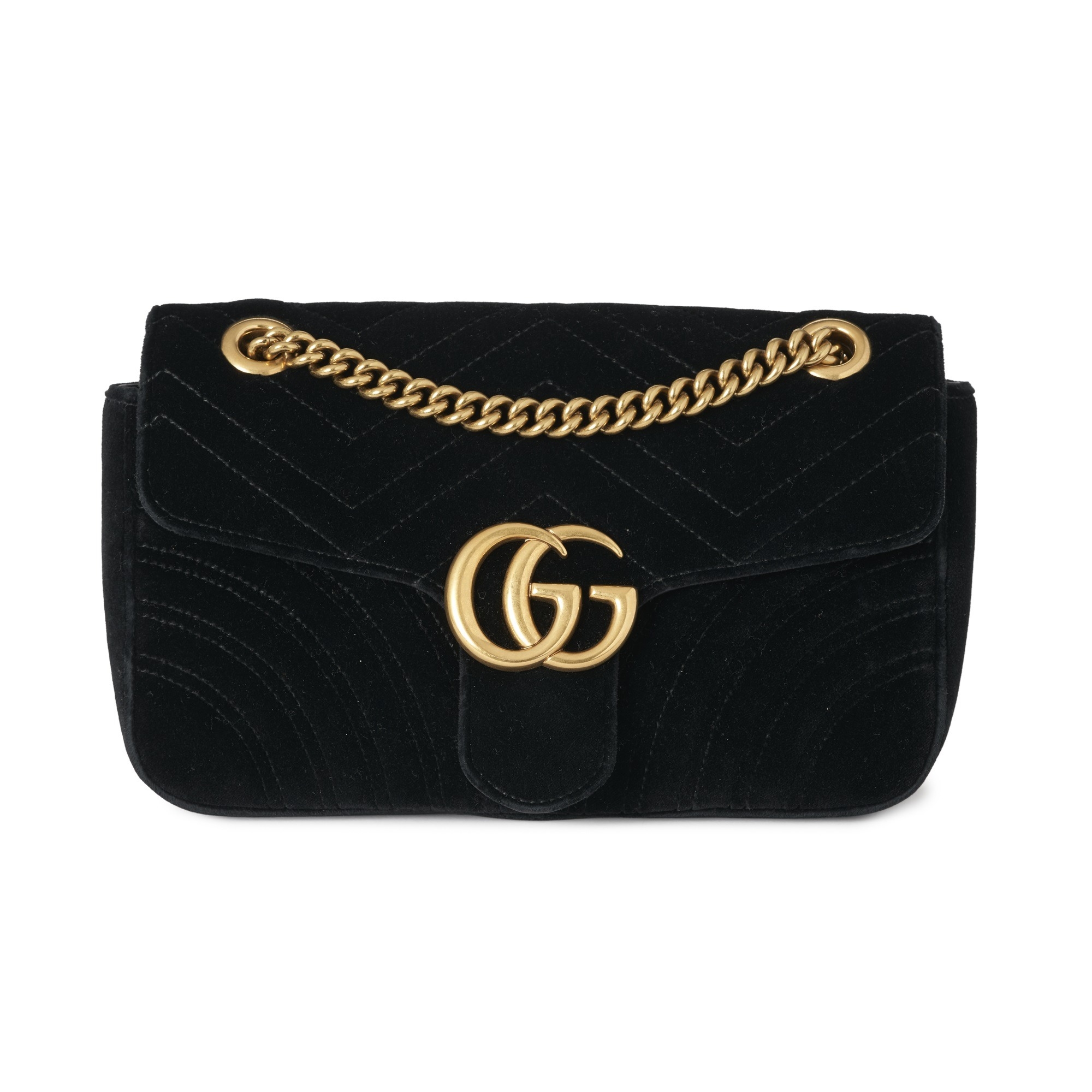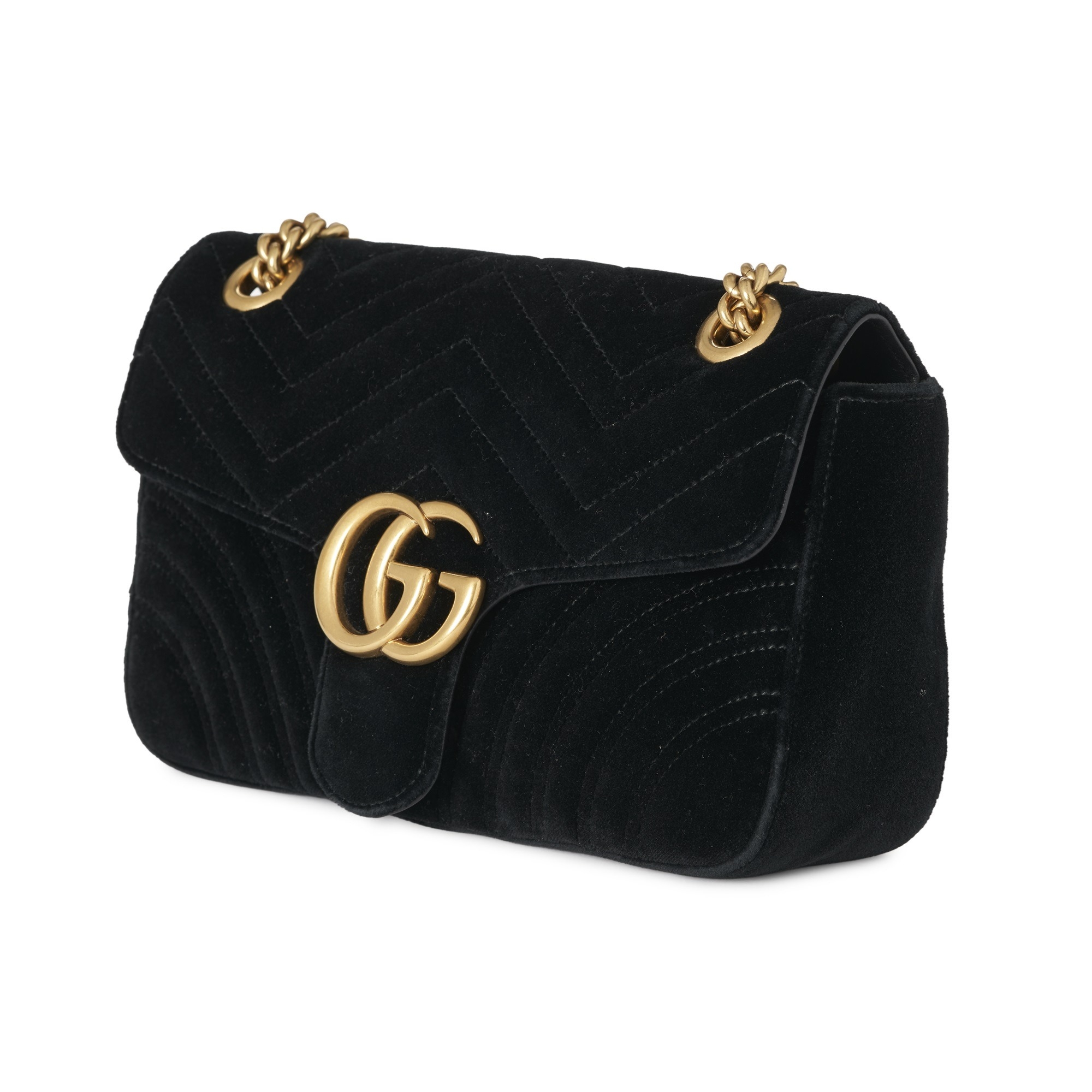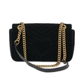 Gucci, a black velvet Marmont handbag, featuring a chevron quilted leather exterior with heart detail to the reverse, with brushed gold-tone hardware, flap closure with double G front plaque fastener, two-way chain strap and a pink satin interior lining with one zip pocket, measuring 7 by 15 by 25cm