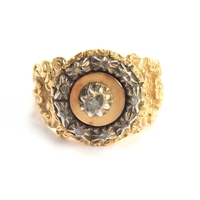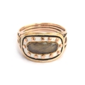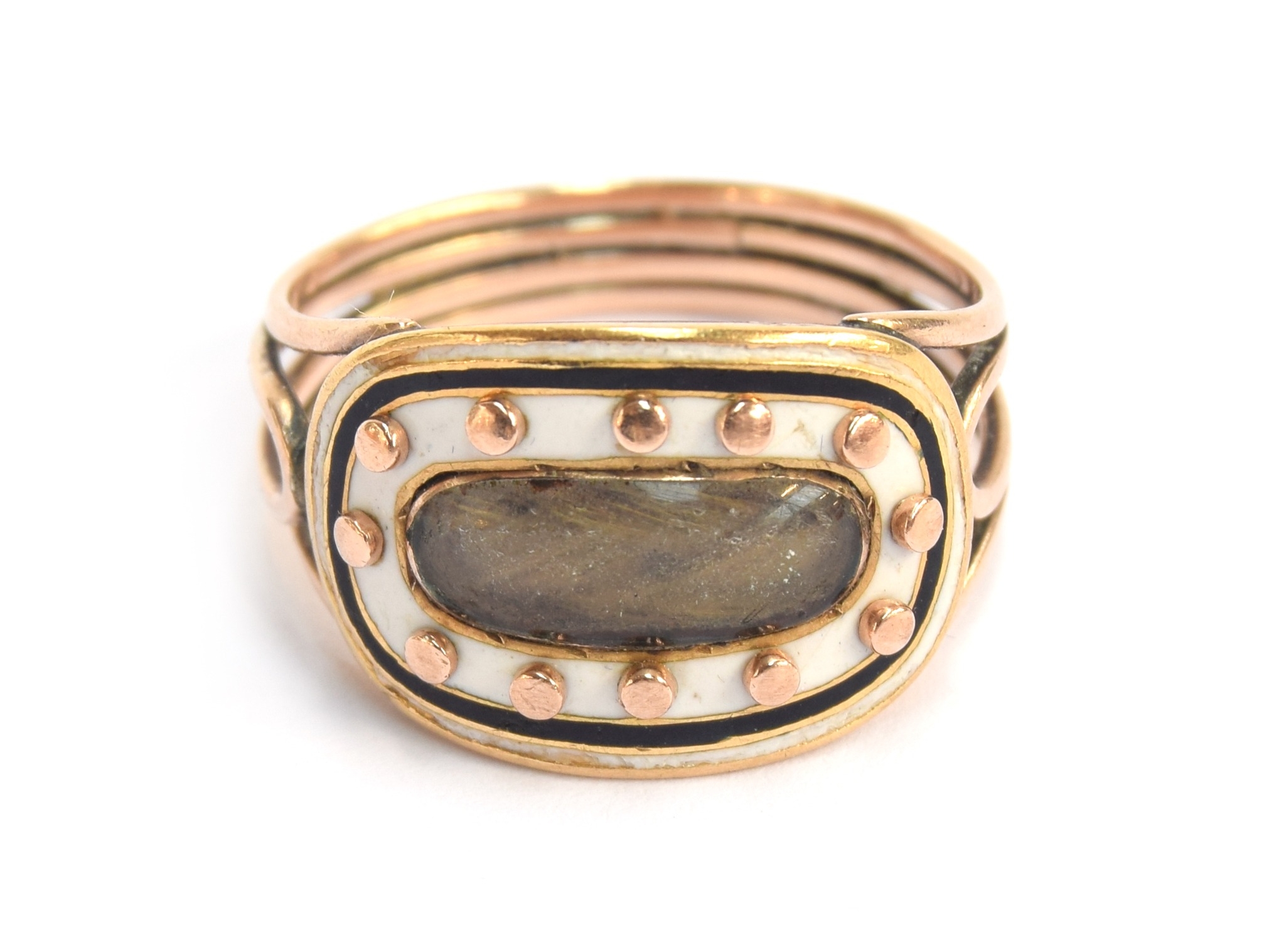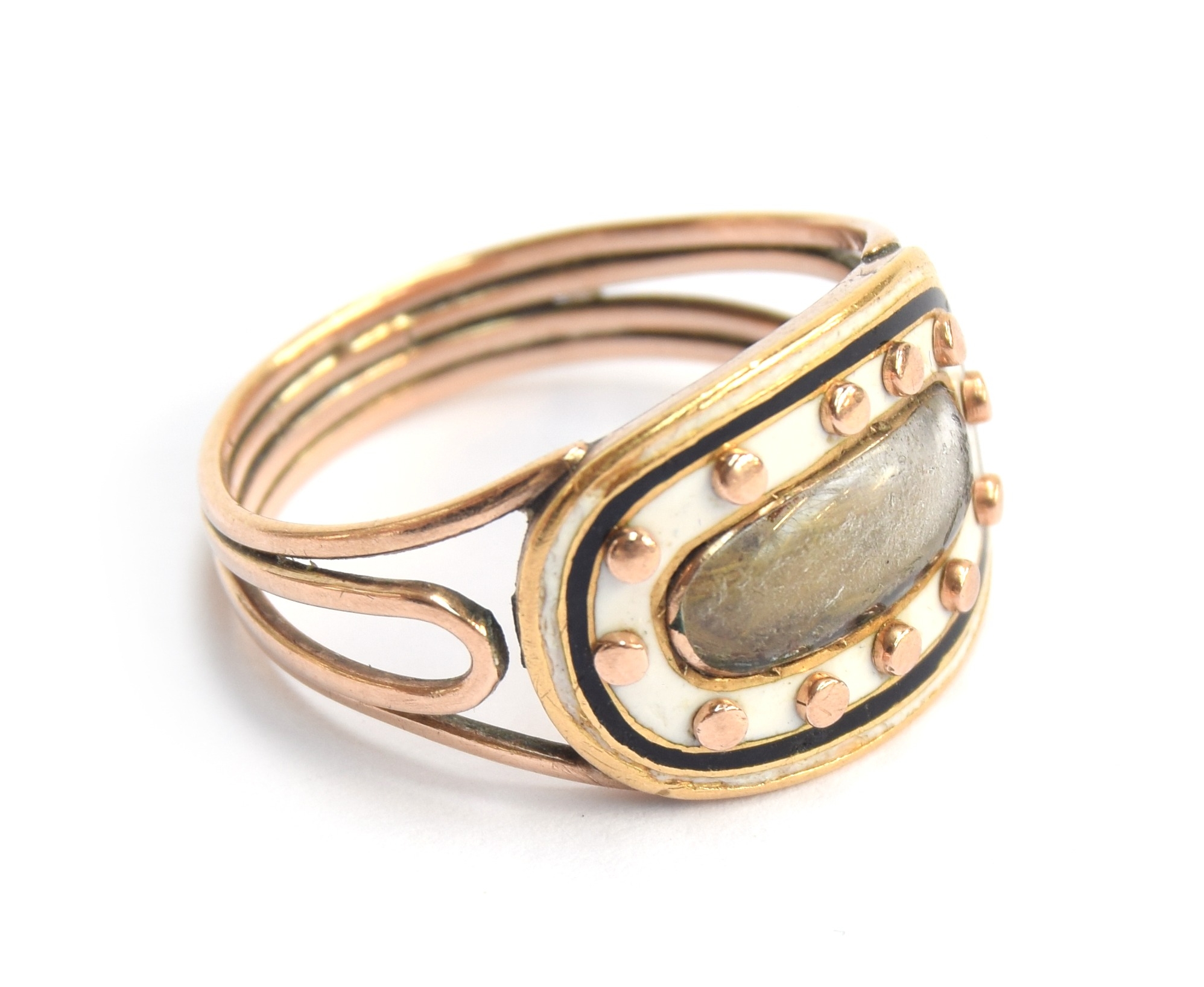 A Georgian gold mourning ring, black and white enamel with glazed central section, engraved to reverse 'Memento Mori Catharine Parr', size N, 4g