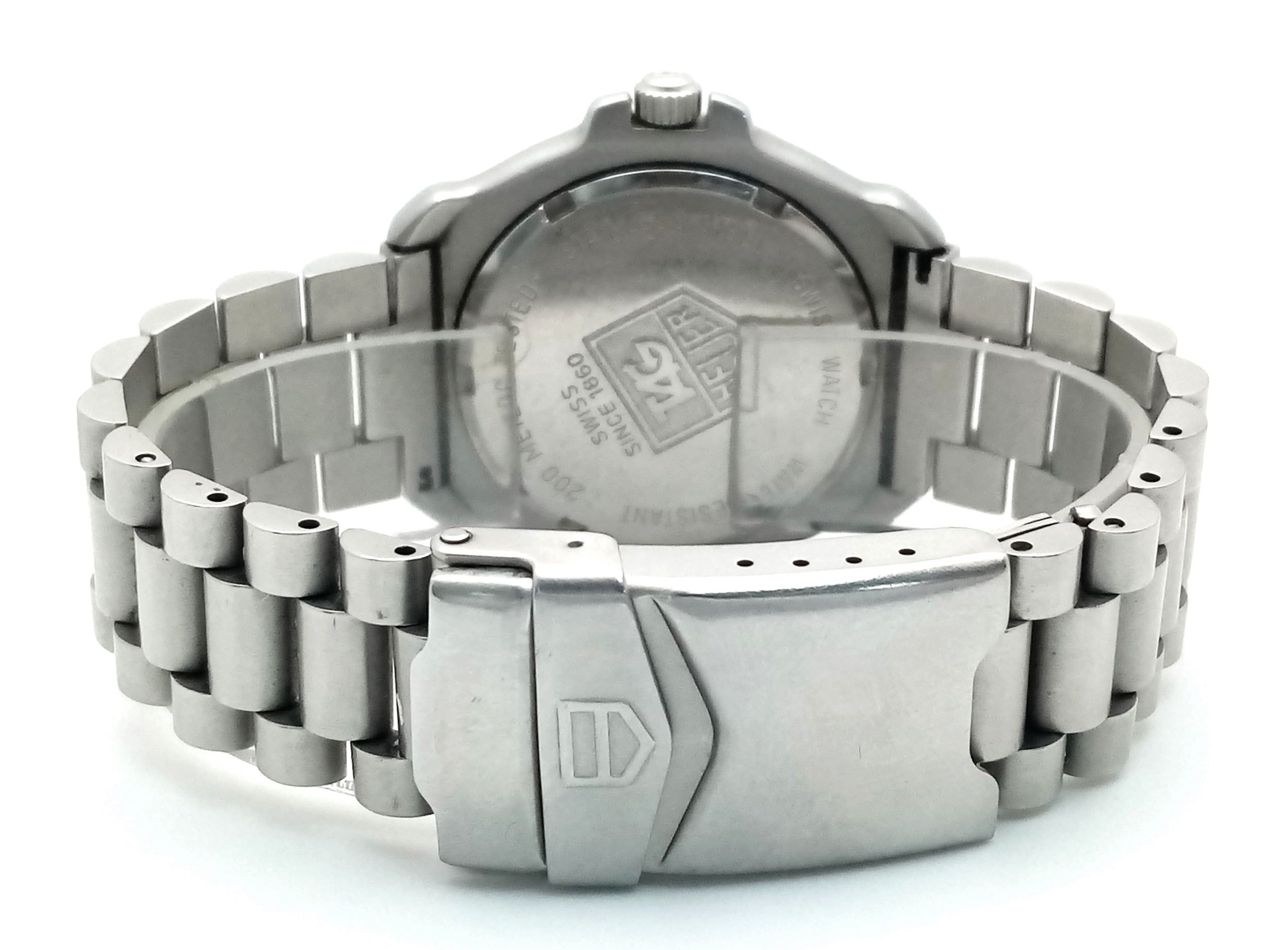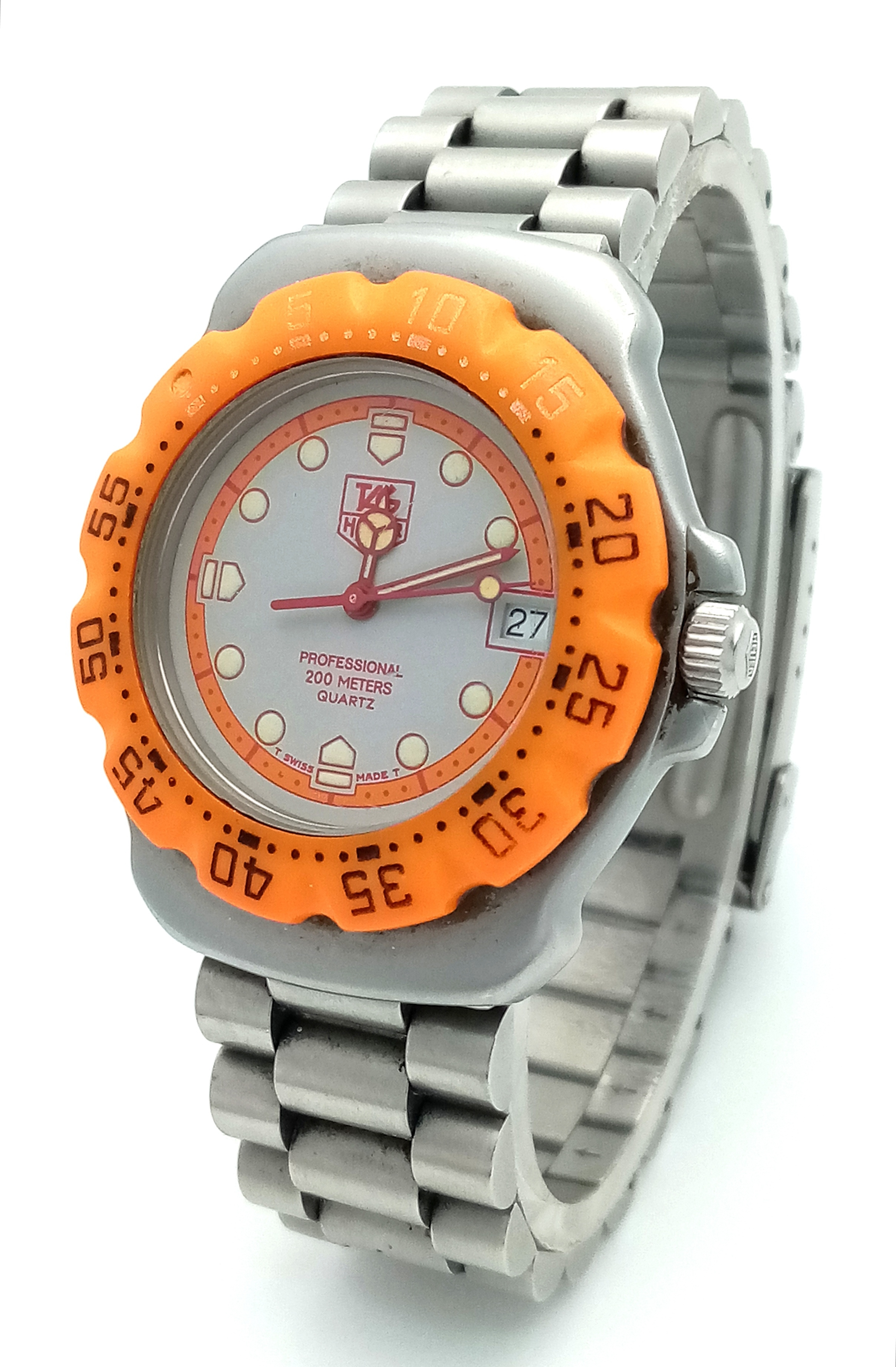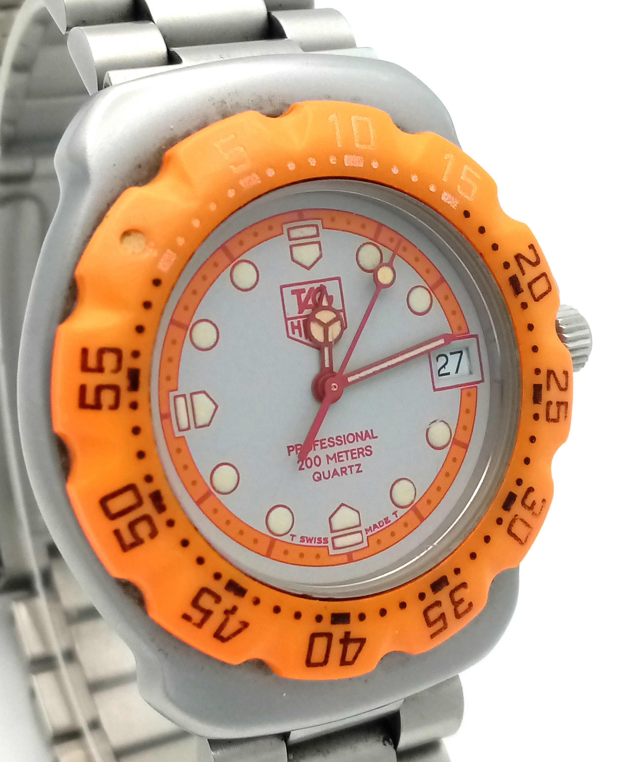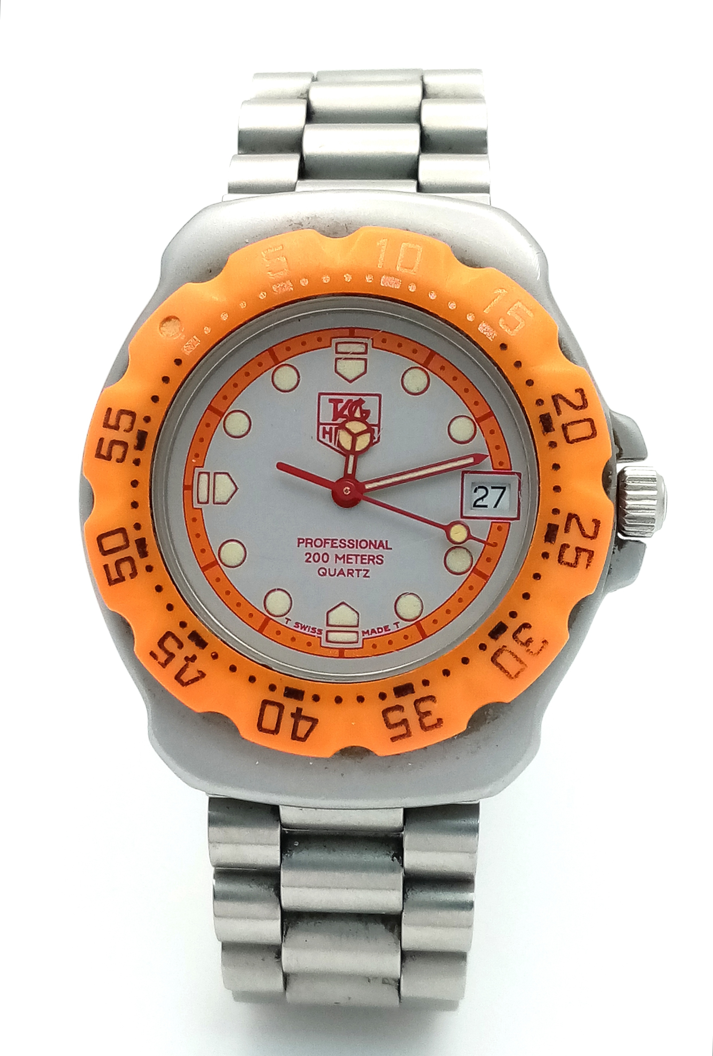 A Tag Heuer Orange Bezel Quartz Gents Watch. Model 373-513. Stainless steel bracelet and case - 32mm. Two tone dial with date window. In working order. STK025352