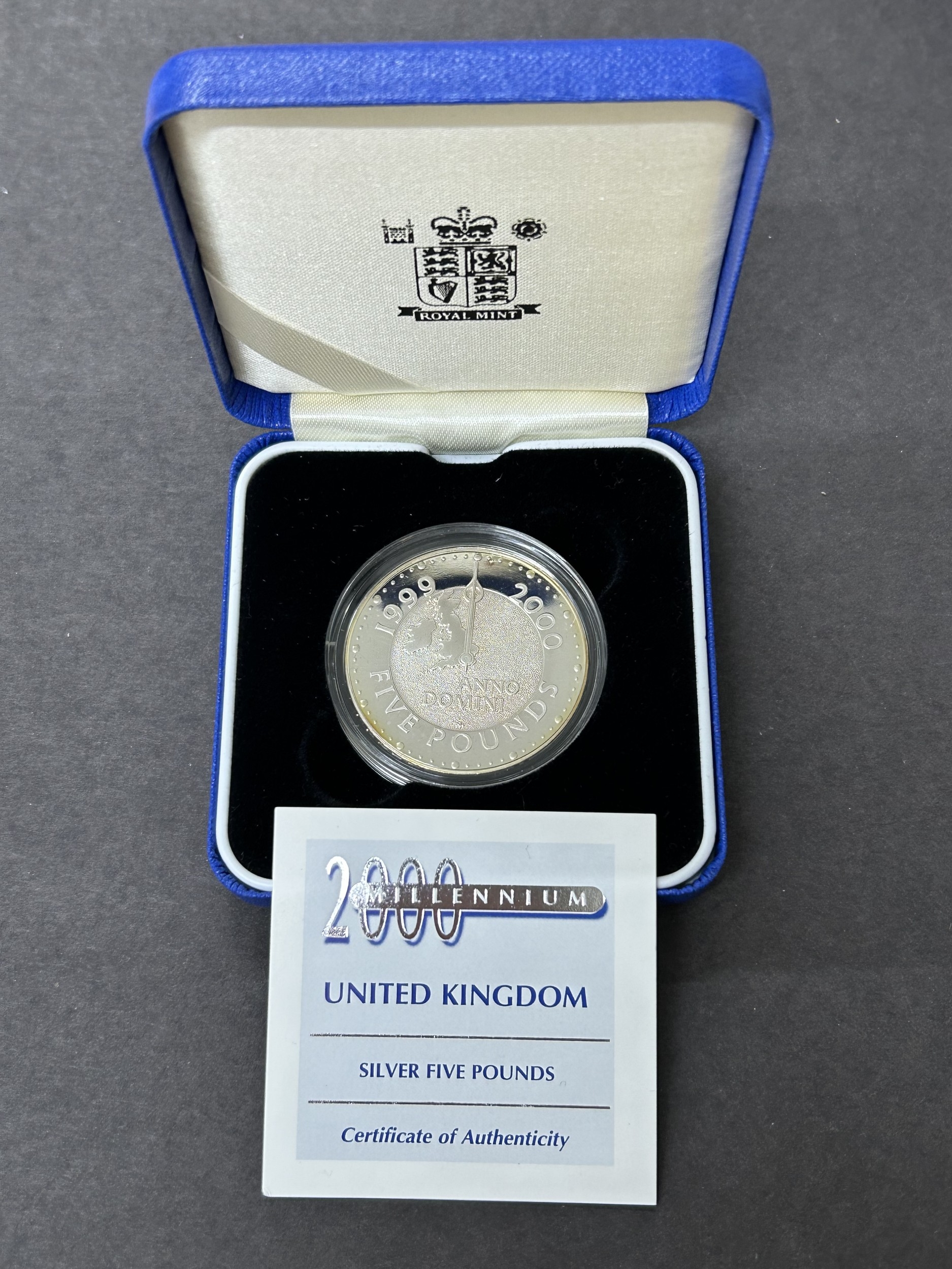 A cased 1999-2000 silver £5 coin, weight approx. 28g