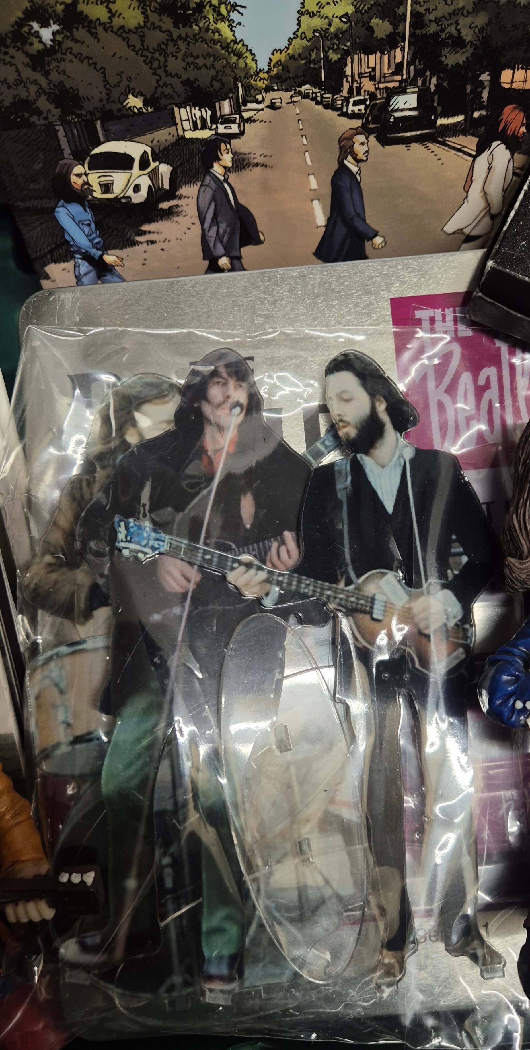 Collection of Beatles Memorabilia items; The Beatles Character figures, Beatle DVD set collectable books & comics.