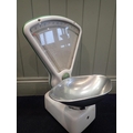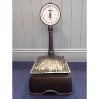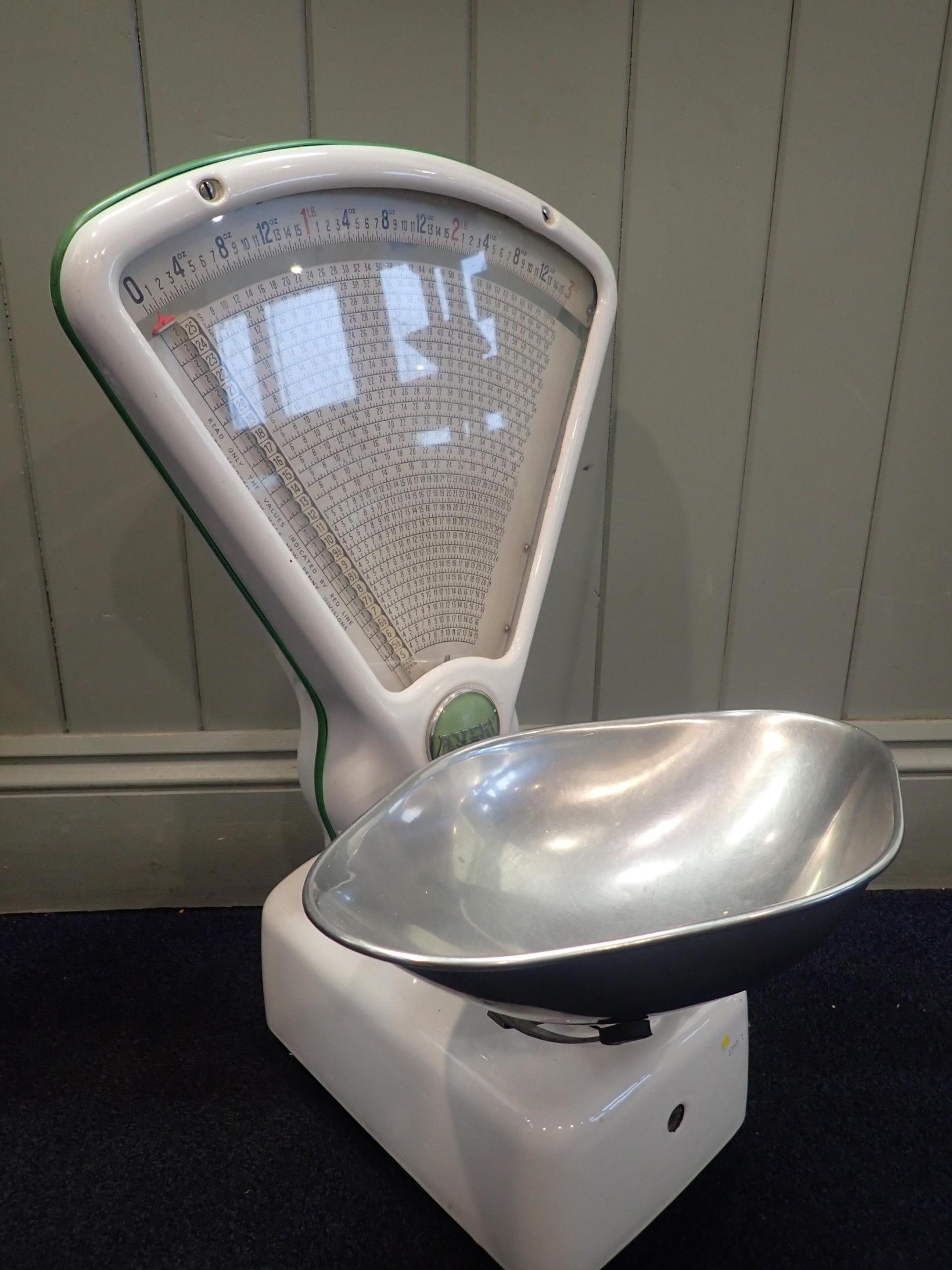 A VINTAGE AVERY 3 LB SHOP SCALEwhite enamel with green trim, 61cm high