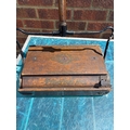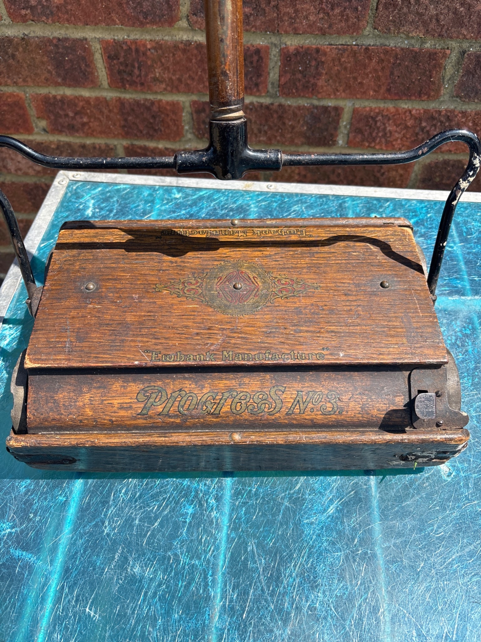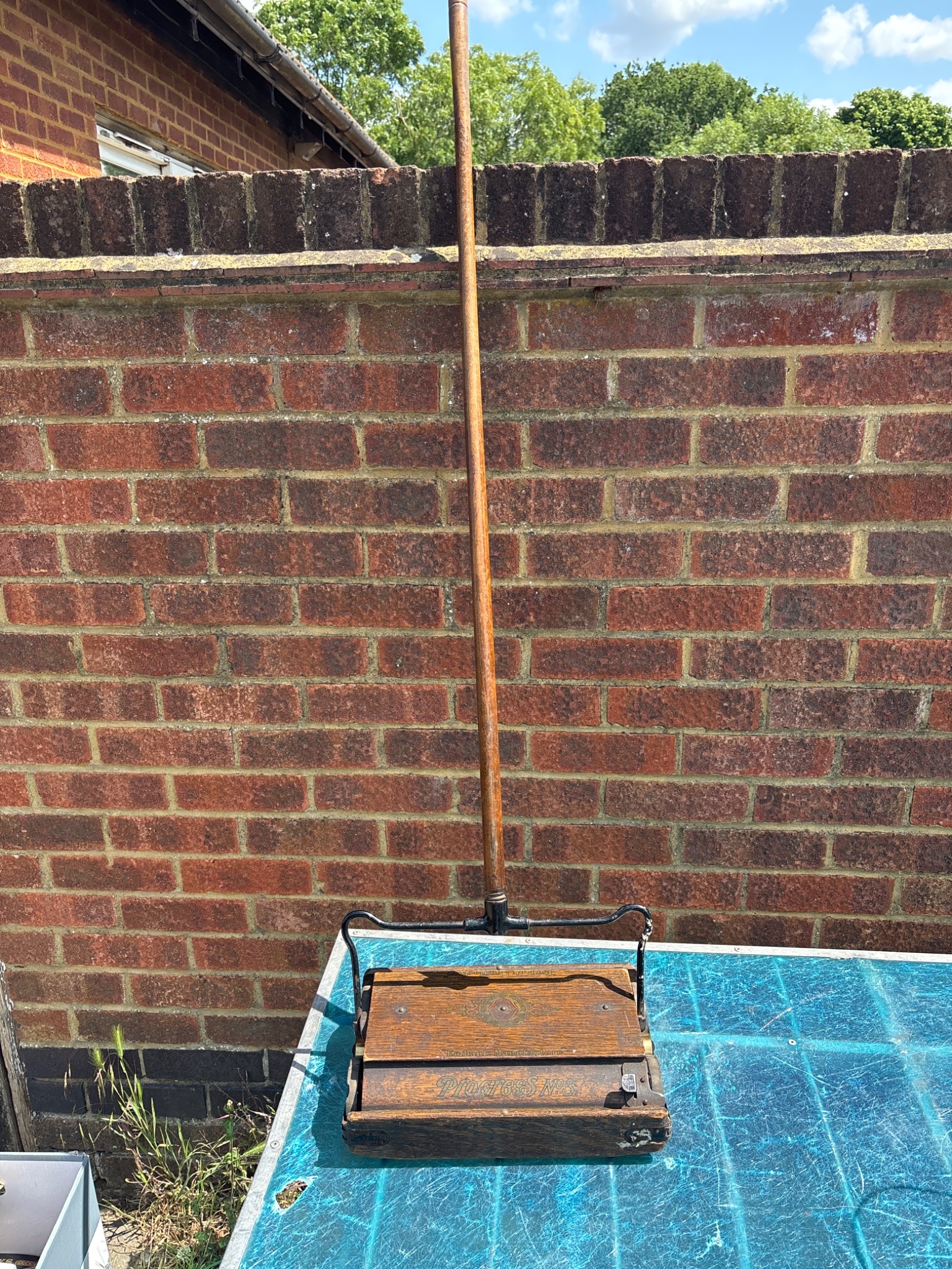 Vintage wooden carpet sweeper with a metal handle, branded 'Pigur's No. 1'. Features metal hinges, mechanisms, and original craftsmanship on wood.not postable