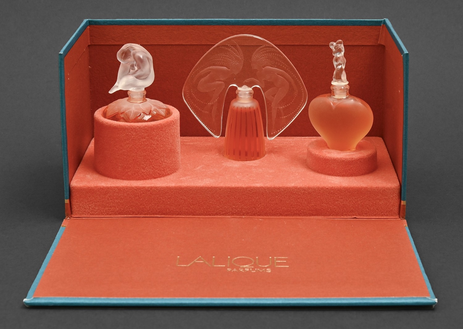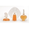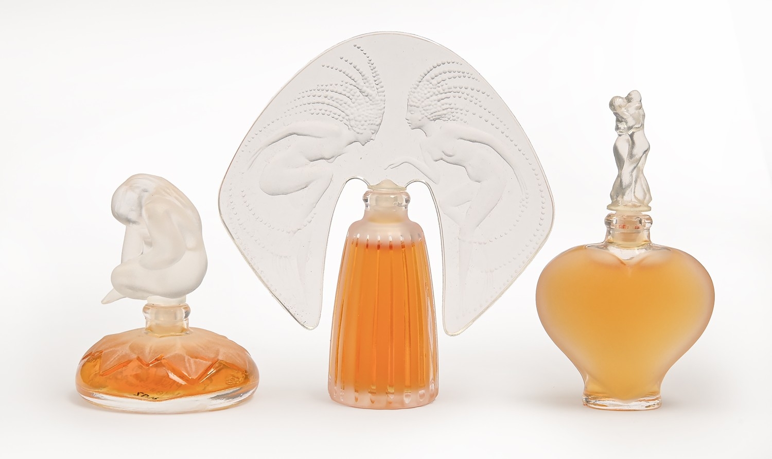 "Les Introuvables". A set of three Lalique glass perfume bottles, late 20th c, "Le Nu", "Ondines" and "Amour", boxed