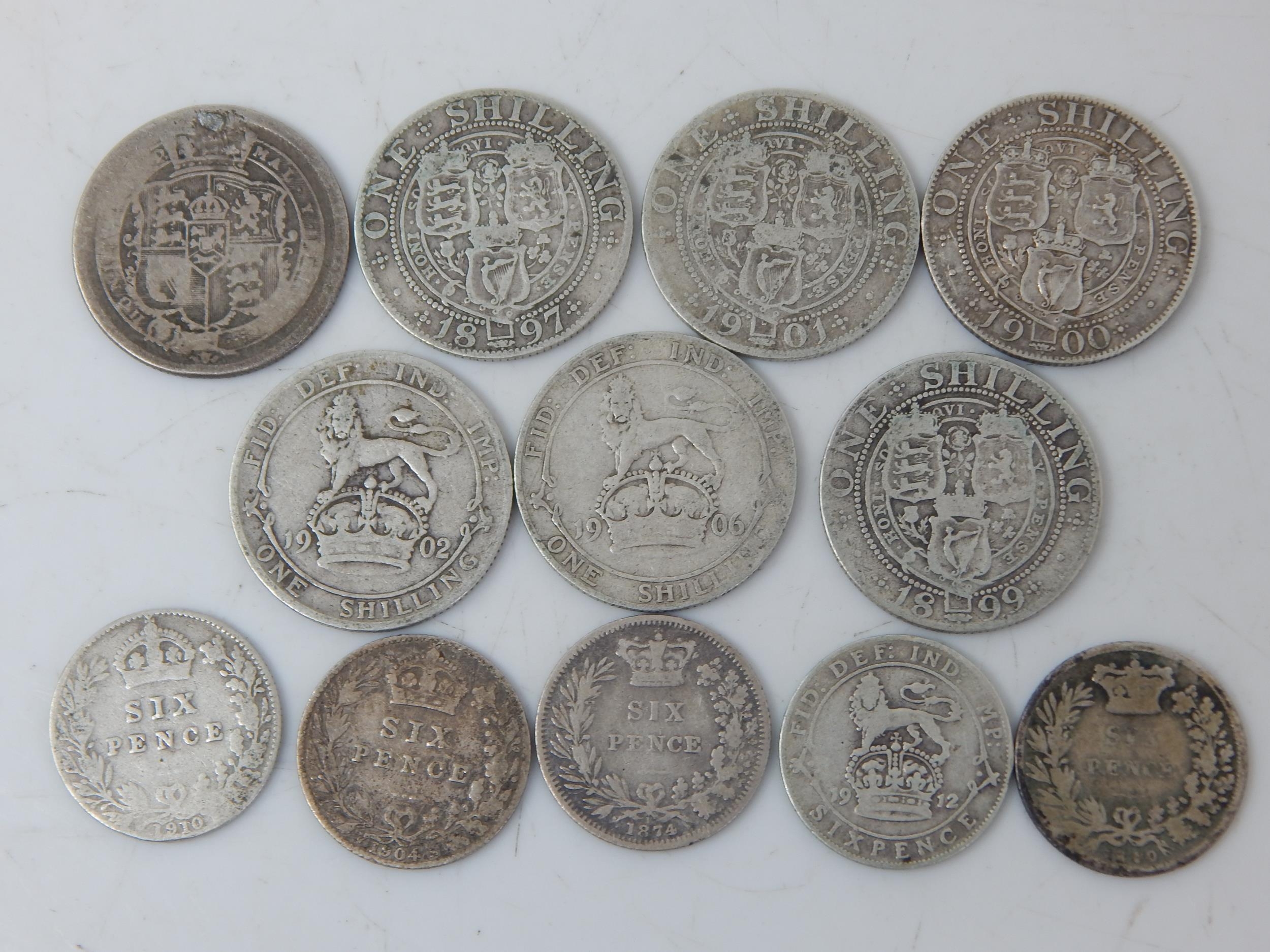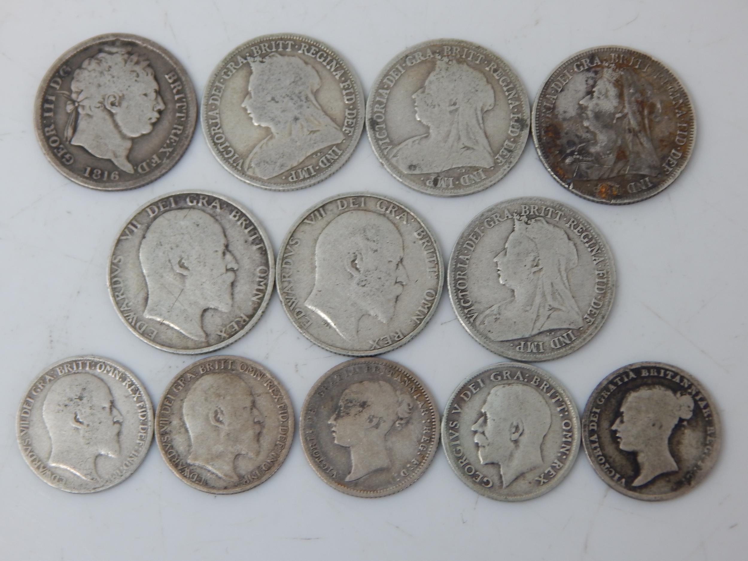 George III Silver Shilling 1816, Victoria Veil Head Shillings 1897, 1899, 1900, 1901; Edward VII Silver Shillings 1902, 1906; Victoria Young Head Sixpences 1840, 1874; Edward V11 Silver Sixpences 1904, 1910; George V Sixpence 1912 (lot)