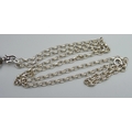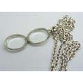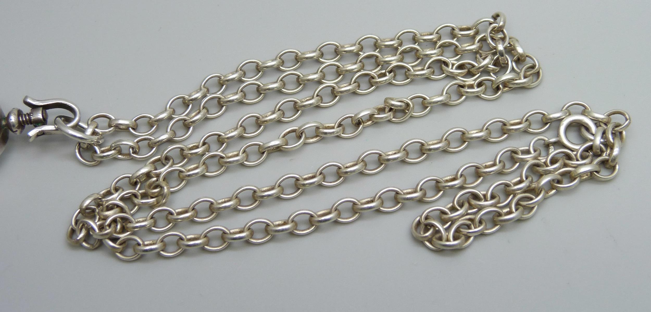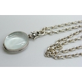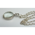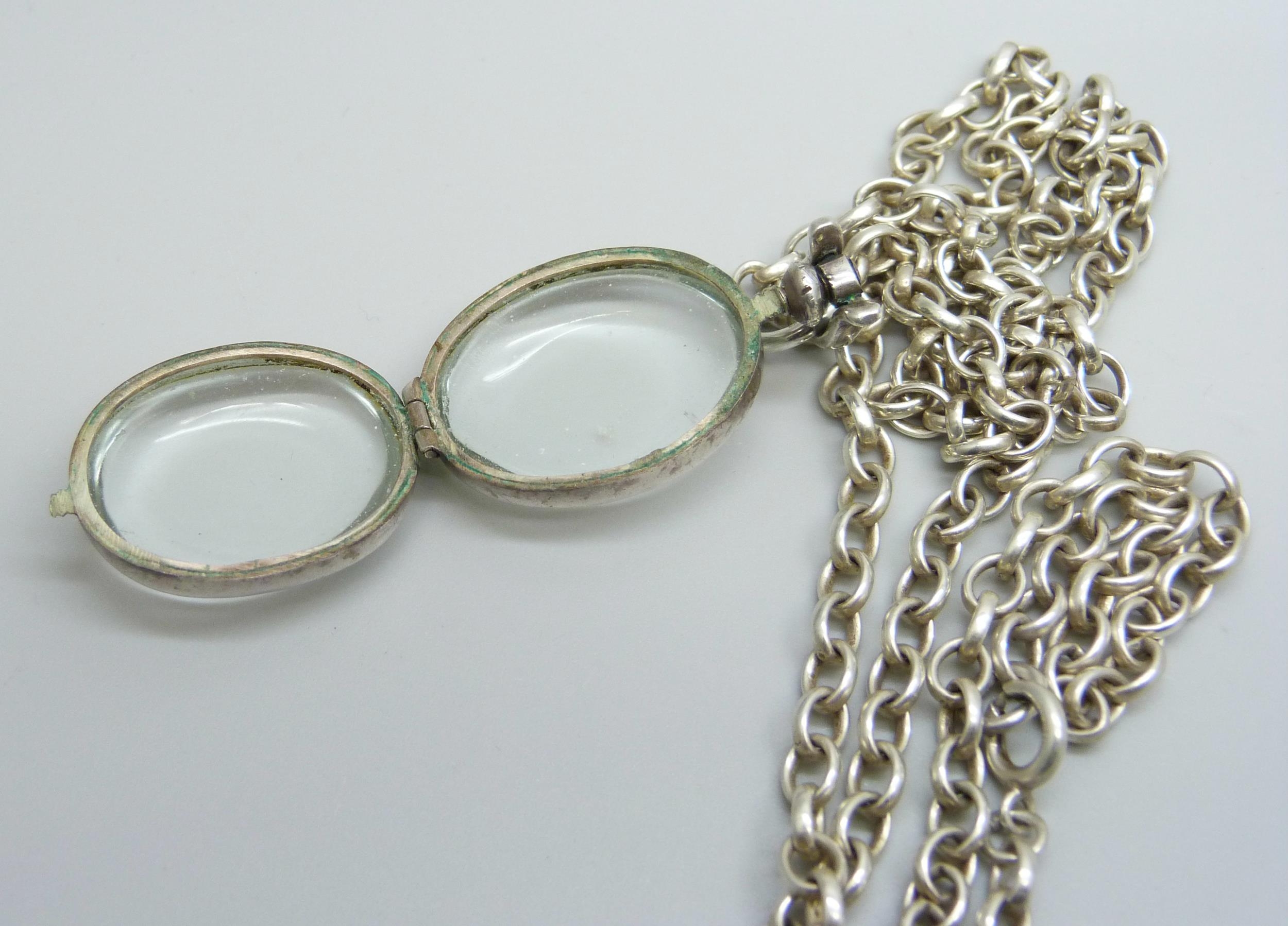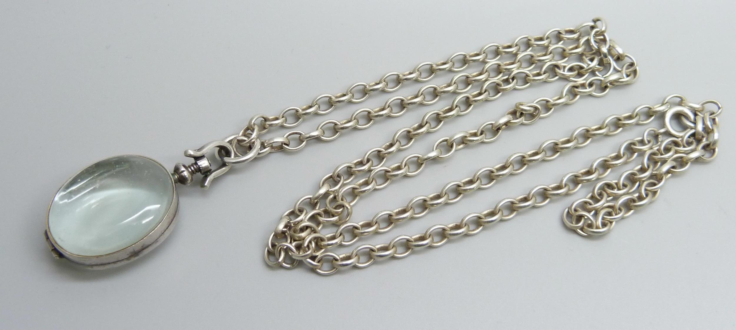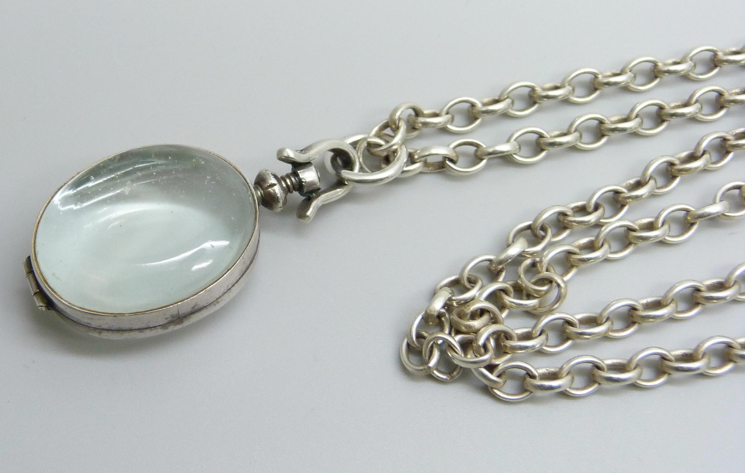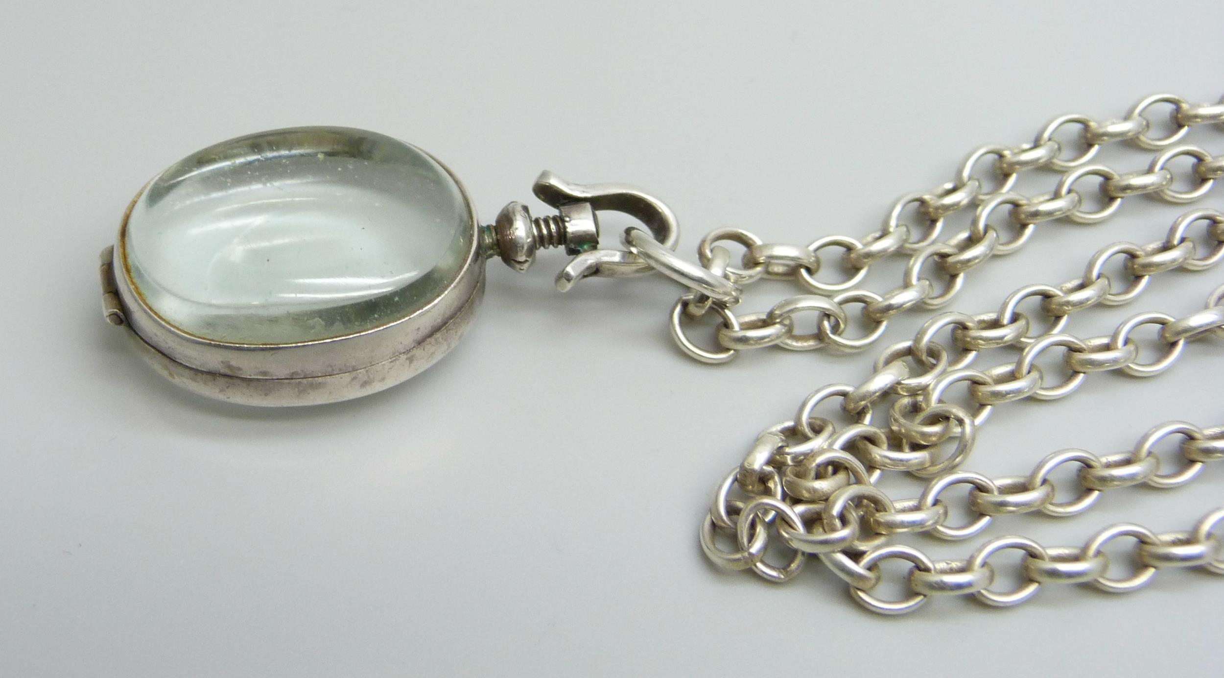 A rock crystal locket pendant on a long silver belcher chain, 45g, 4.5cm including bale, 75cm chain