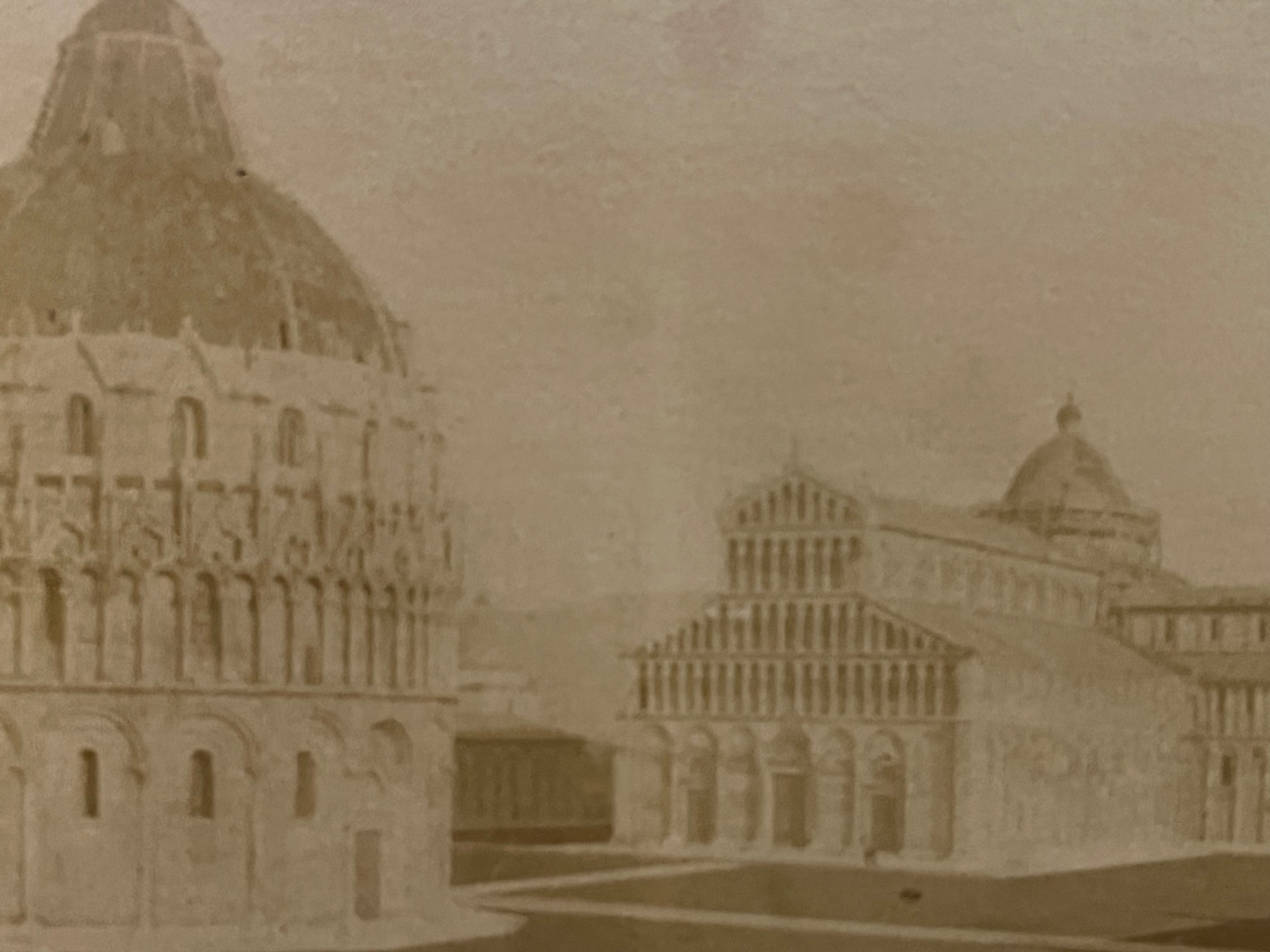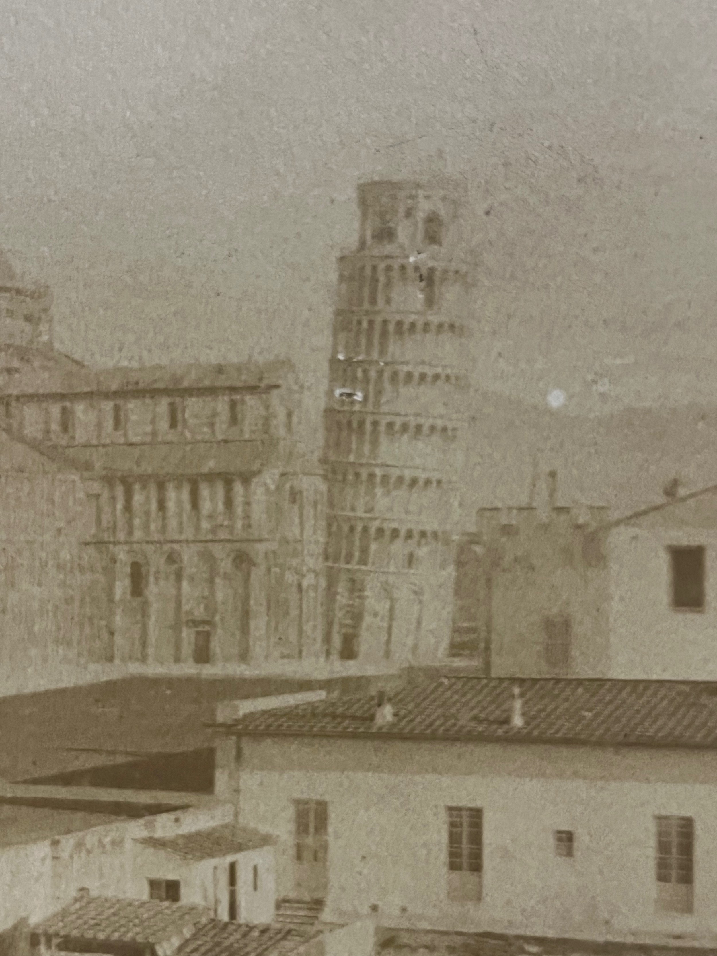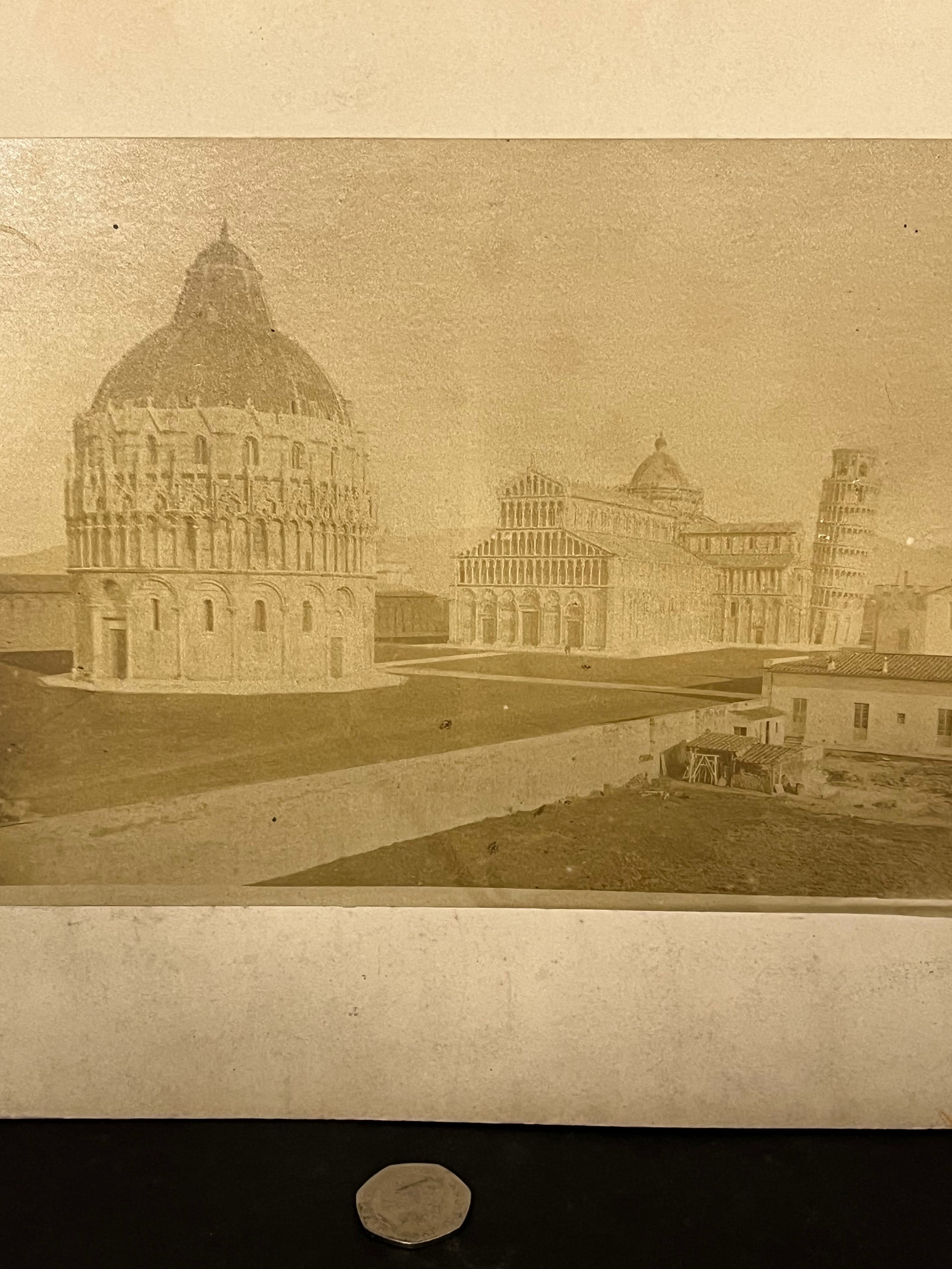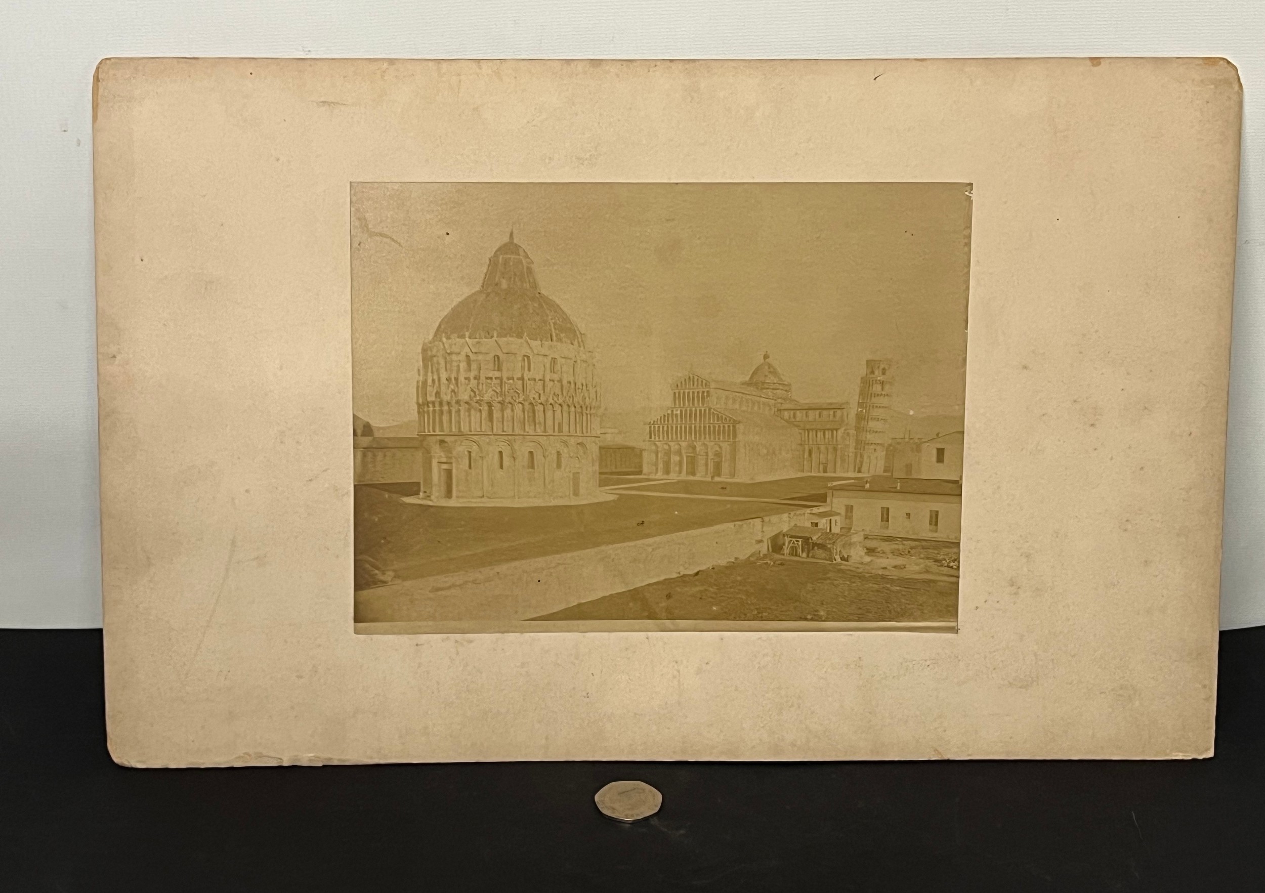 Ephemera, a C19th photographic print of the leaning Bell Tower in Pisa, part of a collection of Grand tour images mounted on board. 46 cm x 29 cm.