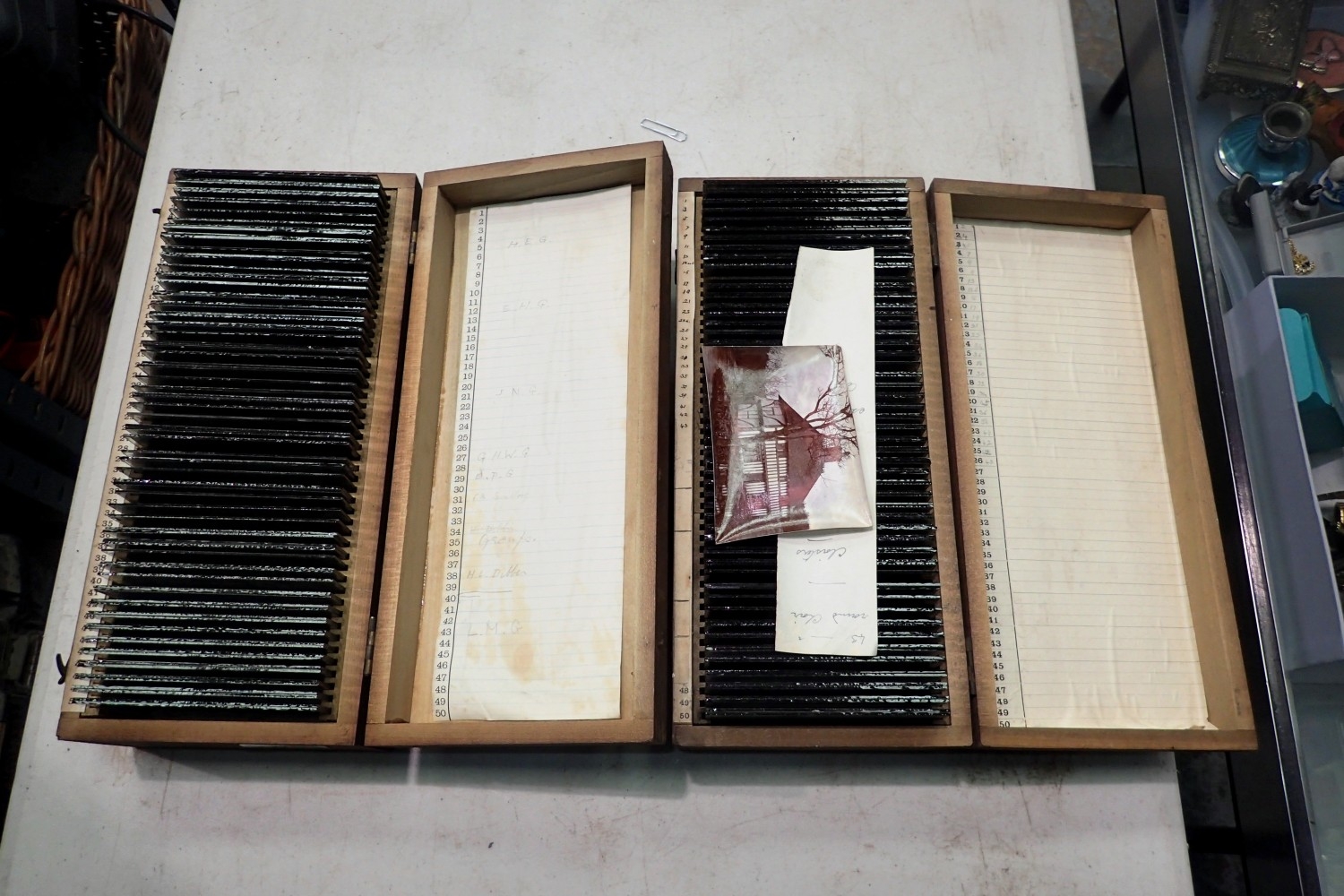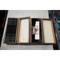 Two wooden boxes containing vintage glass photographic plates, mainly Cambridge and Canterbury. Not available for in-house P&P