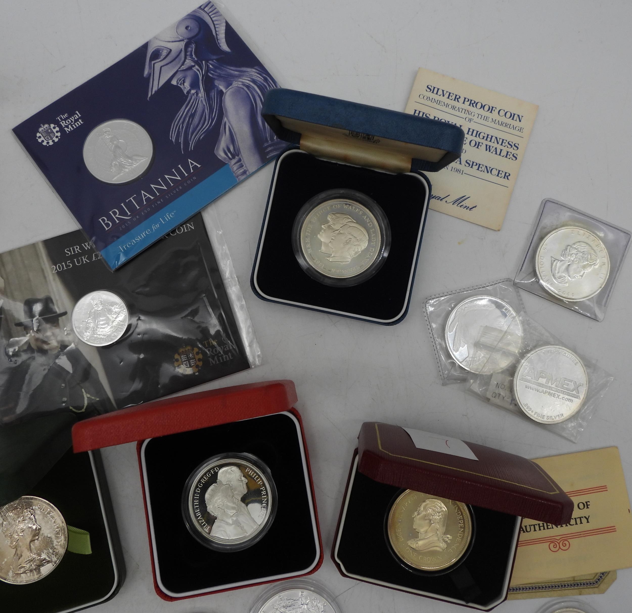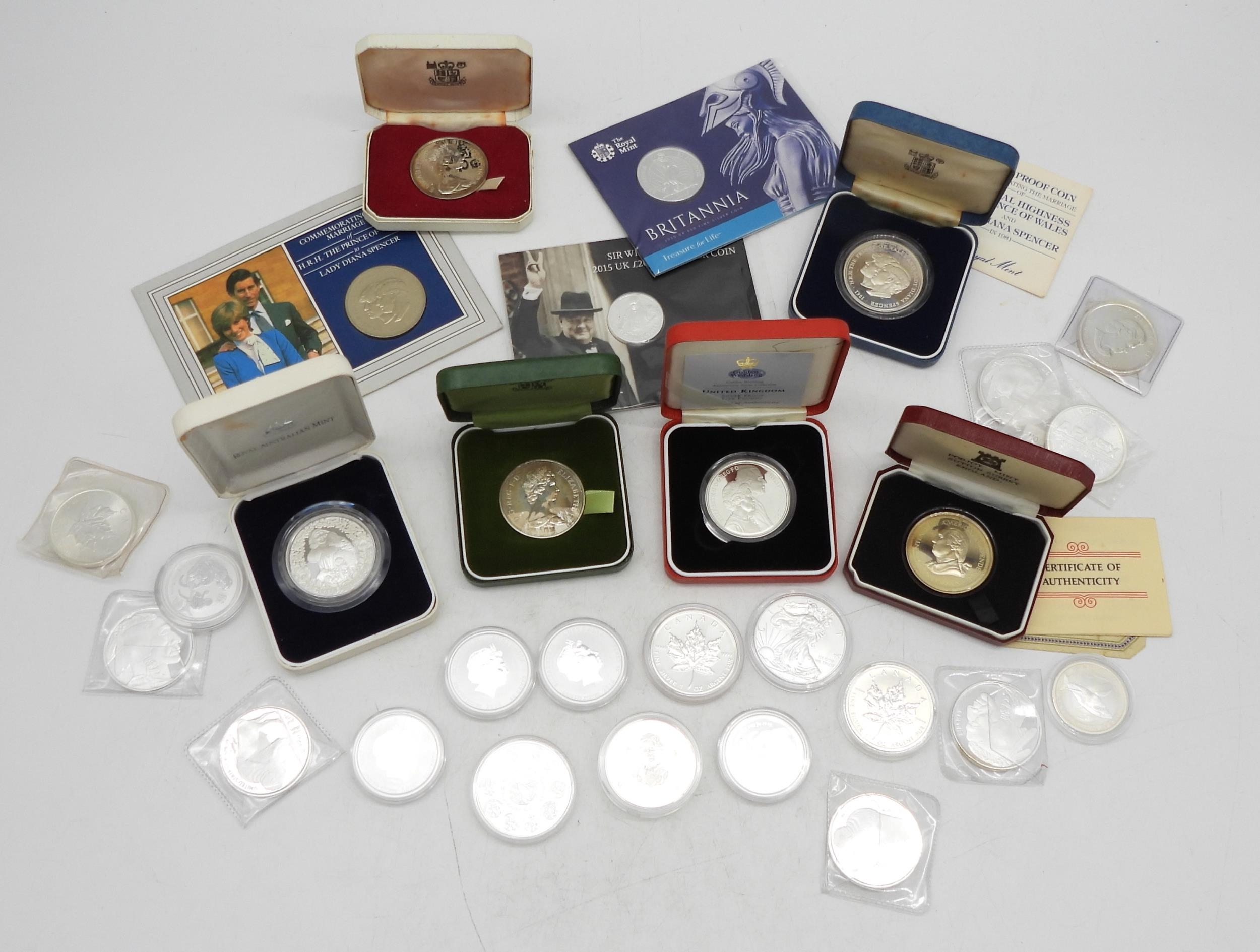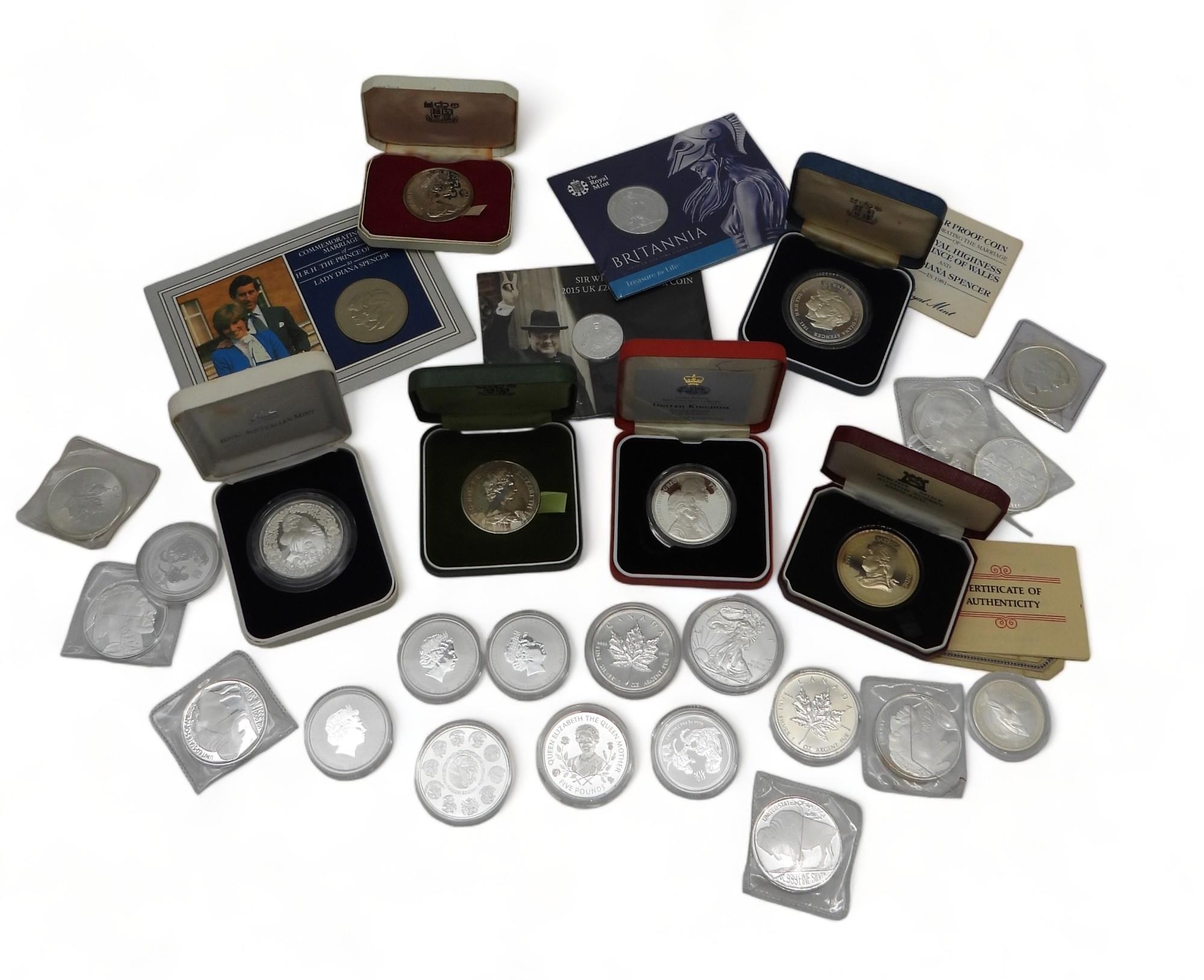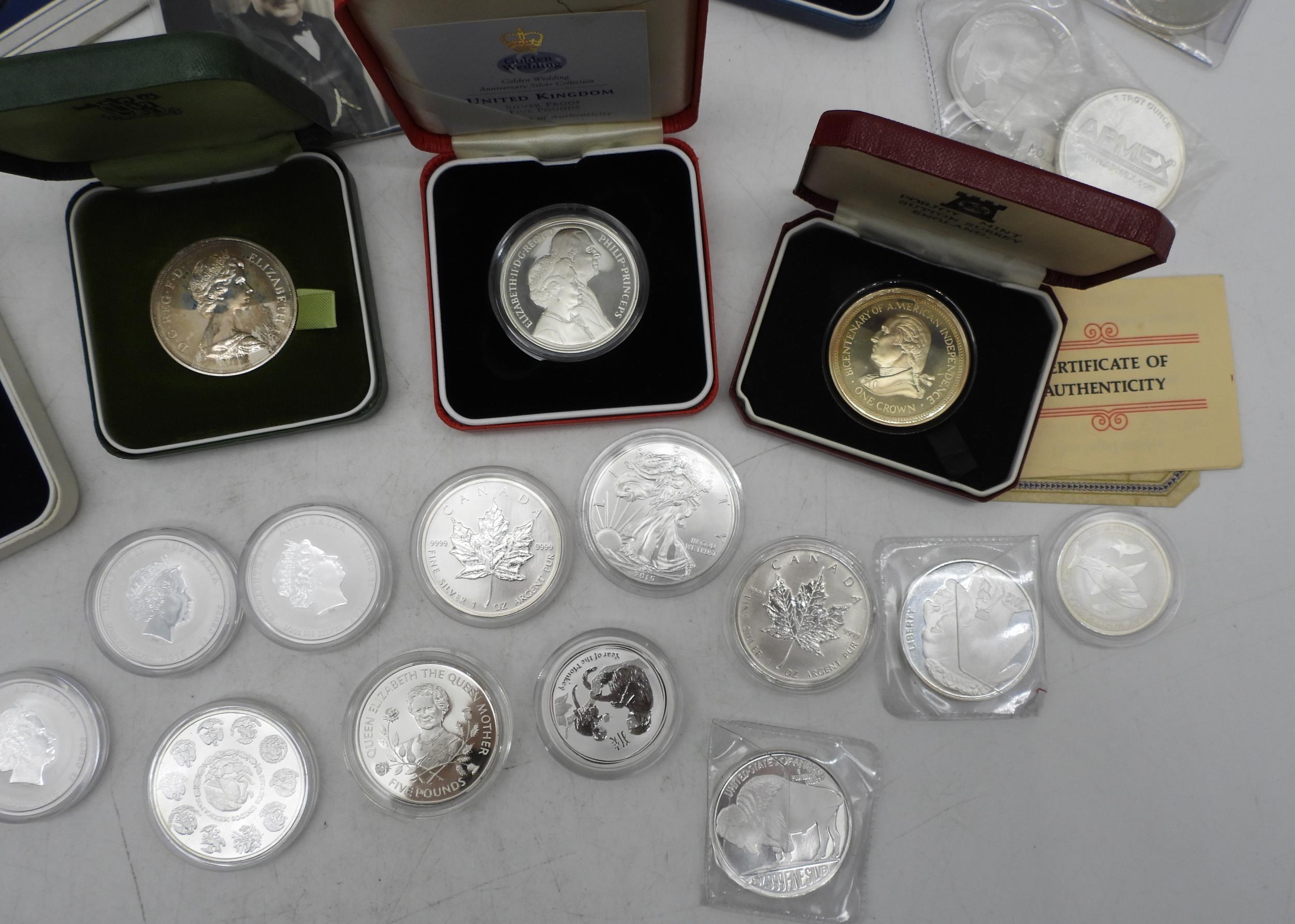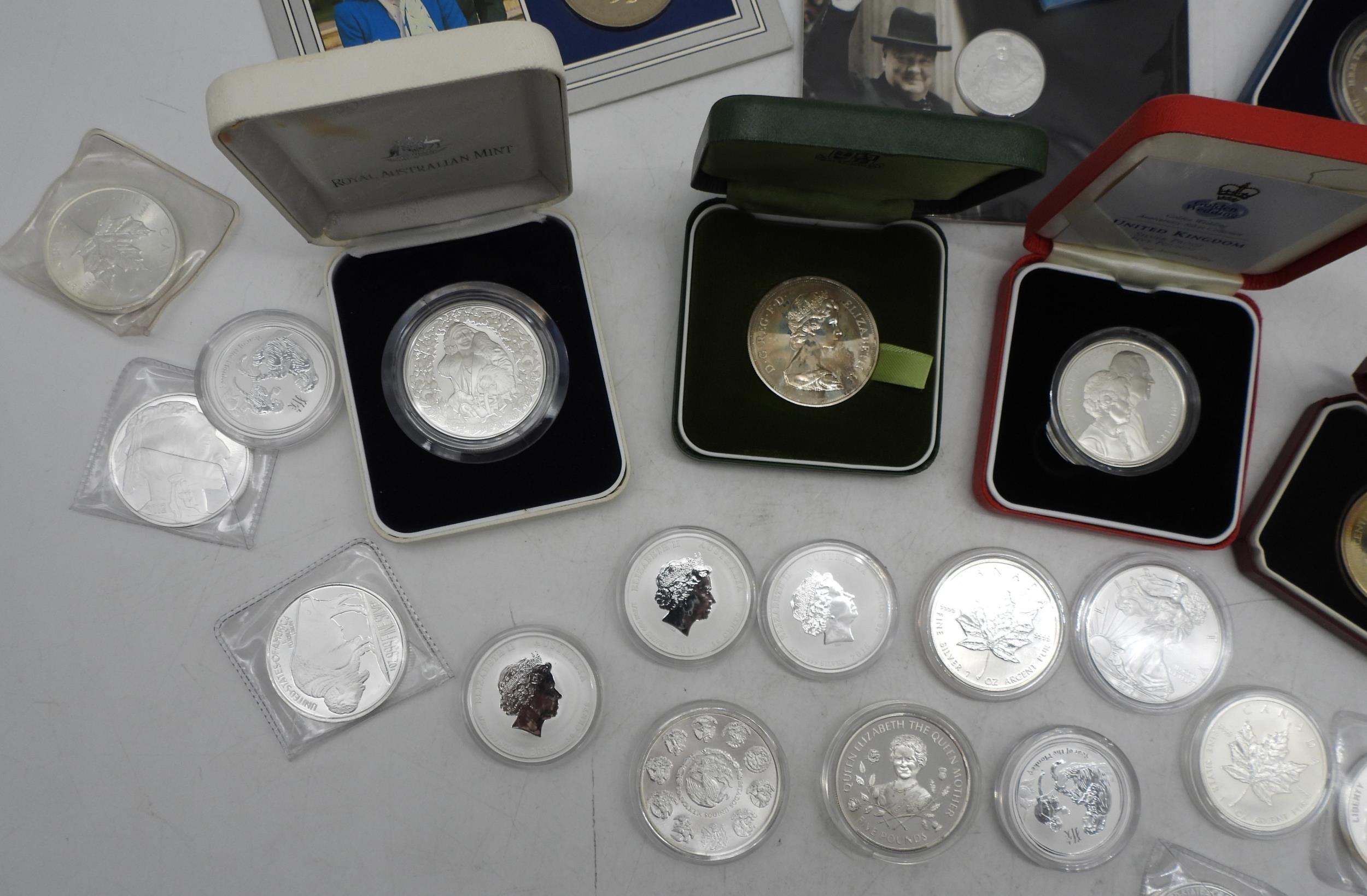 A lot of commemorative silver coins to include U.S. One Dollar and Chinese Zodiac examples approximately 700 grams (28)