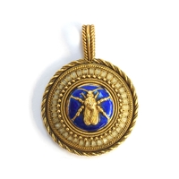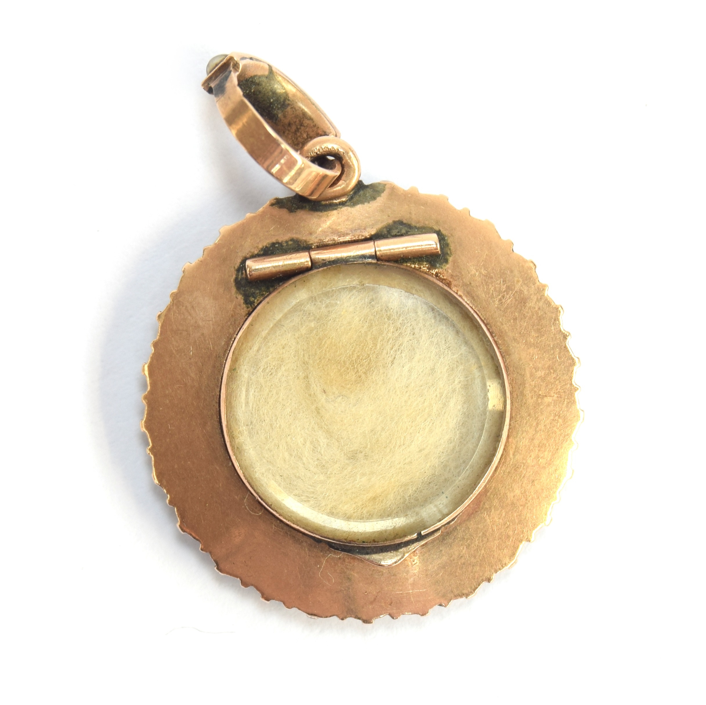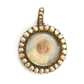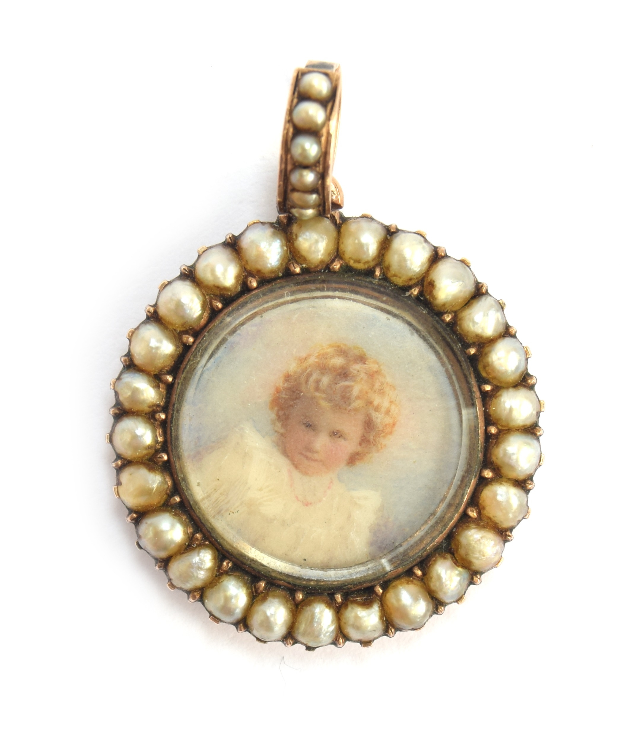 A Victorian gold and pearl locket, with a pearl set bail and bevelled glass, 2.2cm diameter, 4.7g gross weight