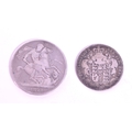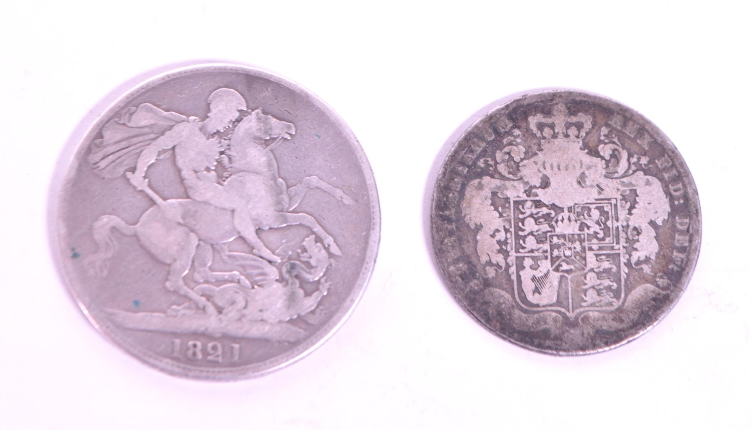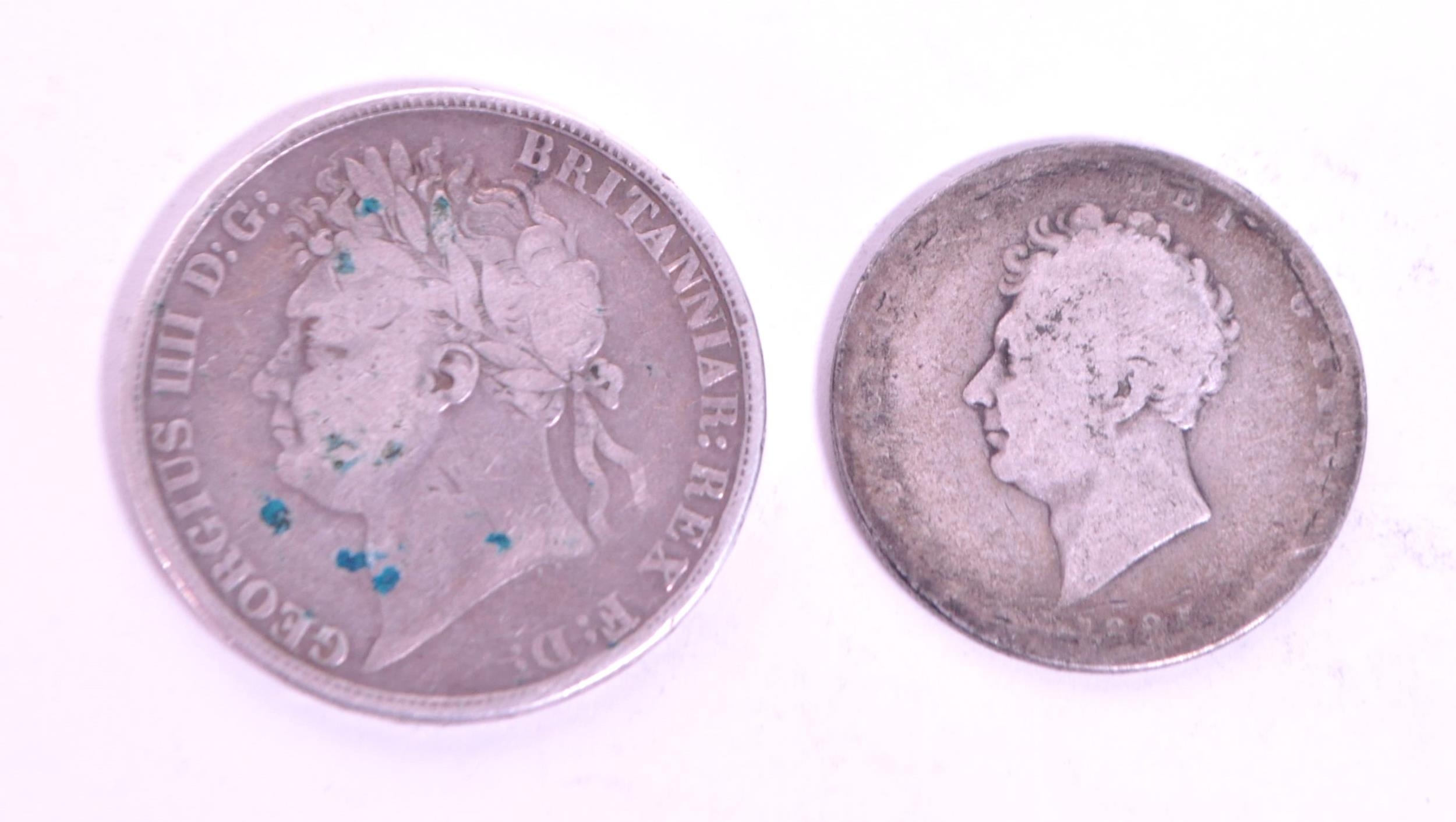 Two 19th century 1820s King George IV circulated silver currency coins. The collection to include an 1821 first portrait King George IV crown coin (weighs approx. 27.06g), and a second portrait half crown (weighs approx. 13.00g).