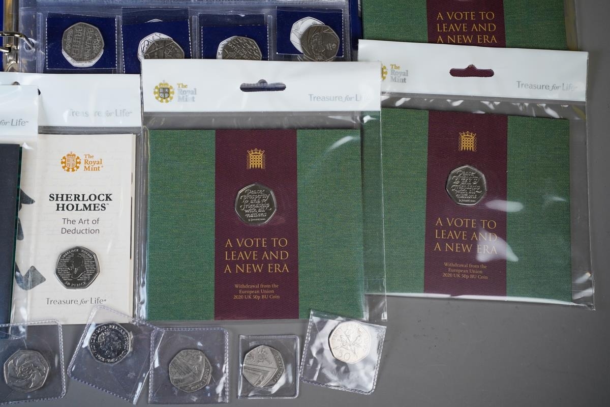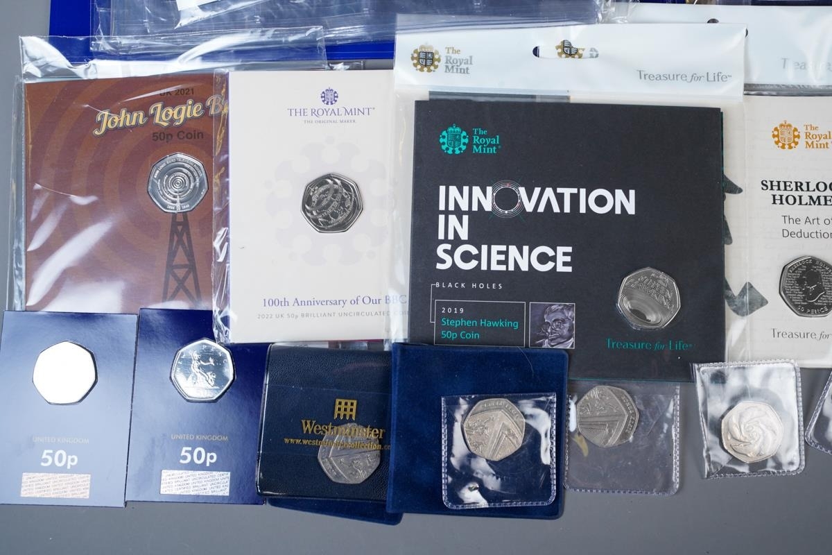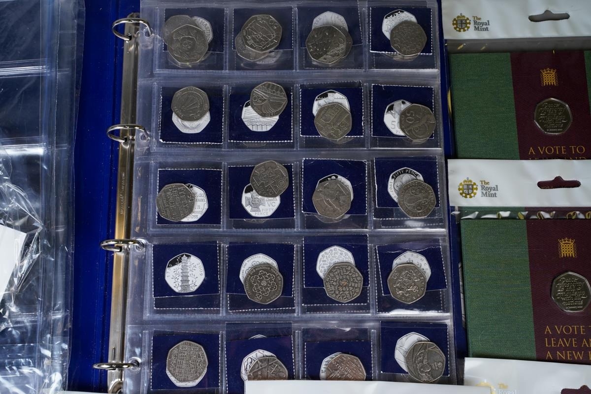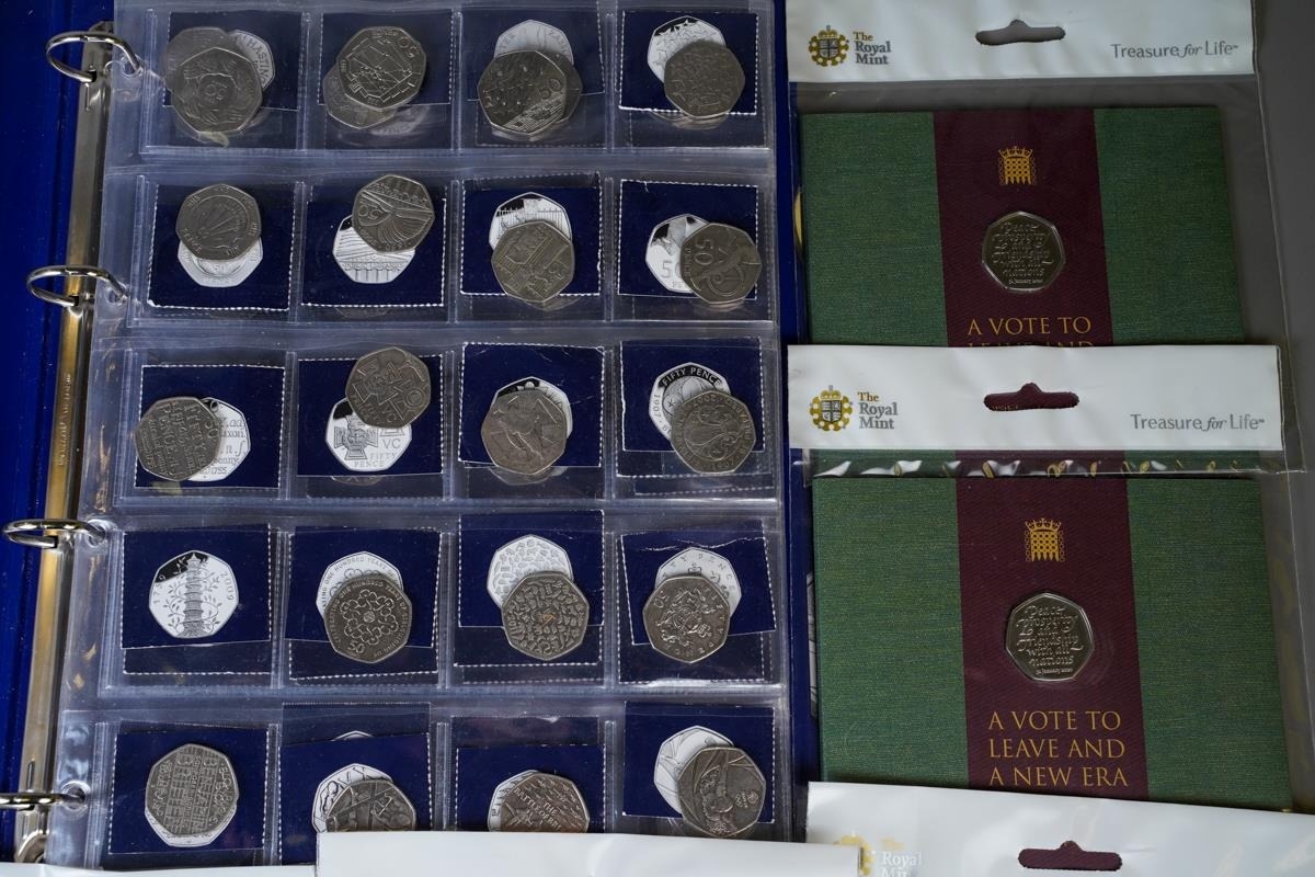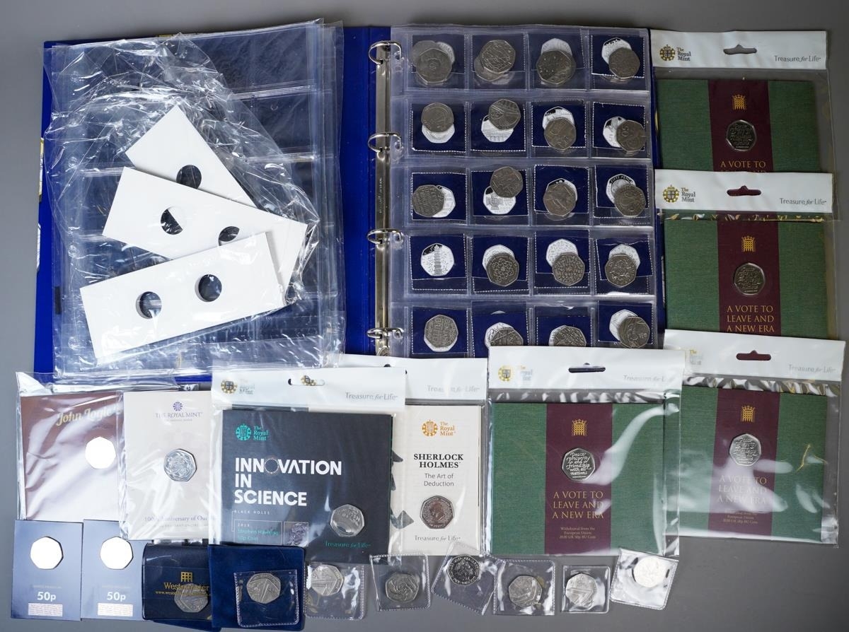 A Coin Checker folder containing approximately seventy legal tender 50p coins, mostly picture backs, a 1992 Britannia 50p and other demonetized 50p coins, seven Royal Mint packs of 50p coins, two others in Coin Checker packs and other loose 50p coins (1 bag)