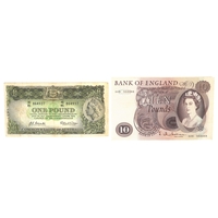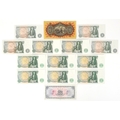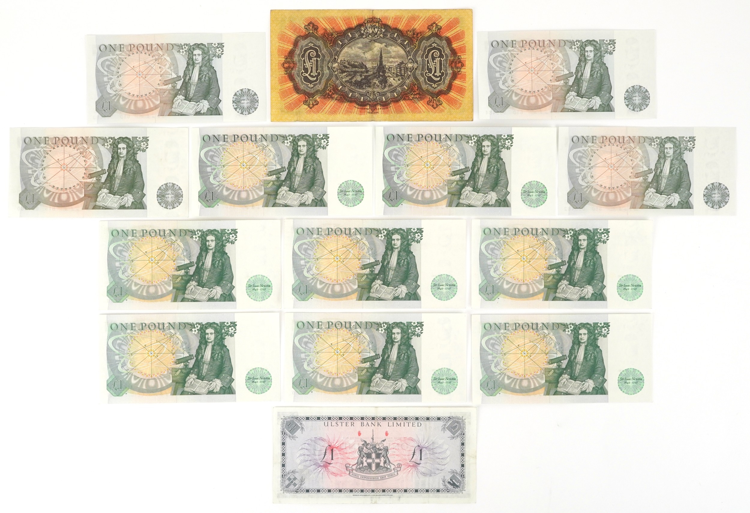Vintage one pound banknotes including The National Bank of Scotland Limited yellow and orange one pound note, registered office Edinburgh, dated 1st May 1958, General Manager David Alexander, prefix and serial number B/W 070-832, an Ulster Bank Limited one pound note dated 4th October 1966, having images including The Giant's Causeway in bottom left hand corner, prefix and serial number 1978296, twelve 1970s and 80s English Bank of England one pound notes, various prefixes and Chief Cashiers including J B Page and DHF Somerset, prefixes and serial numbers including CZ17 716836-CZ17 716838, CZ17 716779-CZ17 716781, 65D 659482-65D 659484 , AR61 938121, AR61 938123 and H15 894260, these notes are in uncirculated condition, The National Bank of Scotland one pound note is in average condition.