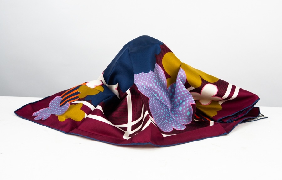 6 FISBA-STOFFELS PURE SILK PRINTED SQUARE SCARVES, mainly abstract patterns, signed and labelled, mostly 30" square (76cm); and 2 OTHERS, SMALLER, one striped and one floral (8)