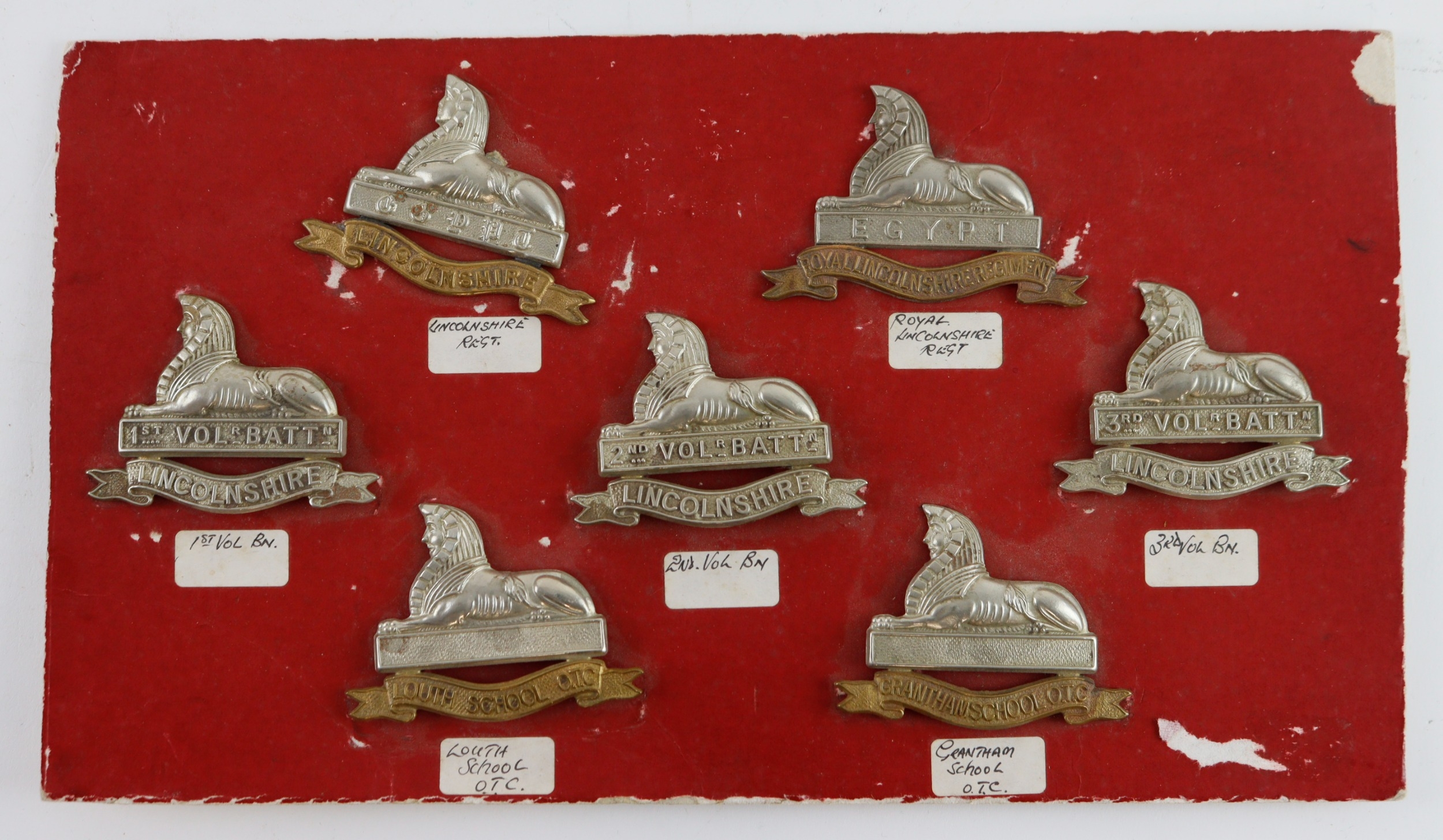 Badges collection of seven Lincolnshire Regiment hat badges including various Volunteer Battalions compiled by 23139466 Sgt. W J G Bower 4th Royal Lincolnshire Regiment.