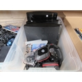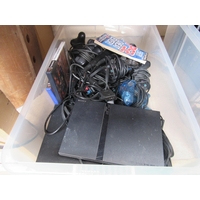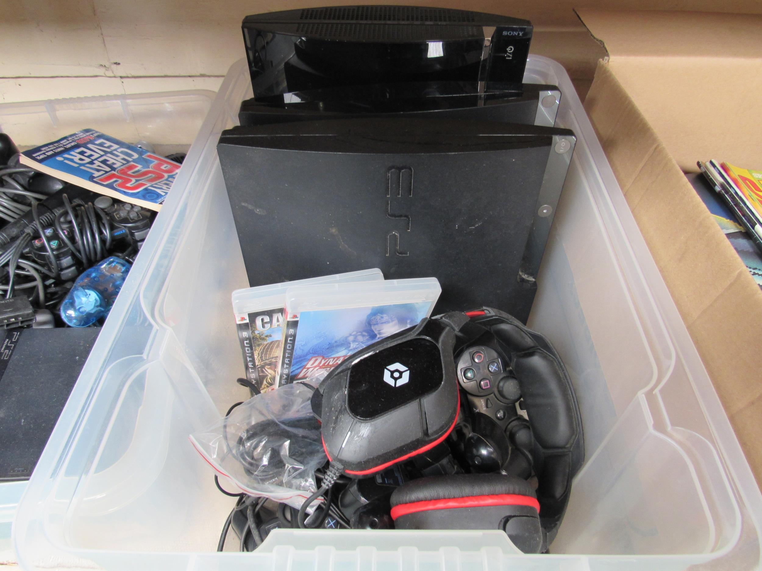 Three Sony PlayStation PS3 computer game consoles with eight controllers, two games and a pair of gaming headphones