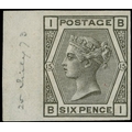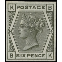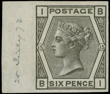 1876 6d Grey Pl.15. Very fine unused o.g. imperforate left hand marginal imprimatur lettered BI. Dated in margin ’25 July 1873’. Scarce one of only 22 possible examples in private hands. SG147. Cat. £2750.