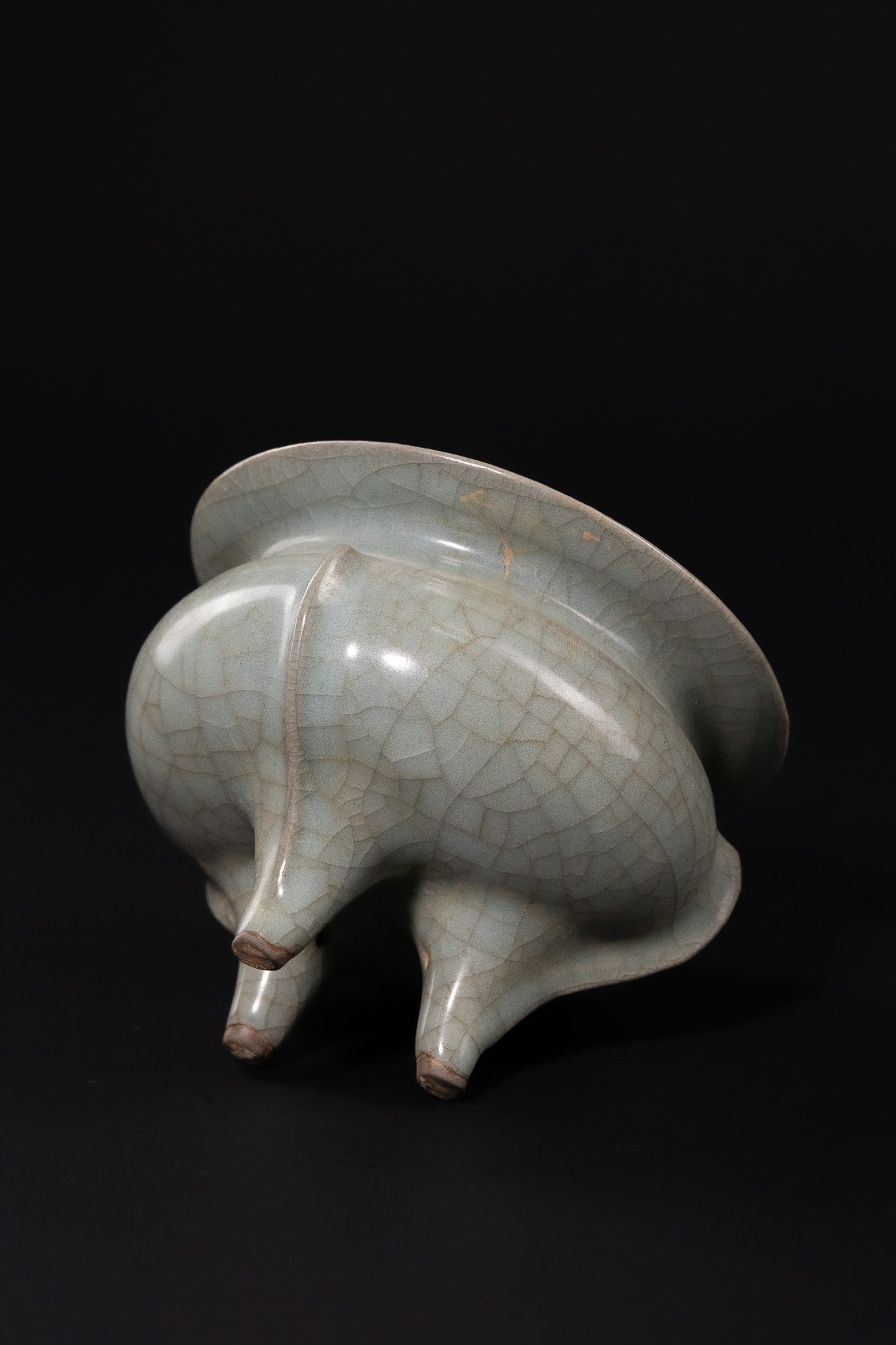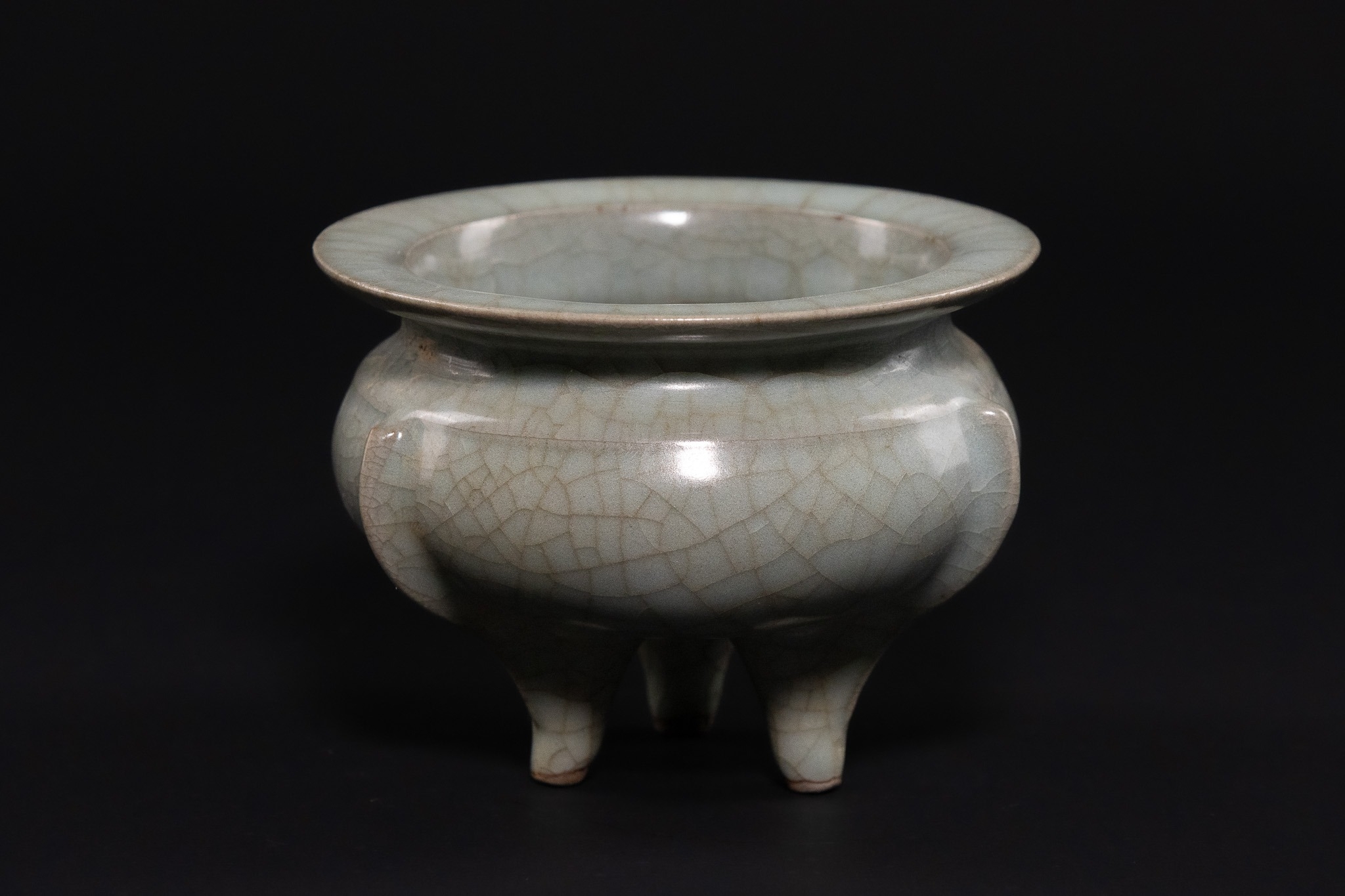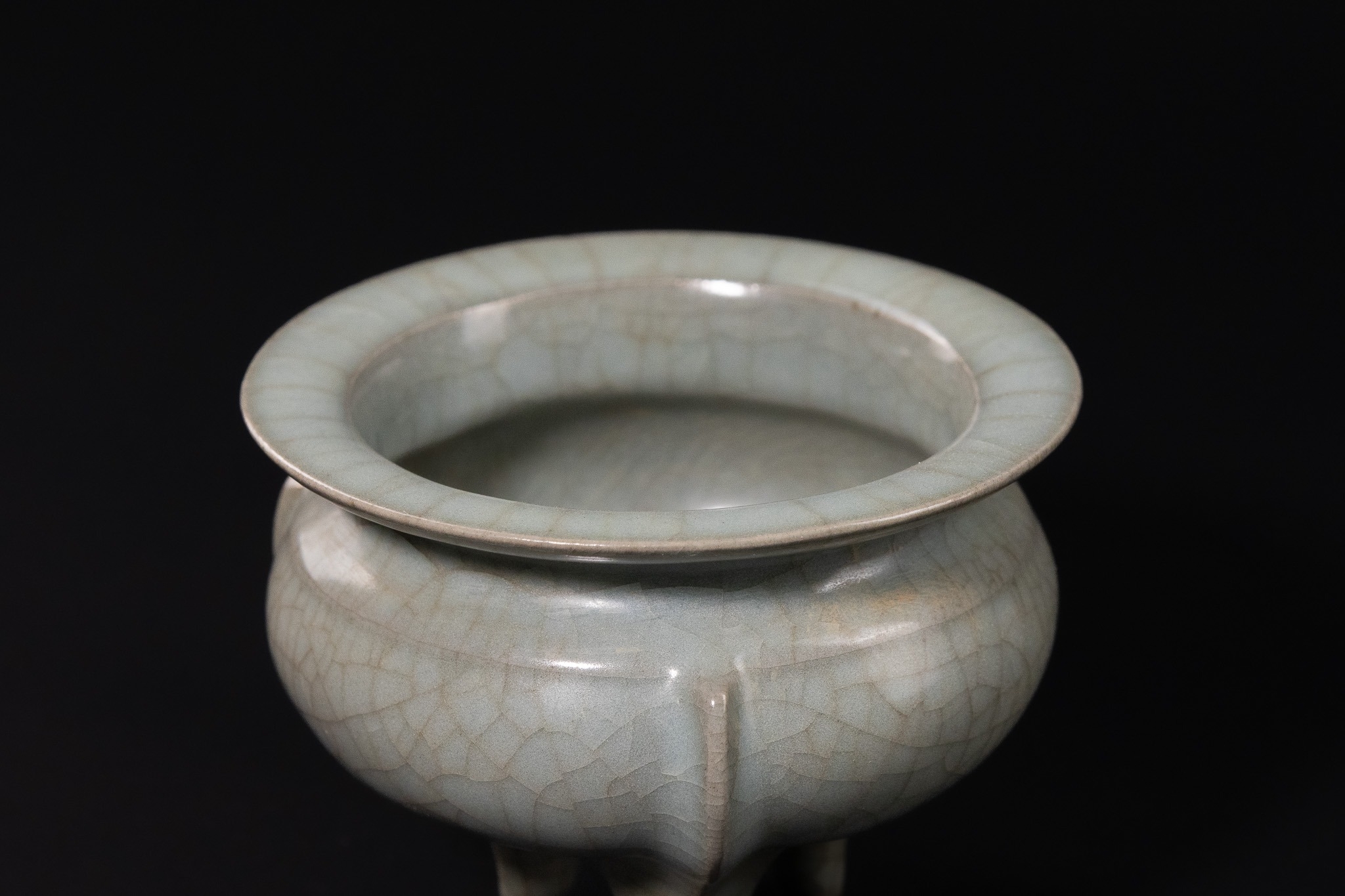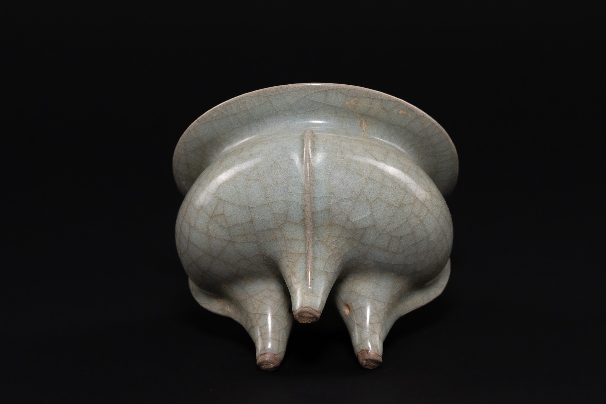 The vessel is expertly modelled after the archaic bronze li form, featuring a compressed globular body divided into three distinct lobes. Each lobe is accented with a raised vertical rib that extends from the shoulder down to the tapering conical feet. The short neck rises to a wide, flat, everted rim with a subtly upturned lip. The censer is covered in a thick, unctuous, pale bluish-green glaze of Longquan type, which is suffused with a network of ice-crackle patterns in varying tones of charcoal and amber. This aesthetic seeks to replicate the prestigious official Guan and Ge wares of the Southern Song court. The glaze stops cleanly just above the tips of the feet, revealing the characteristic dark-brown, iron-coloured stoneware body.