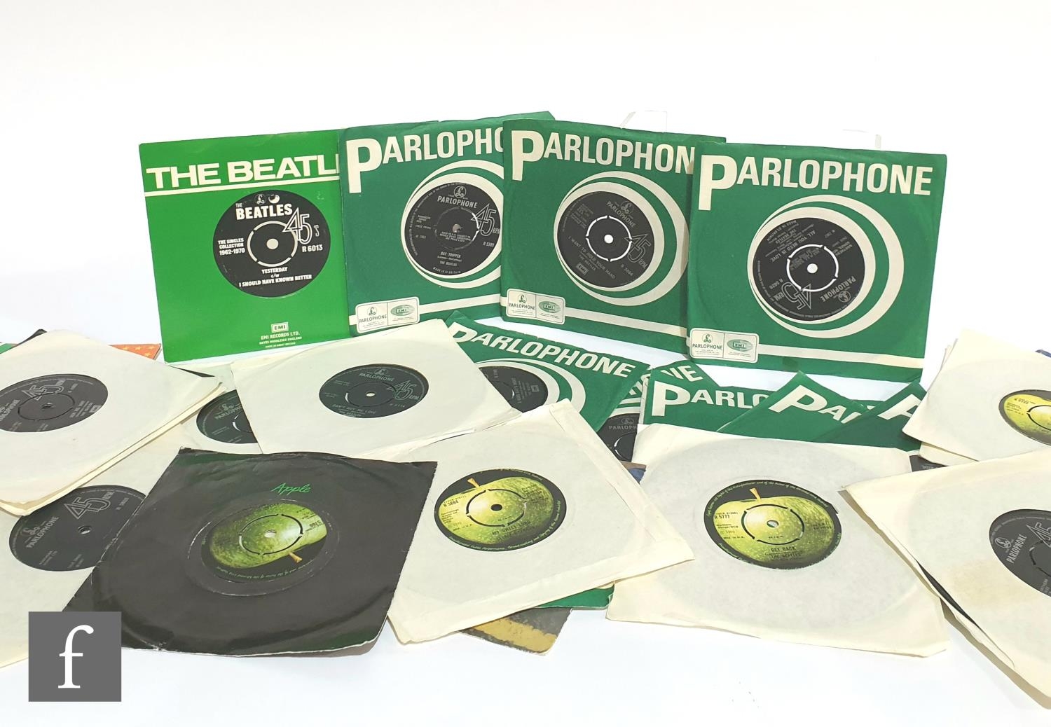 A collection of Beatles 7 inch singles, mostly later issues, including You Know My Name, Lady Madonna, Paperback Writer, Hey Jude, Help, Penny Lane, I Feel Fine, You Can't Buy Me Love and Get Back. (27)