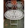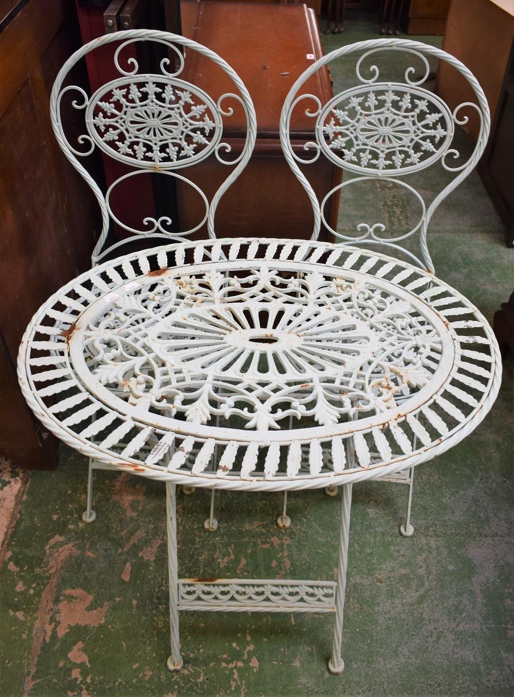 A contemporary cast metal garden table; a pair of conforming chairs (3)