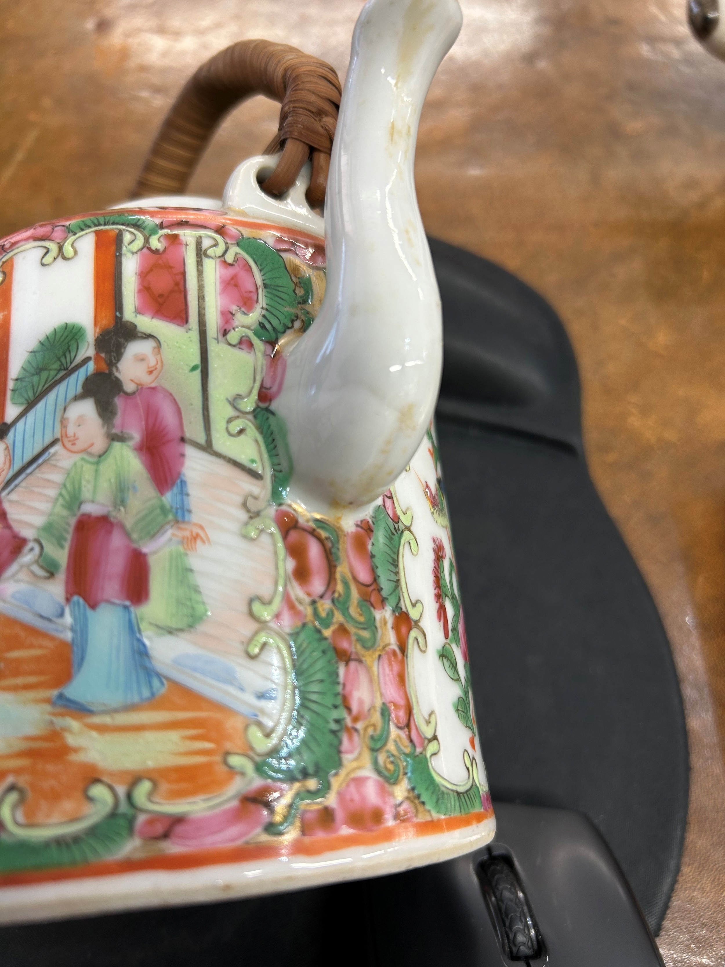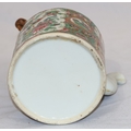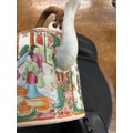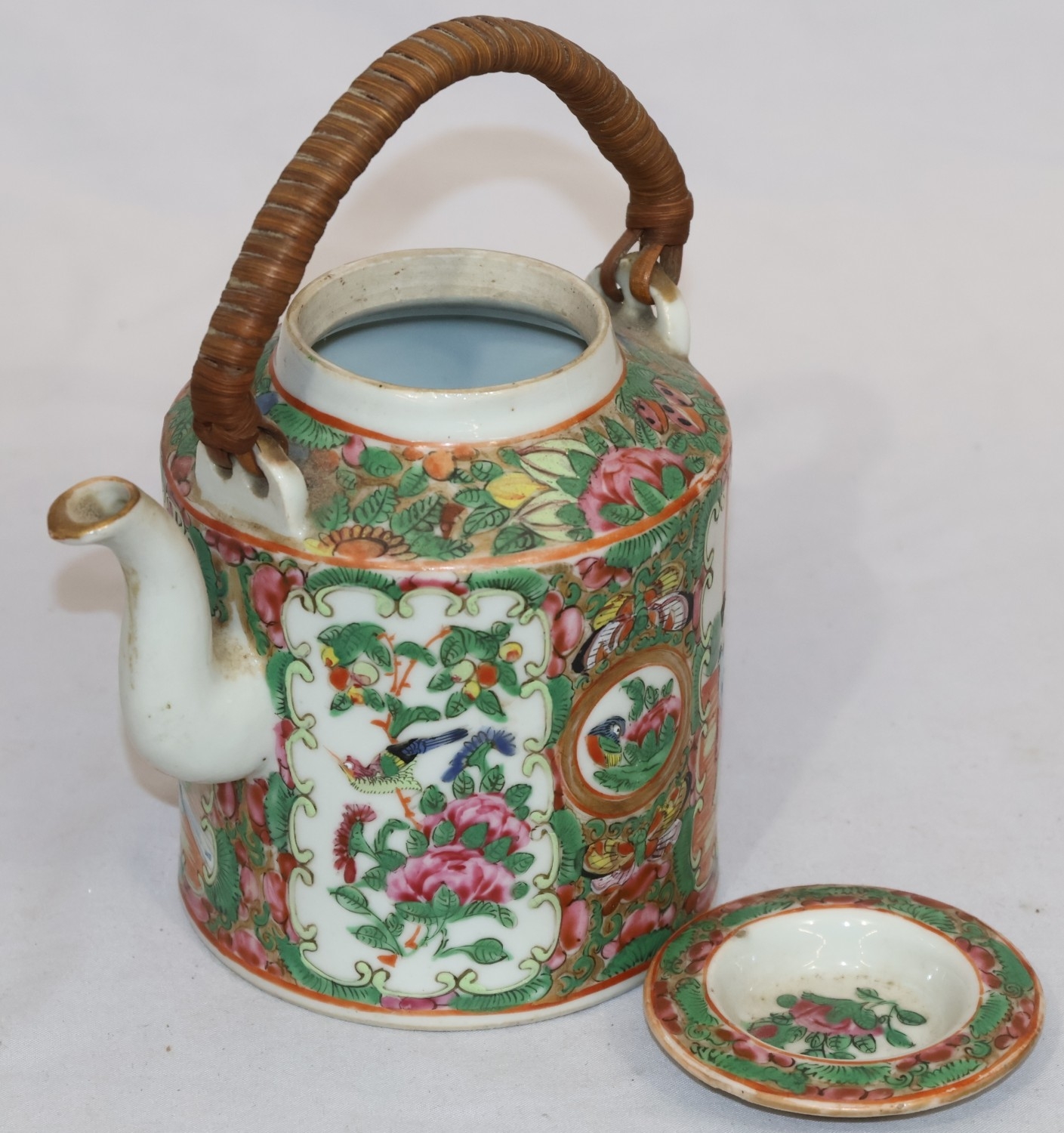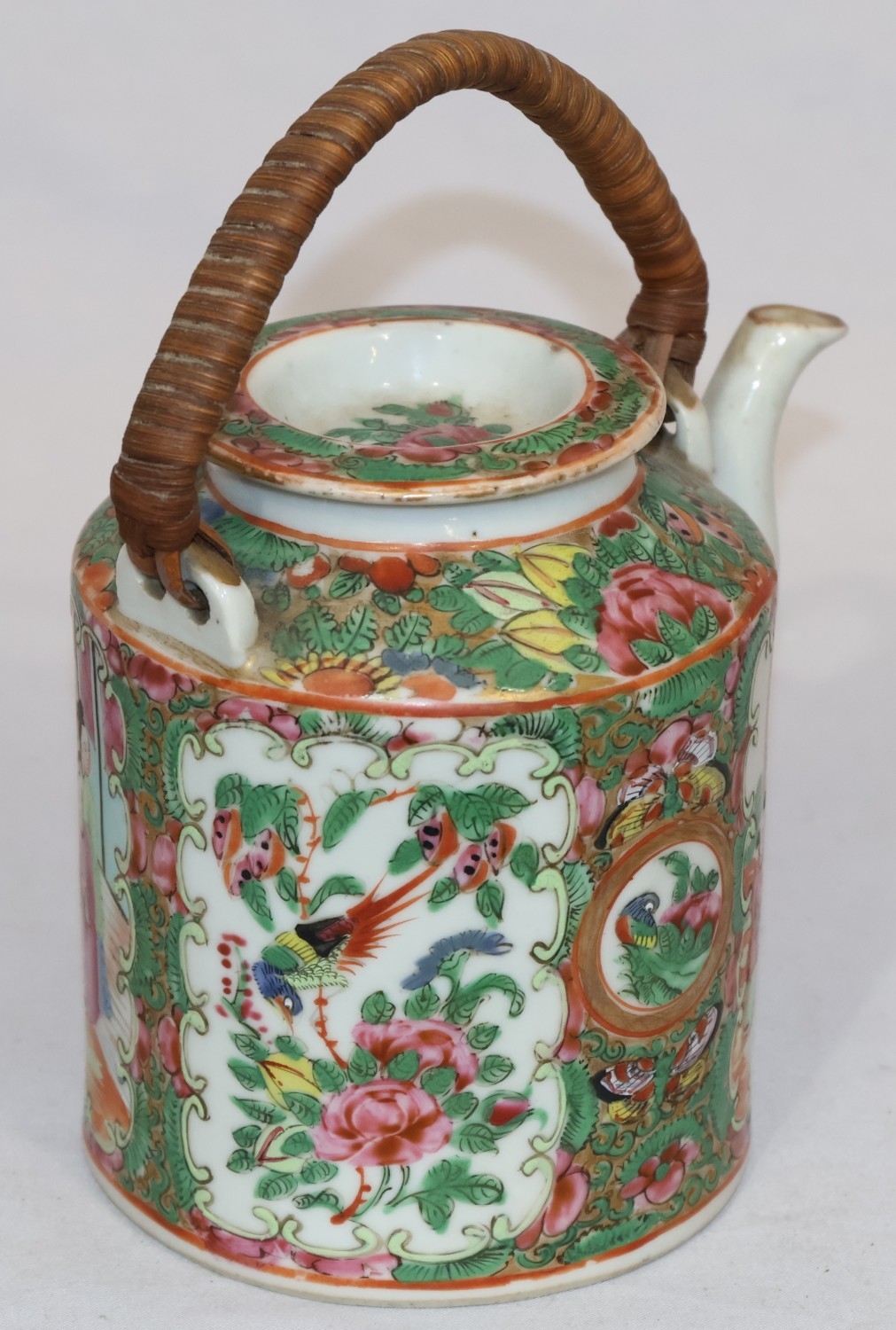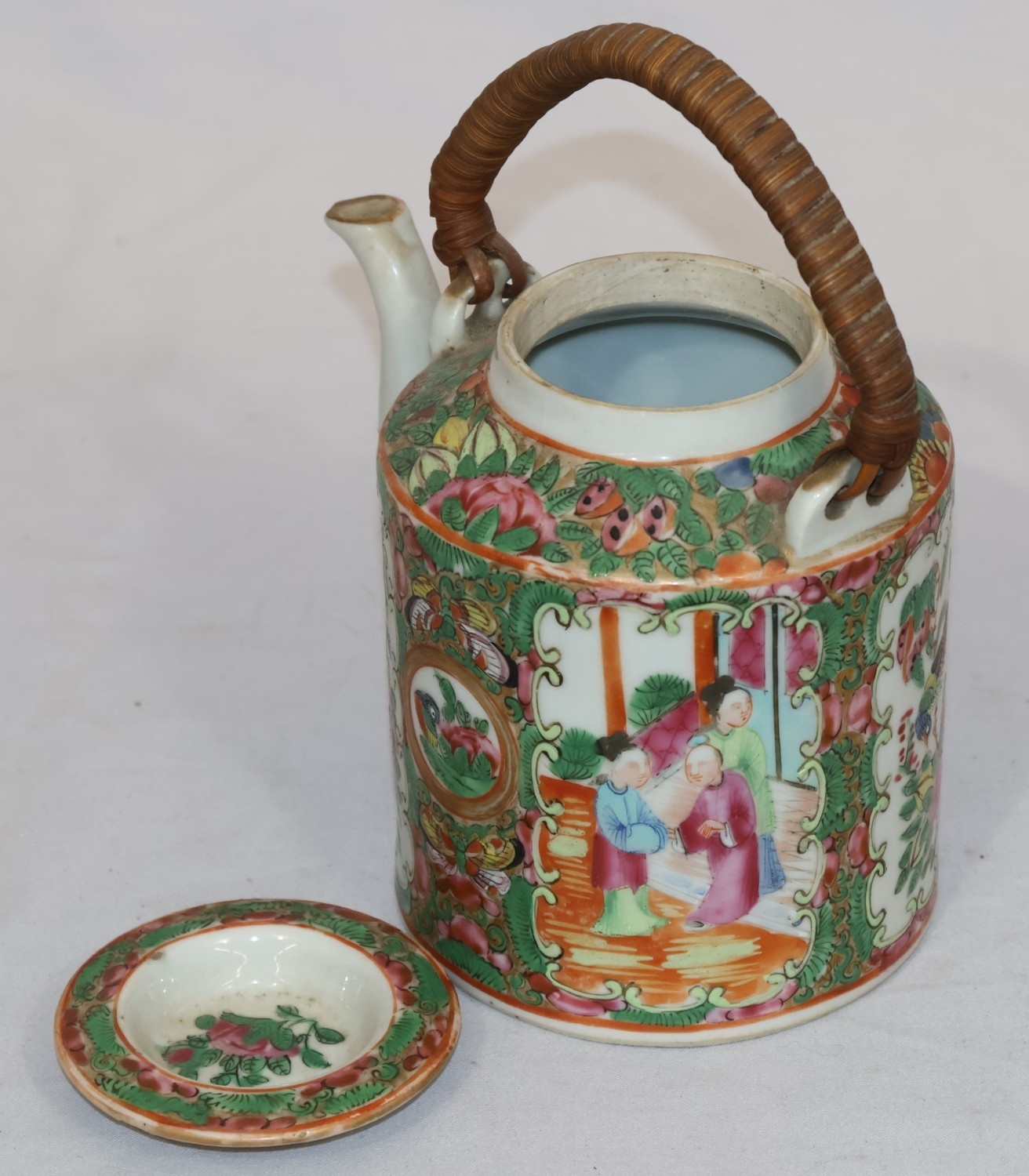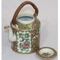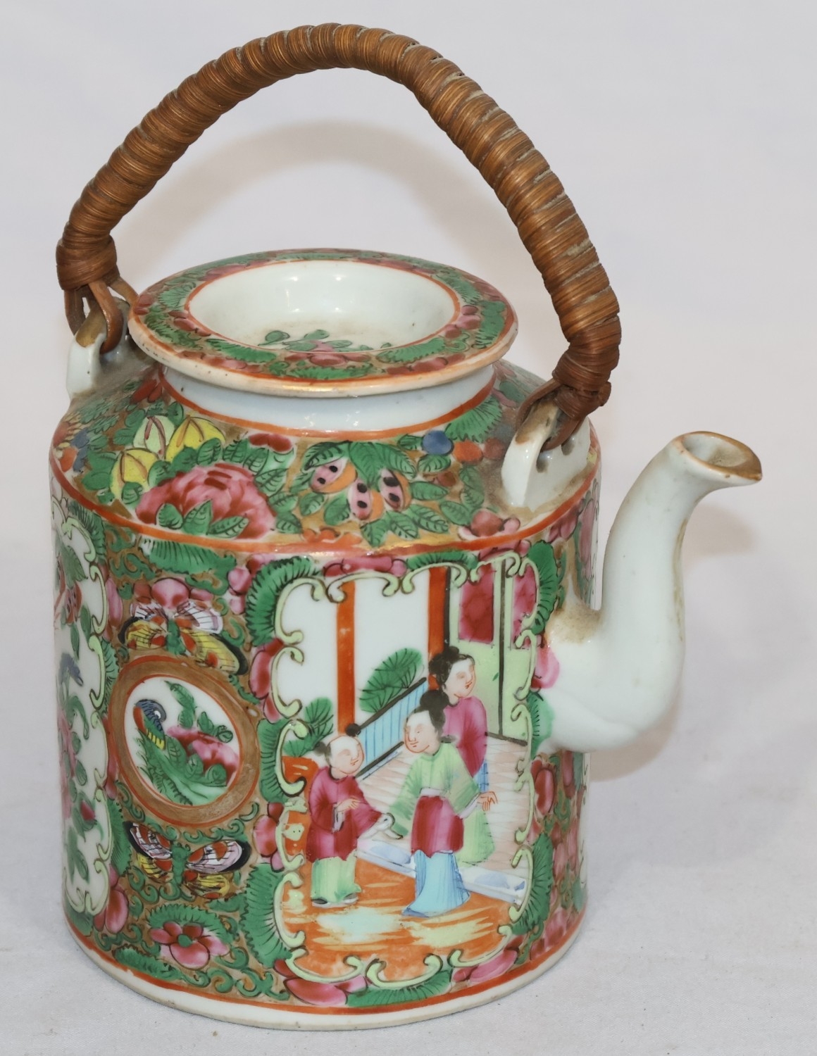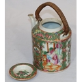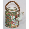 A Cantonese round teapot with cover, wicker overhead handle, allover figure, bird, butterfly, floral and leaf decoration, 18cm high overall