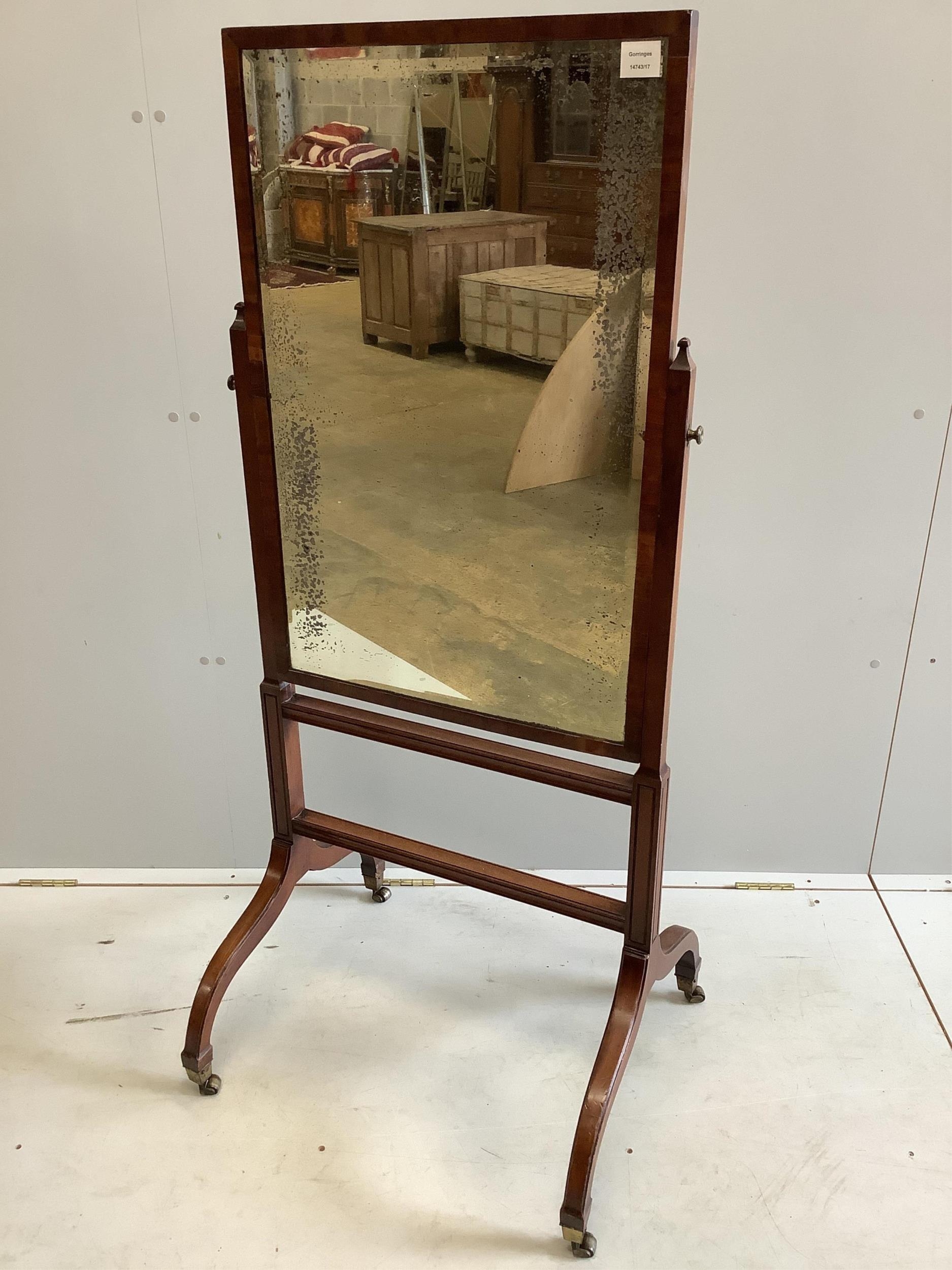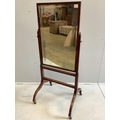 A Sheraton style mahogany cheval mirror, width 62cm, height 143cm. Condition - fair