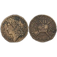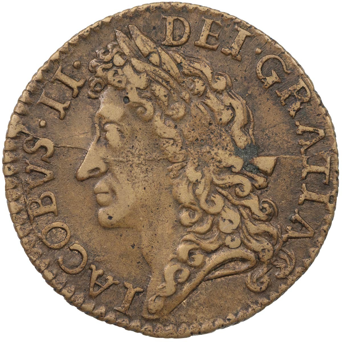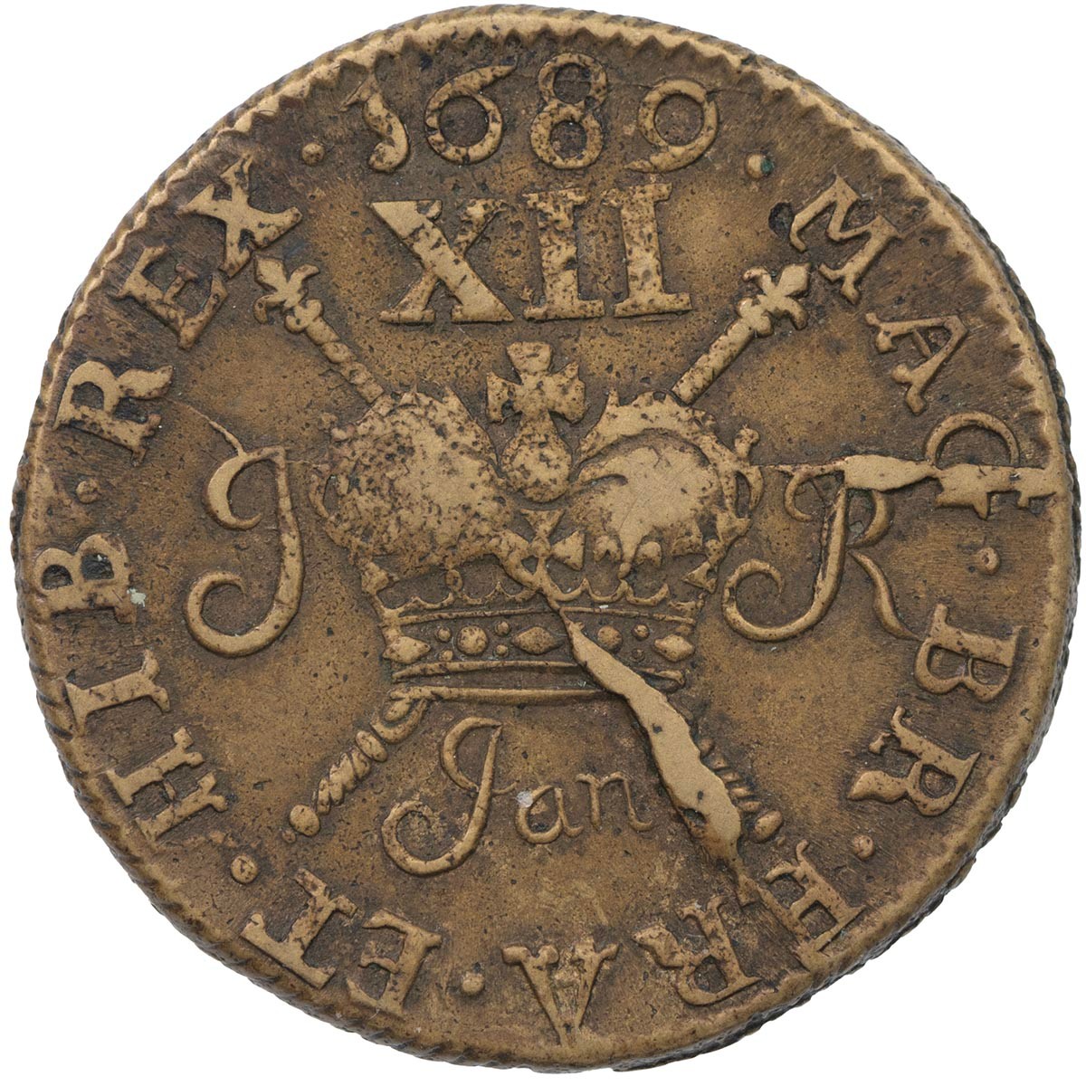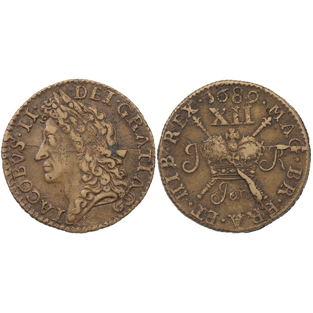 Ireland, James II Gunmoney Shilling, large size, January 1689 (S 6581G), 'Jan', 6.02g, good Fine with extra metal on the reverse.