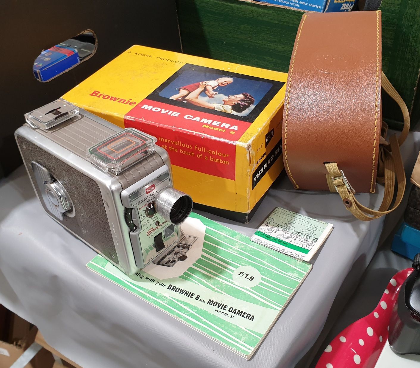 A Kodak Brownie 8mm movie camera with original box and instructions.