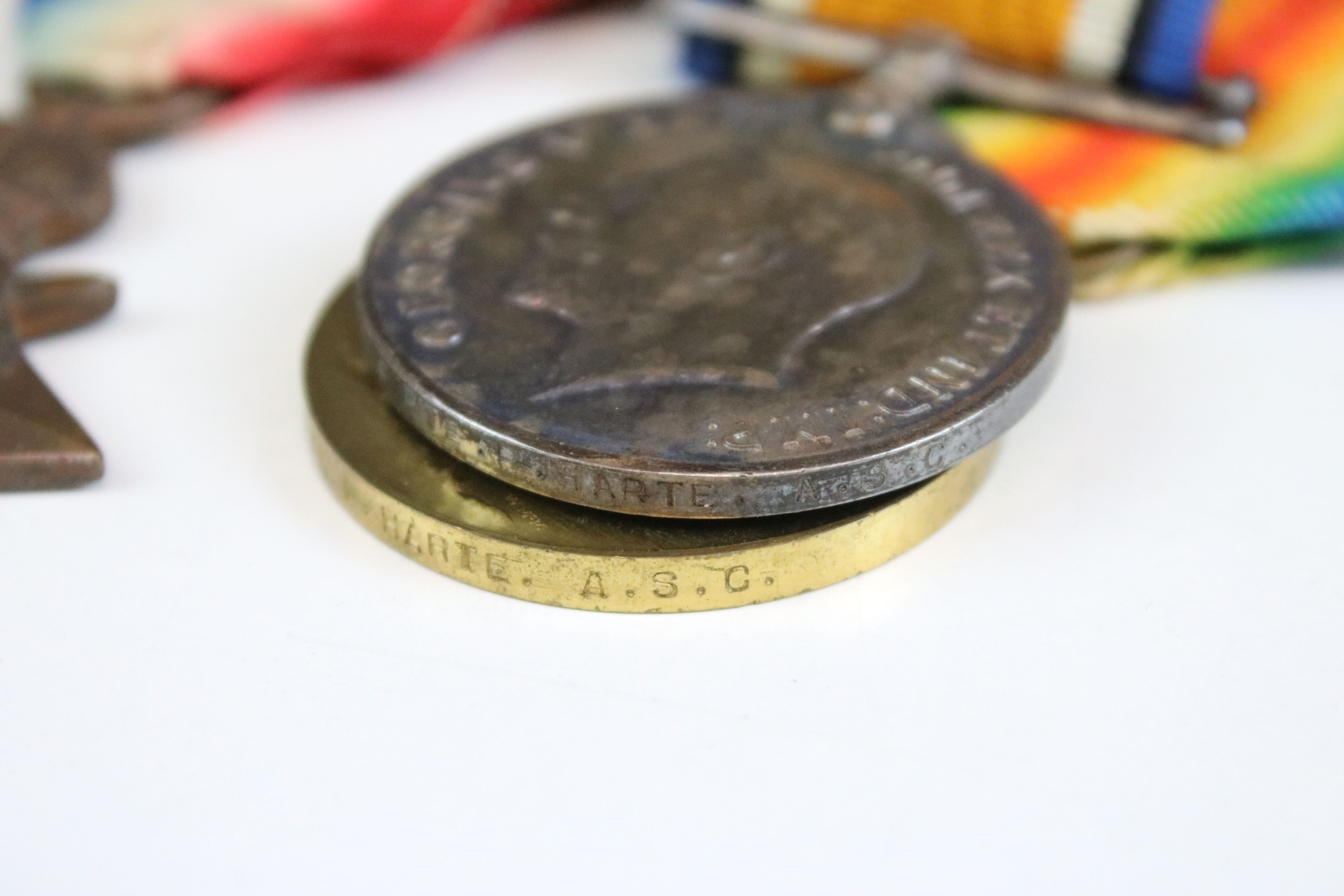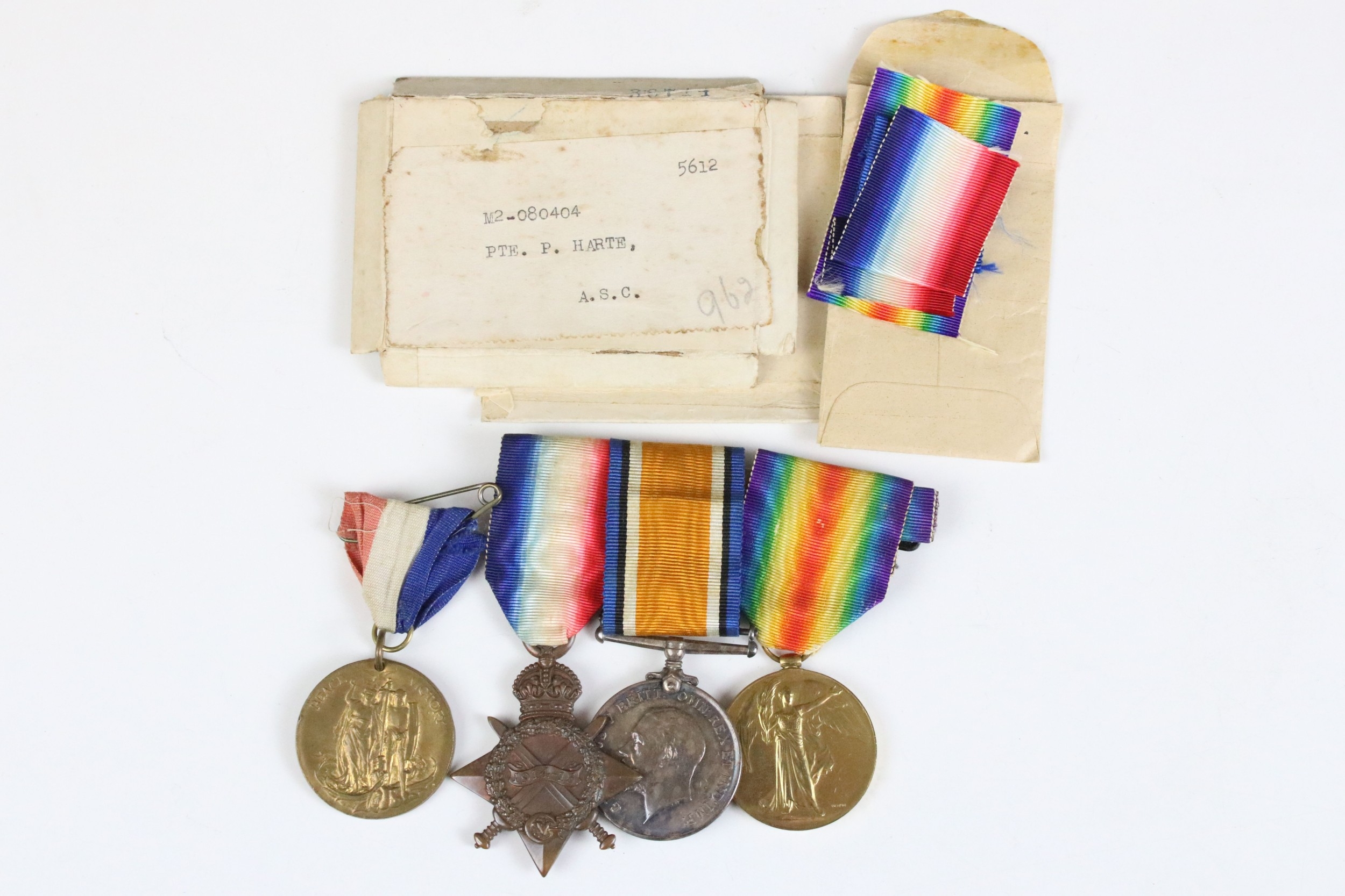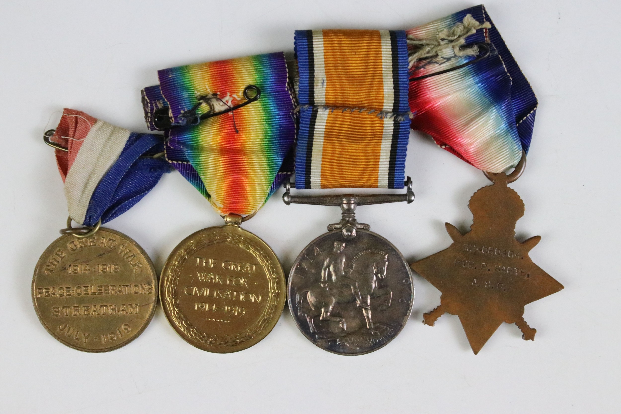 A British World War One / WW1 full size medal trio to include Victory medal, British War medal and the 1914-15 Star medal, all correctly named and issued to iM2-080404 PTE. P. HARTE of the Royal Army Service Corps, swing mounted on original ribbons and together with a Streatham Great War victory celebration medal.