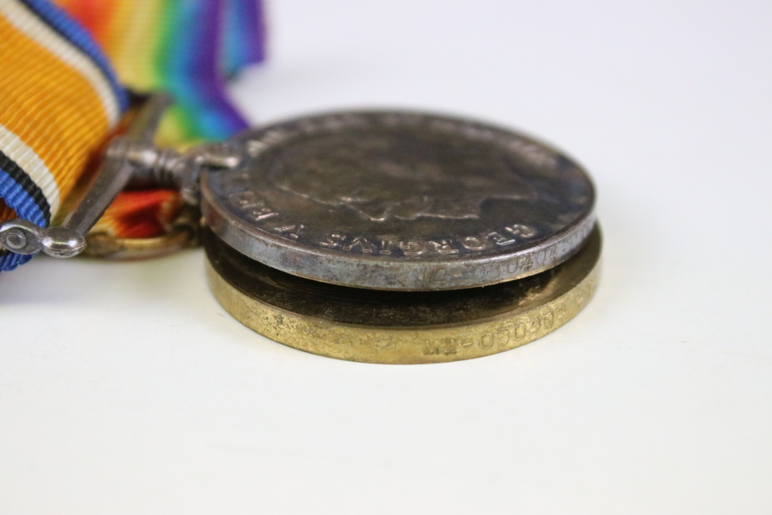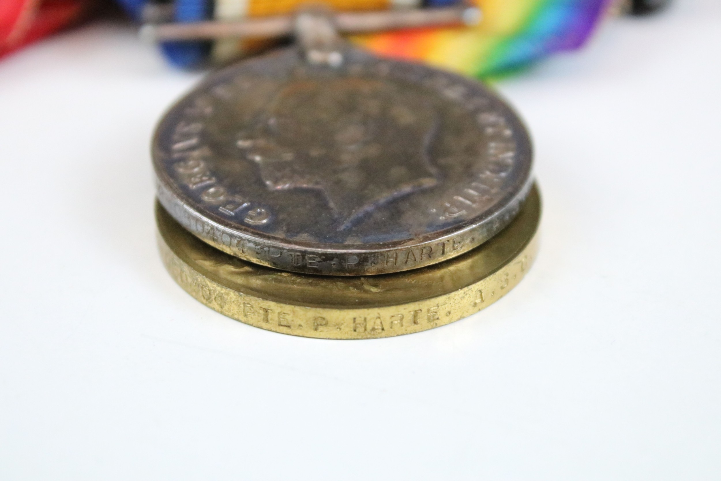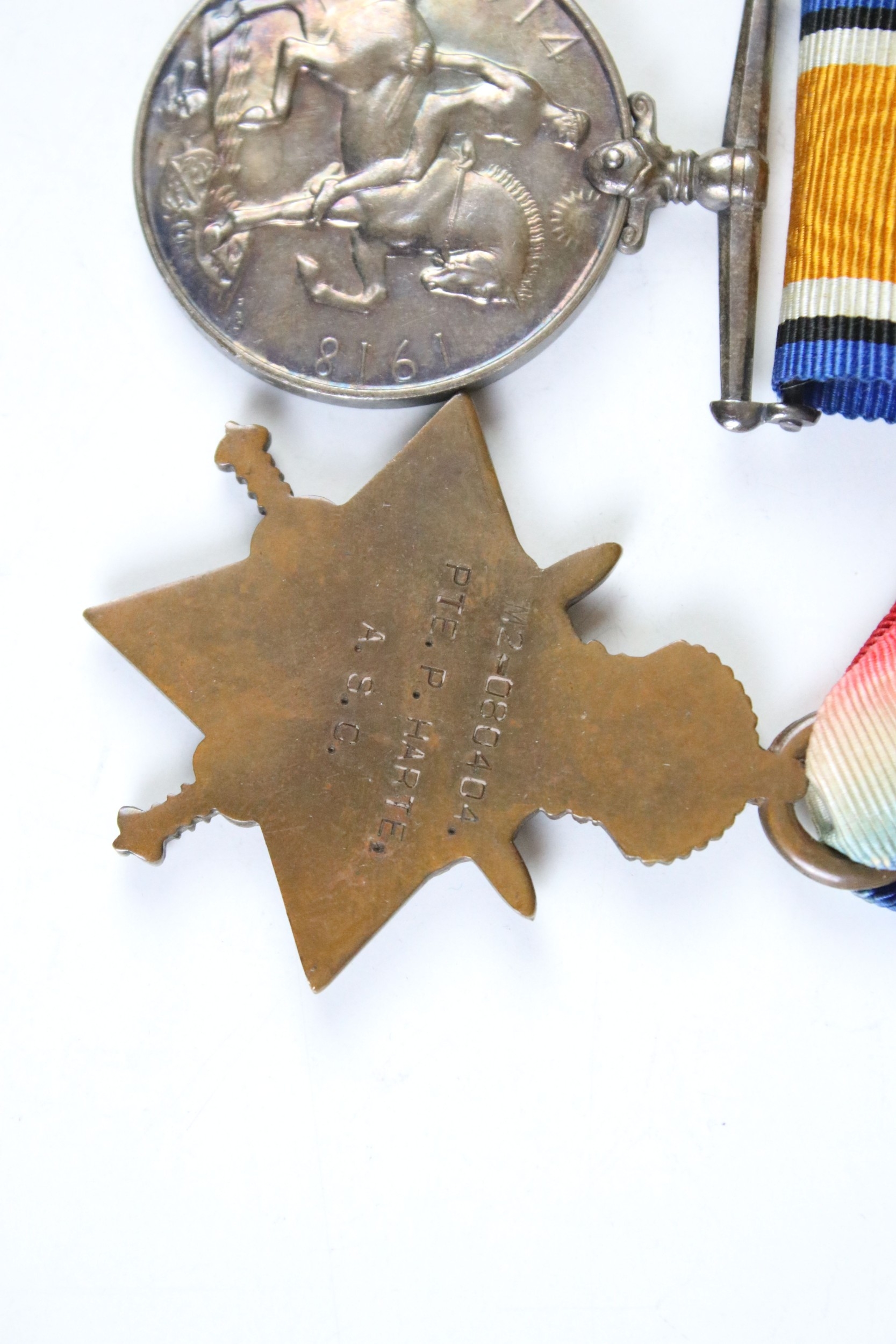 A British World War One / WW1 full size medal trio to include Victory medal, British War medal and the 1914-15 Star medal, all correctly named and issued to iM2-080404 PTE. P. HARTE of the Royal Army Service Corps, swing mounted on original ribbons and together with a Streatham Great War victory celebration medal.