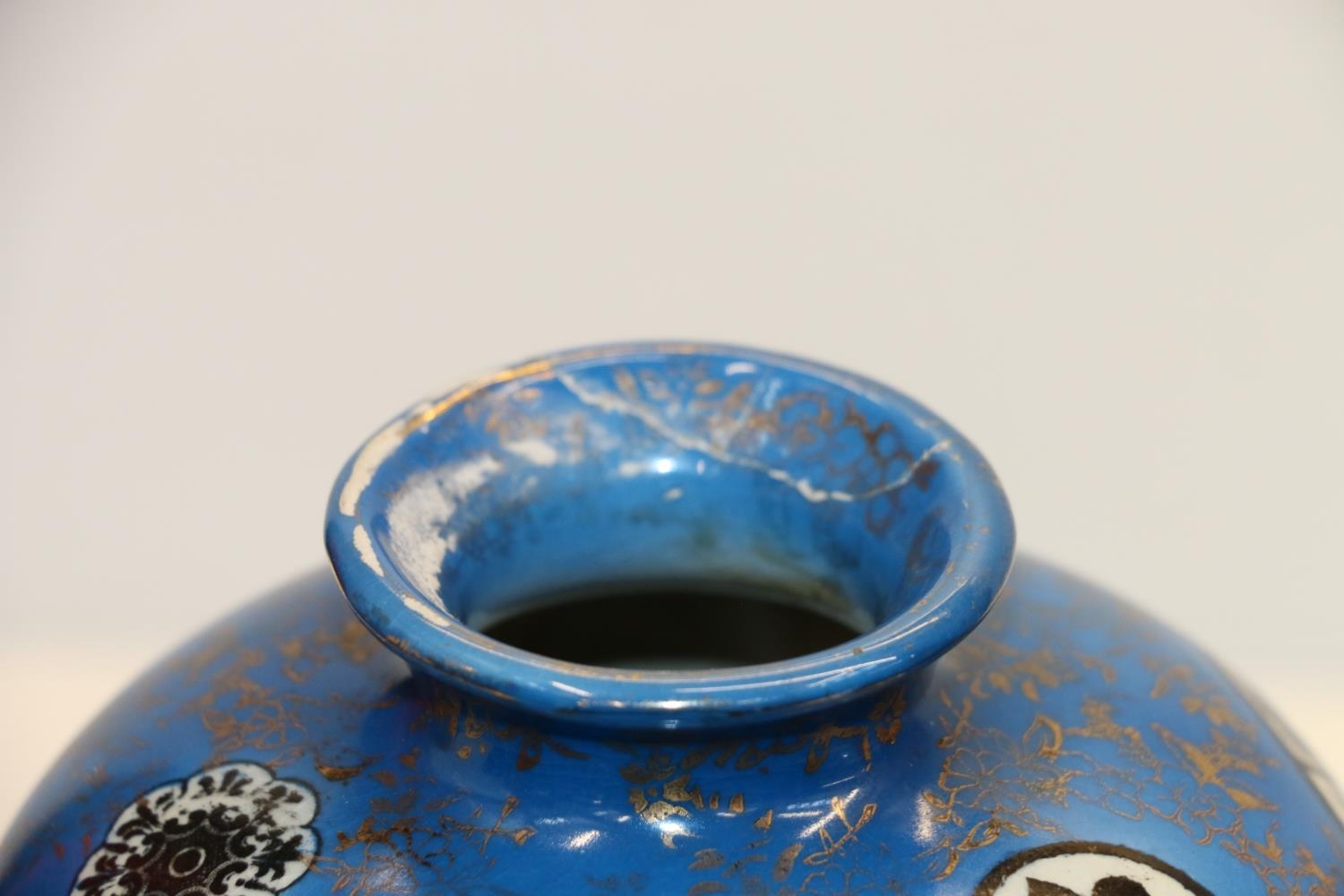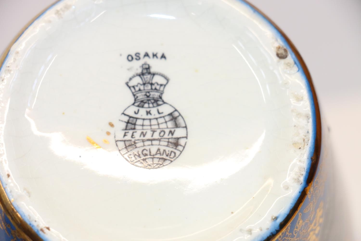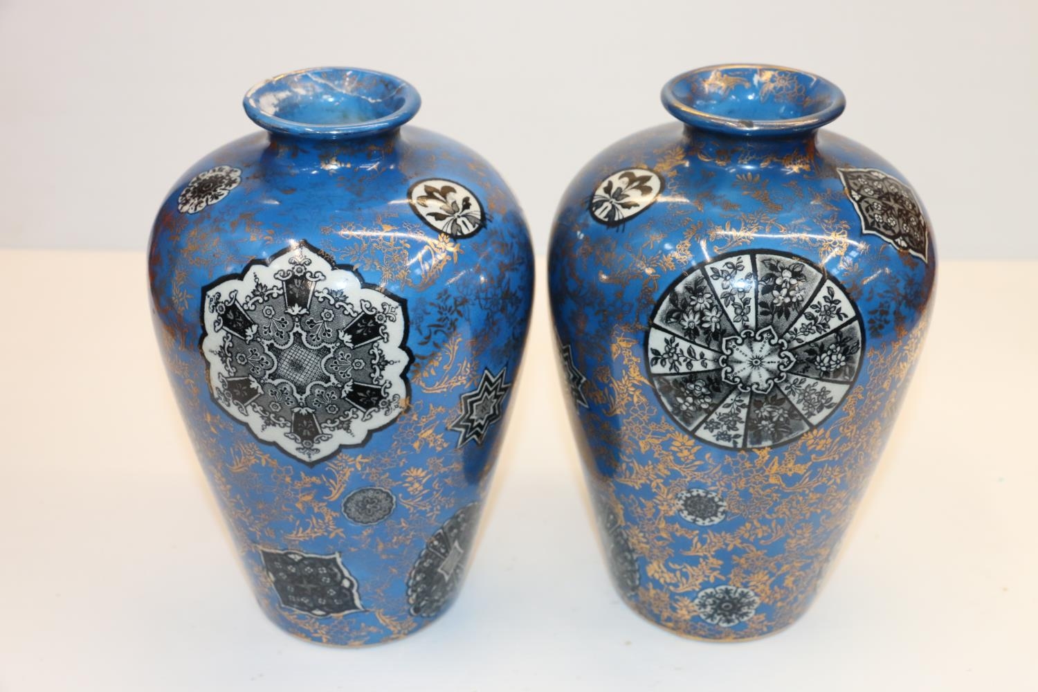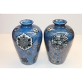 Pair of Fenton blue ground vases decorated with floral gilt pattern and geometric roundels, 21cm.