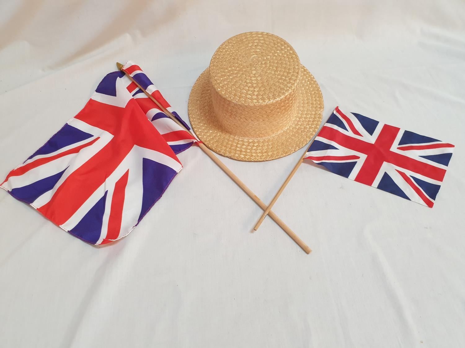 "Christy's London" Vintage Traditional Metron Couri Boater Hat (100% Straw, Made in England) and 2 x British Flags
