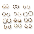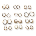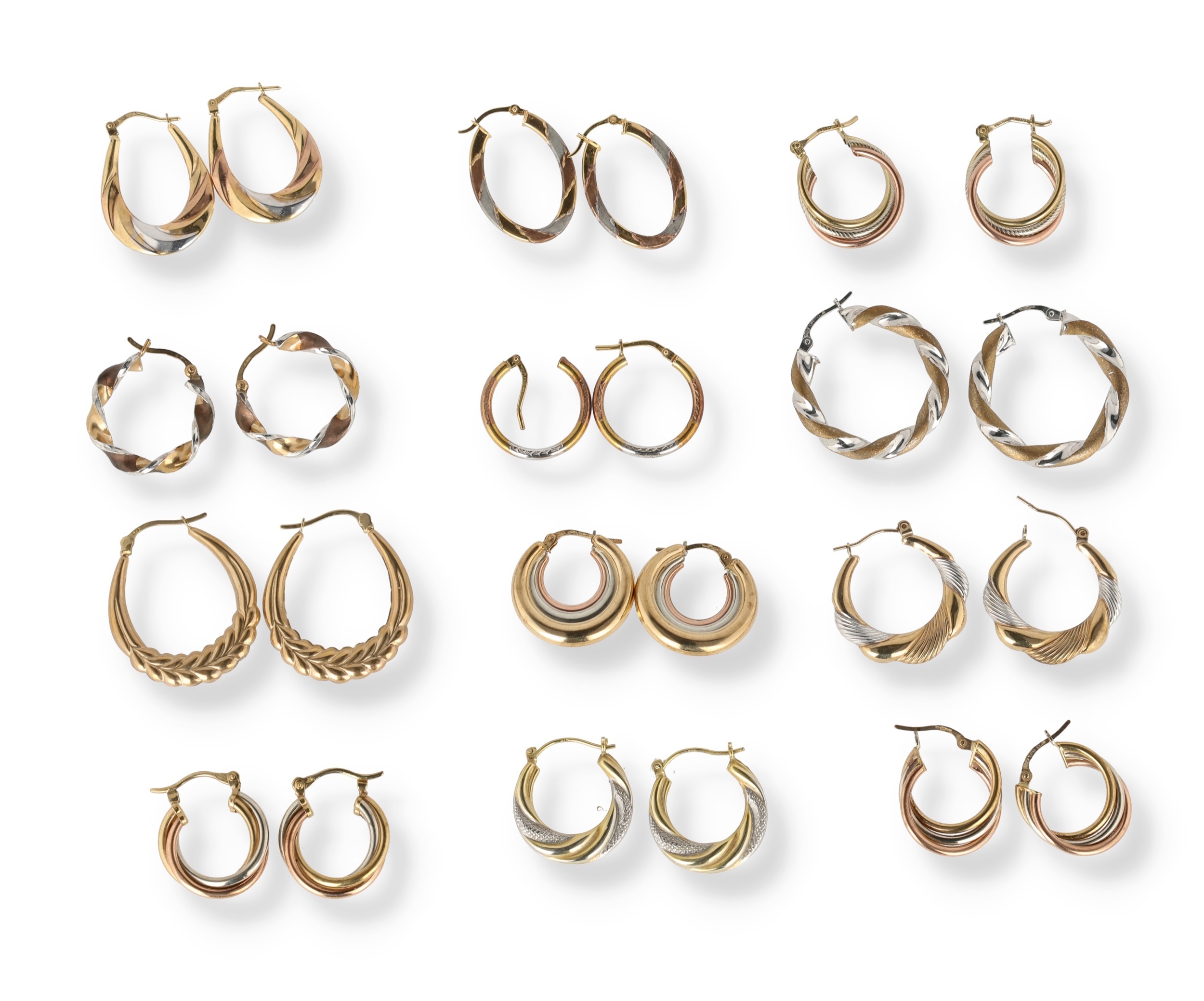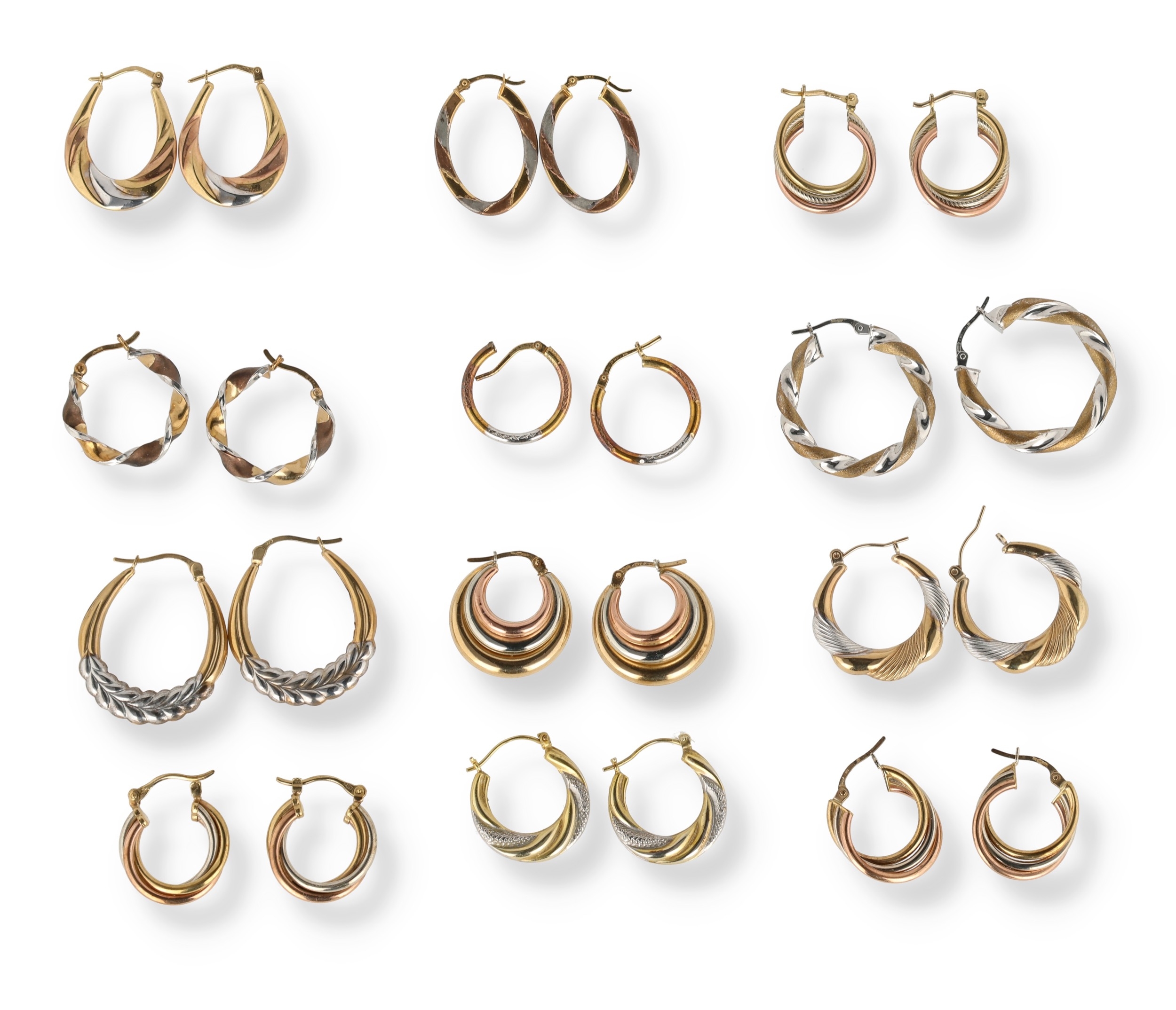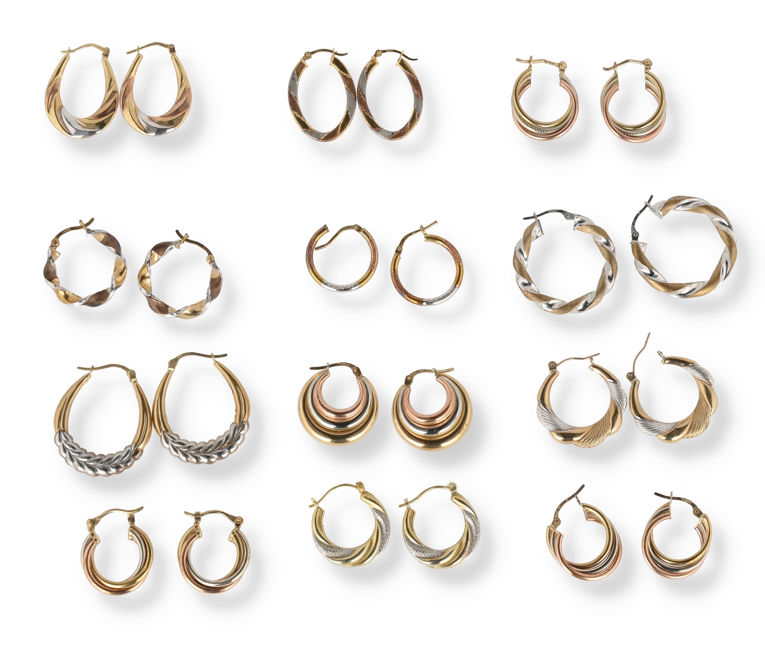A COLLECTION OF TWELVE PAIRS OF TWO AND THREE COLOUR 9 CARAT GOLD HOOP EARRINGS