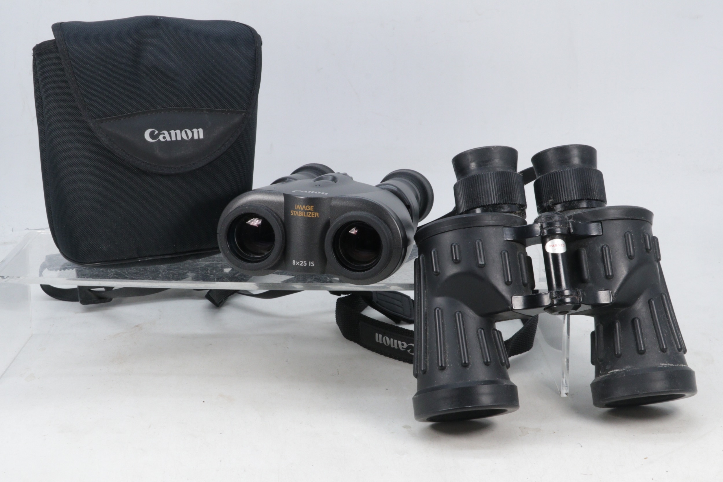 Canon 8x25 IS binoculars in case together with a pair of Swift 7.5x44 Derby binoculars