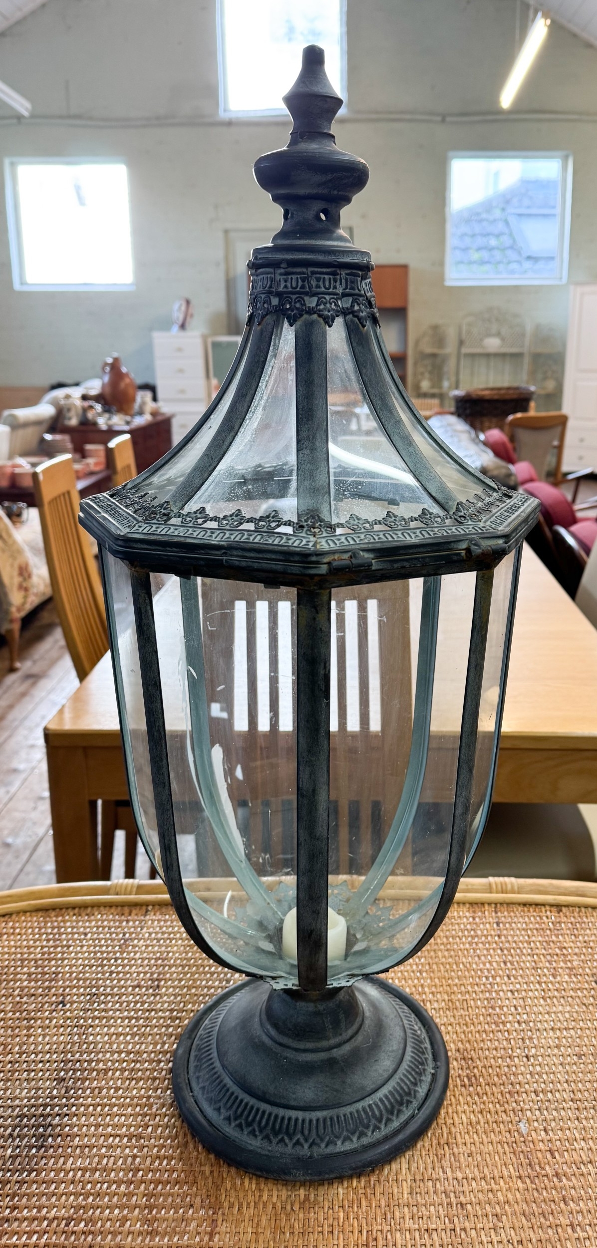 A large statement Verdigris effect table lantern on a circular base, 30" high