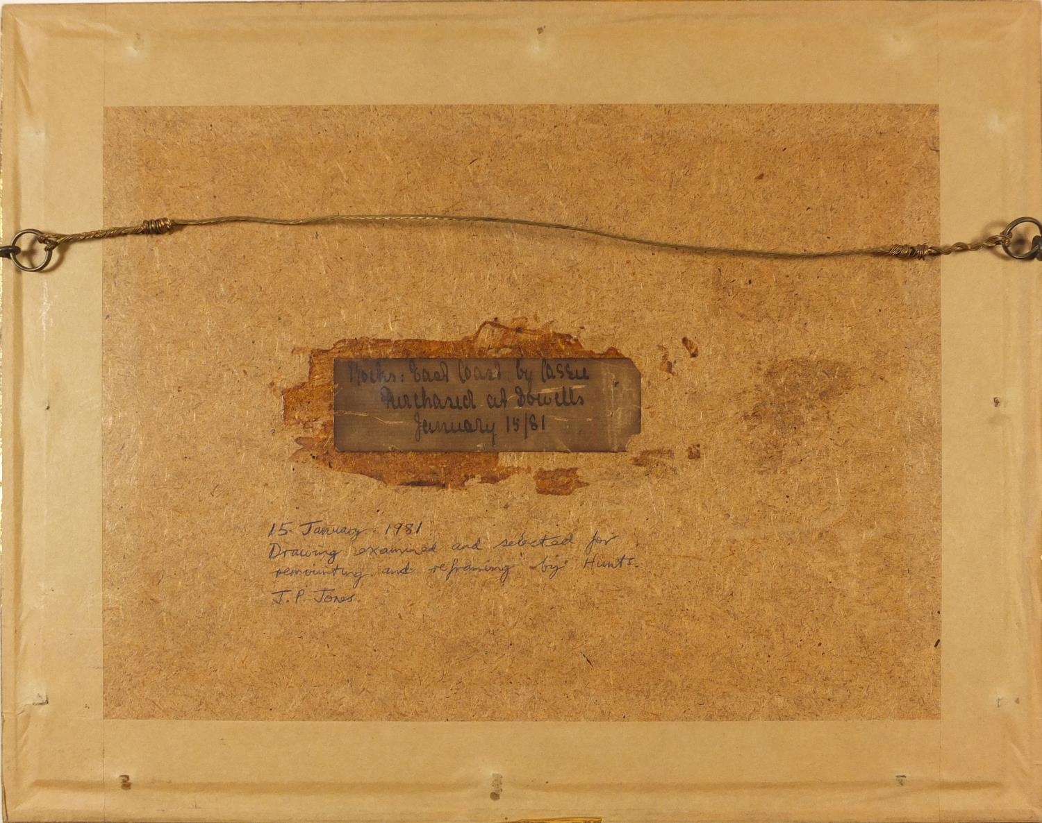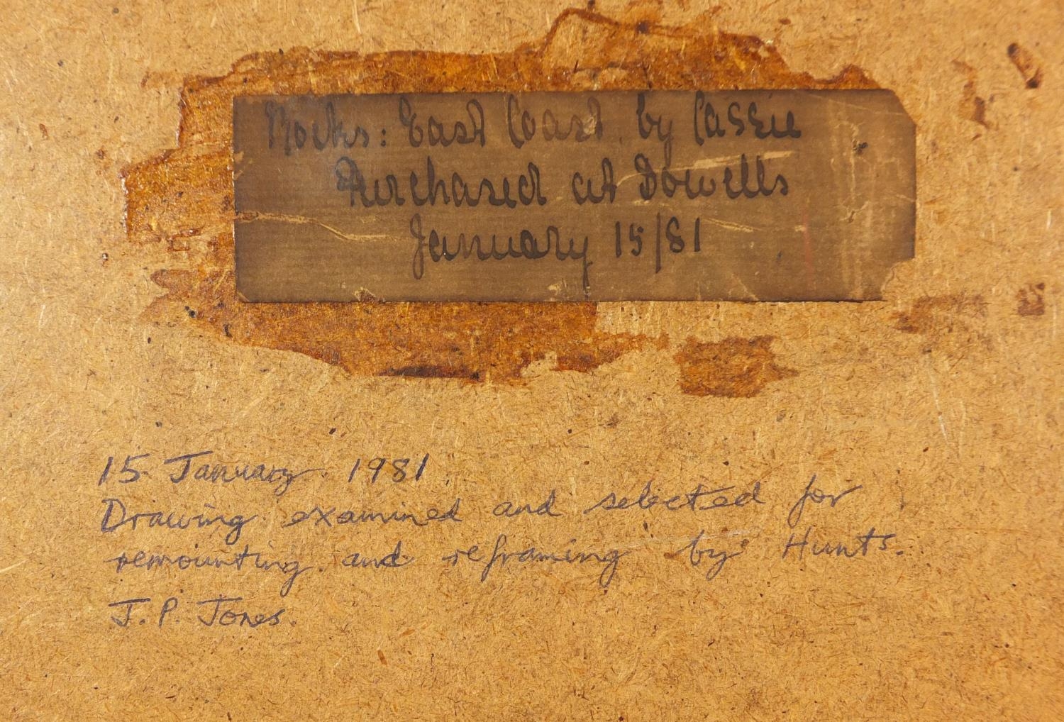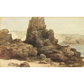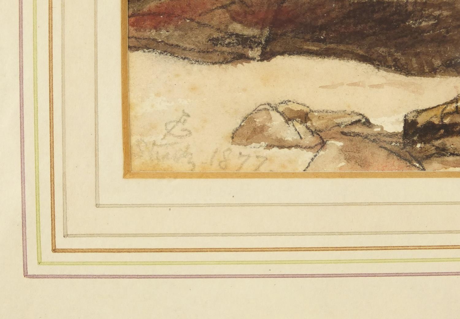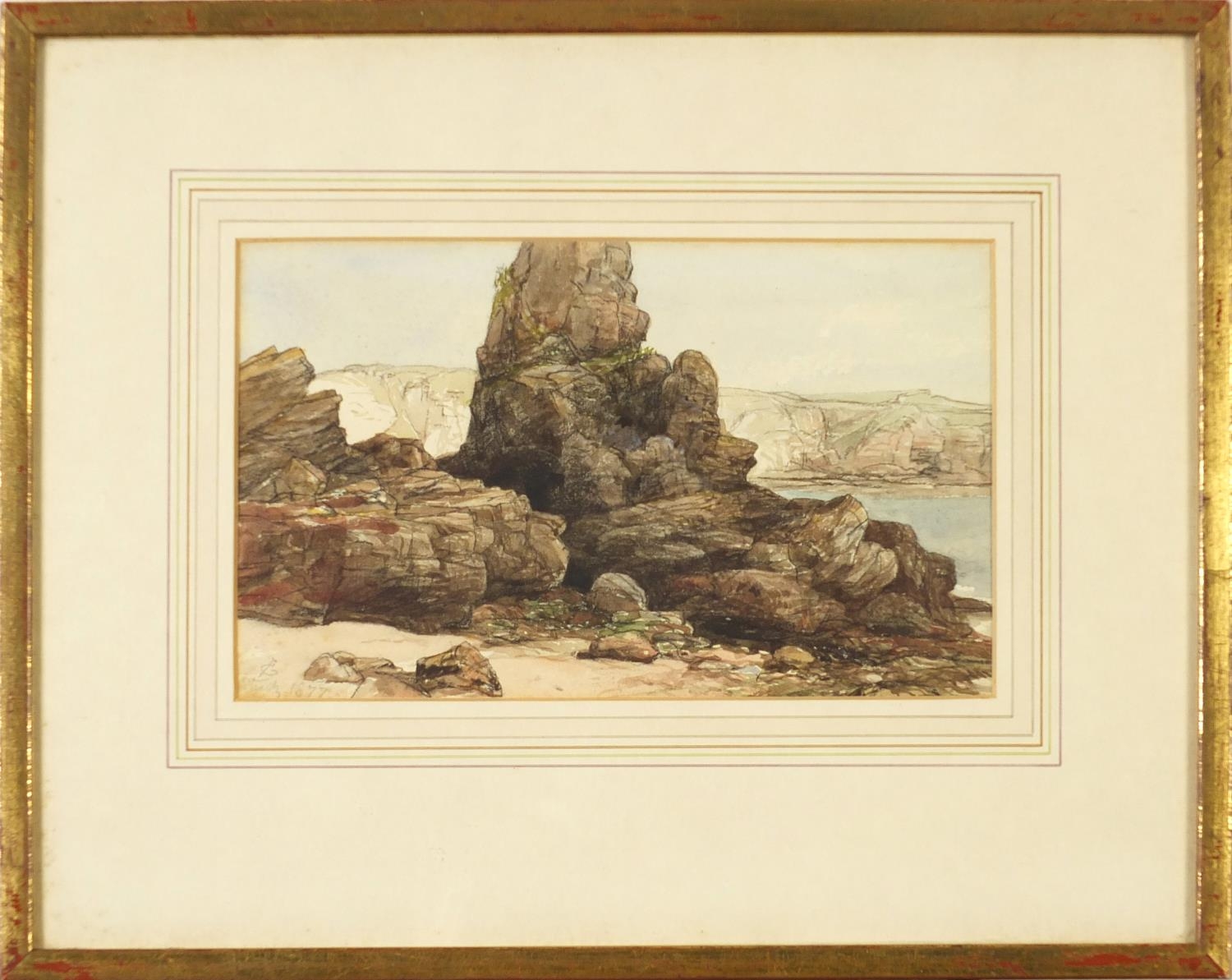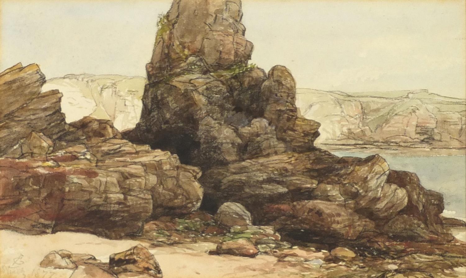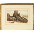James Cassie - Rocks east coast of Scotland, 19th century watercolour, inscription and inscribed label verso, mounted, framed and glazed, 22cm x 13.5cm excluding the mount and frame
