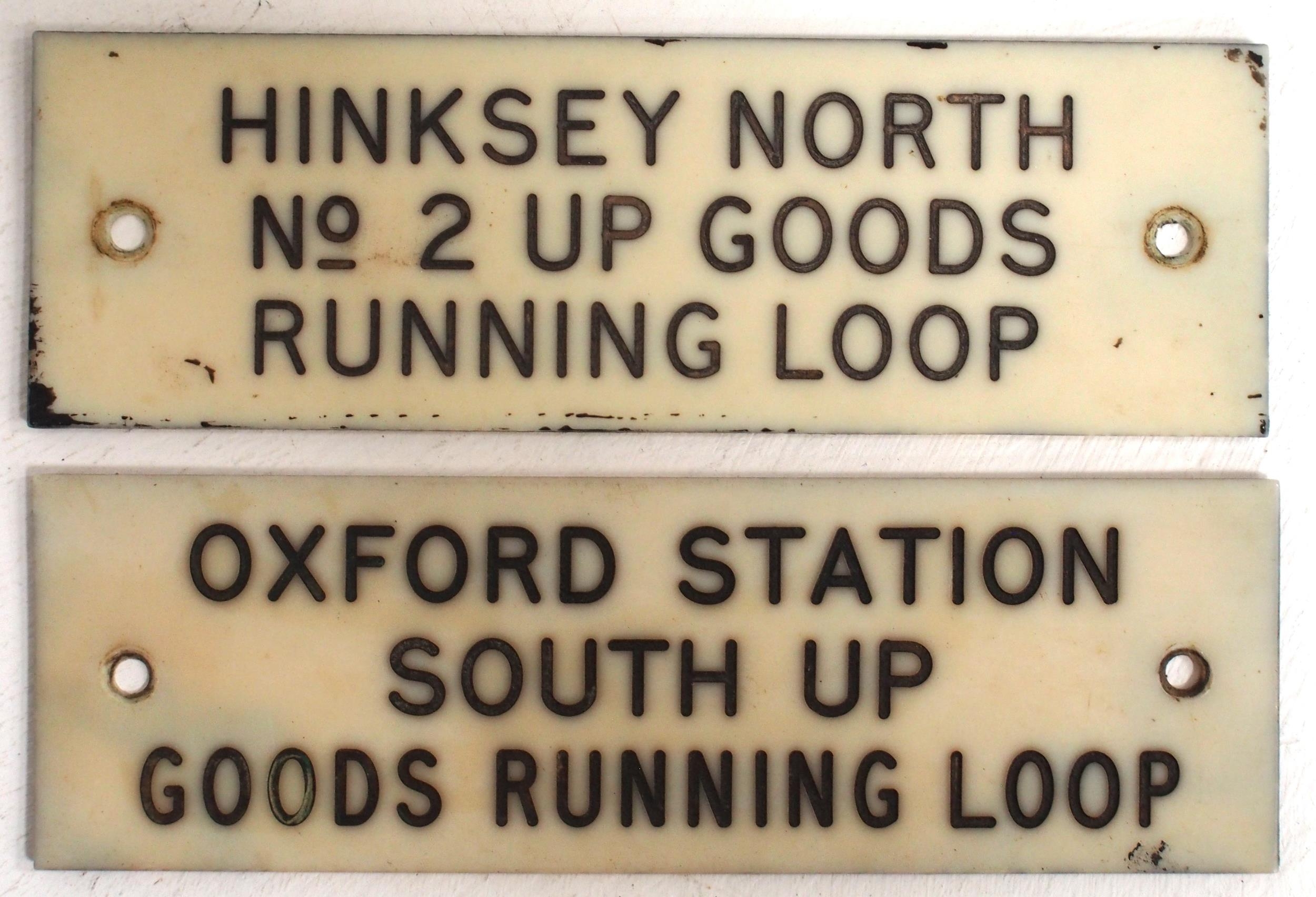 GWR Ivorine signal box shelf plates - "HINKSEY NORTH NO 2 UP GOODS RUNNING LOOP" & "OXFORD STATION SOUTH UP GOODS RUNNING LOOP", dating from the wartime Oxford re-signalling period. (2) (D2) (Dispatch by Mailboxes/Collect from Banbury Depot)