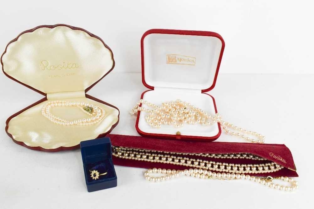 A group of costume jewellery to include simulated pearl necklaces of different form, and a ring.