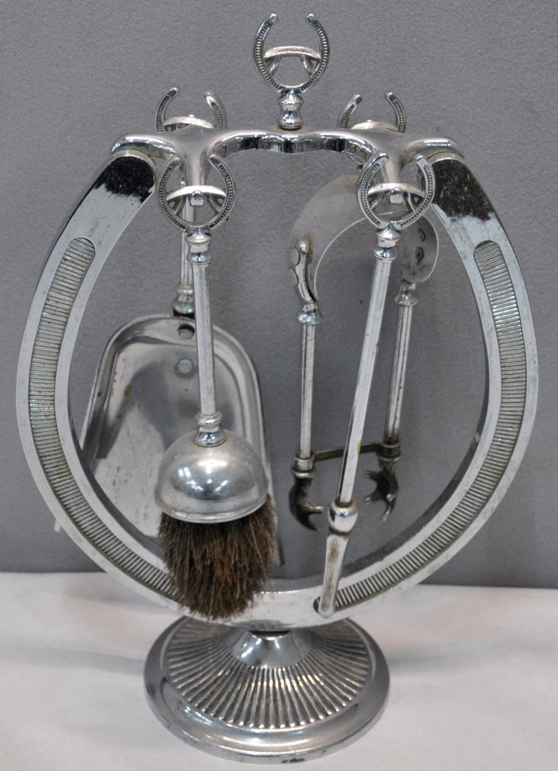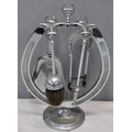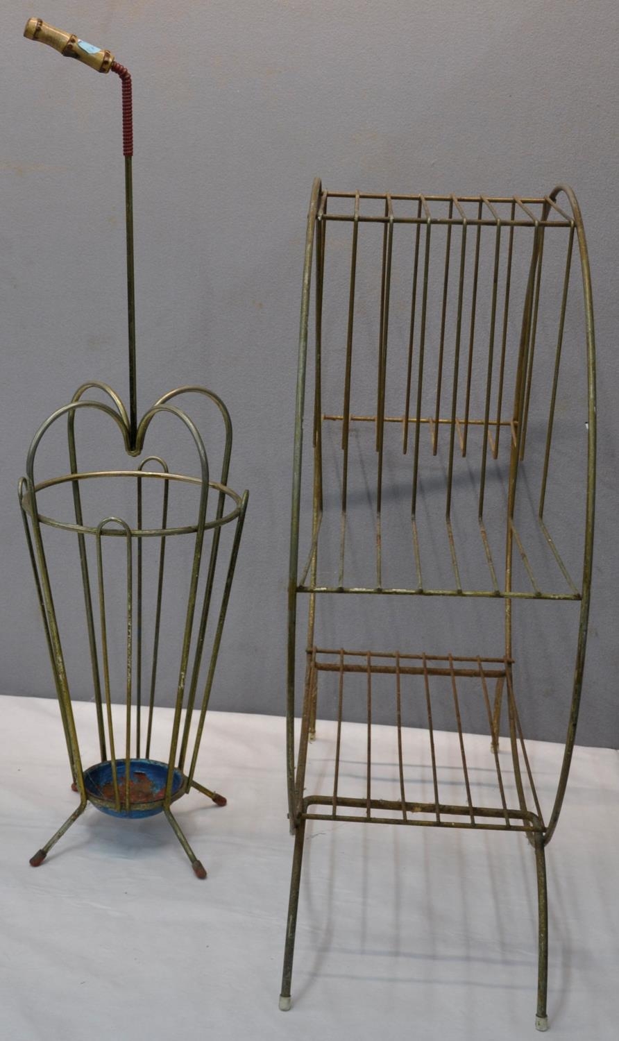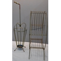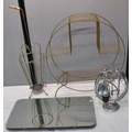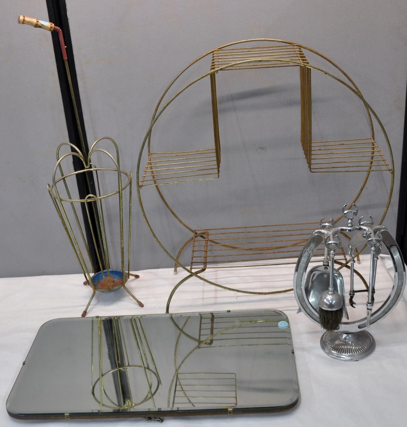 WIRE UMBRELLA STAND, WIRE SIDE TABLE, FRAMELESS MIRROR & HORSESHOE FIRE COMPANION SET