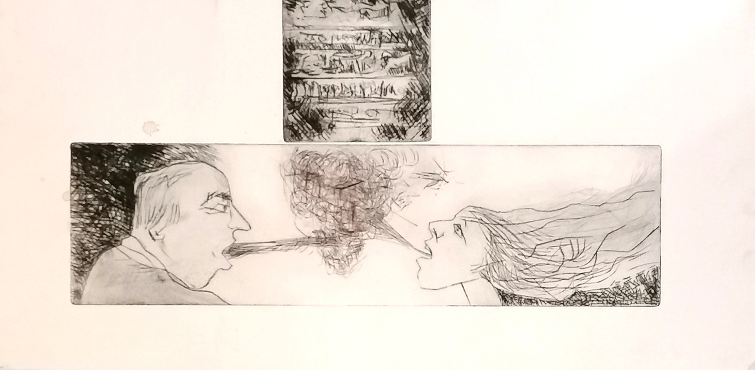 Engraving of man & woman blowing smoke at each other - 49.5cm x 24.5cm ~ has a couple of marks