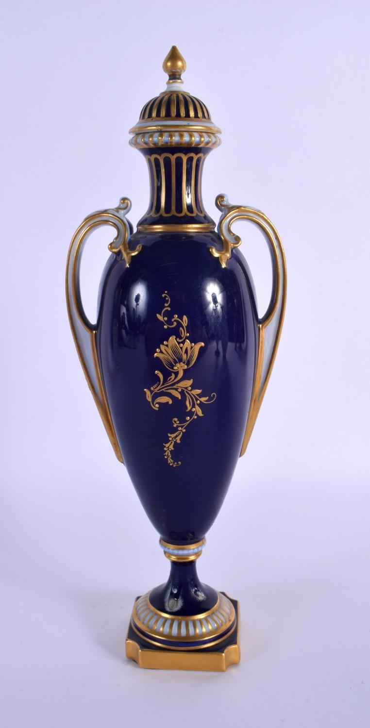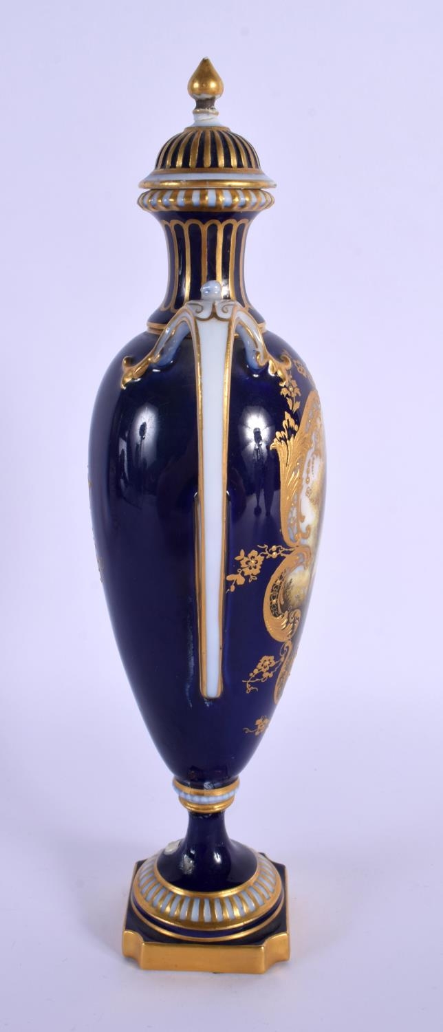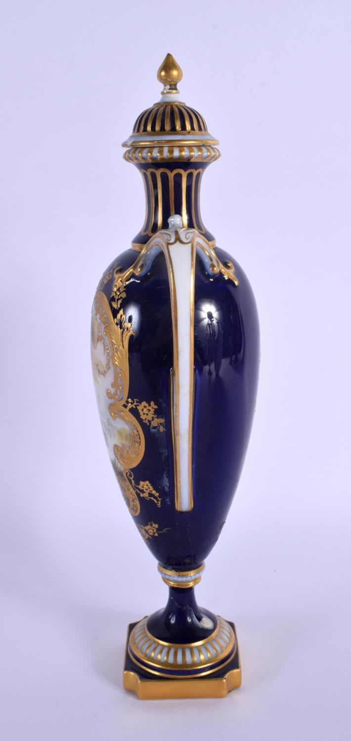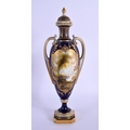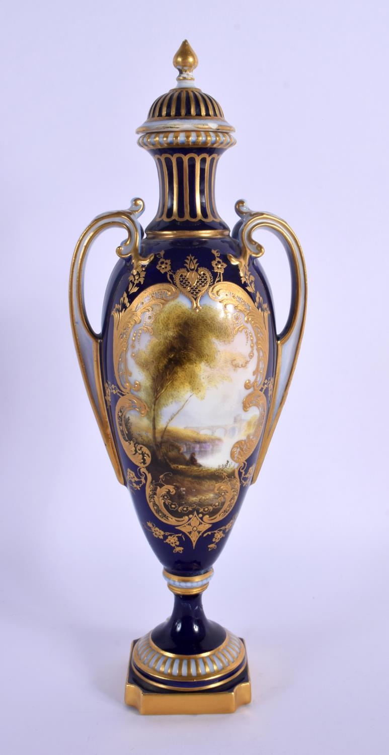 A ROYAL WORCESTER TWIN HANDLED VASE AND COVER by Harry Davis, painted with a Scottish scene. 24 cm high.