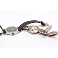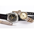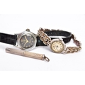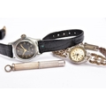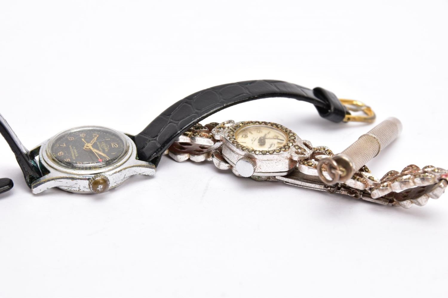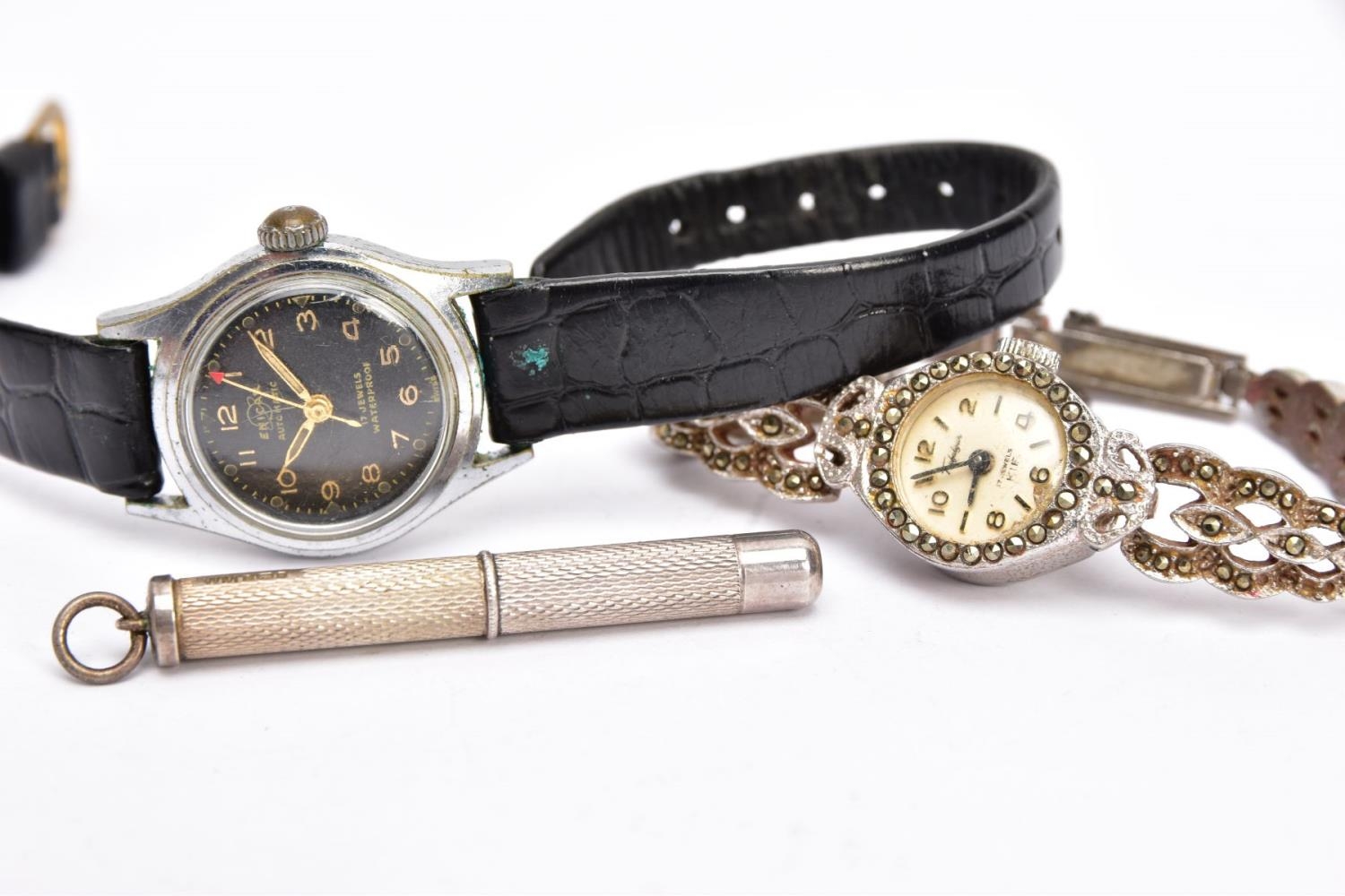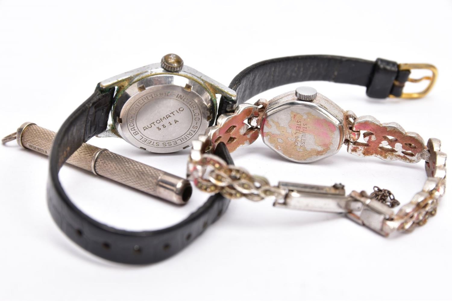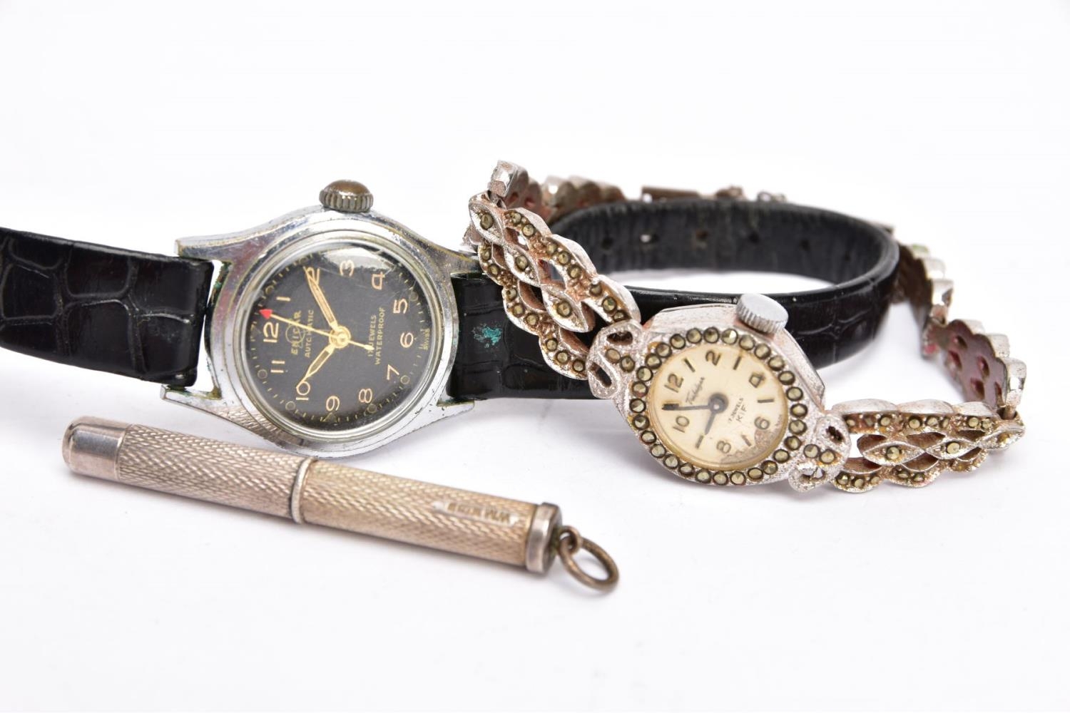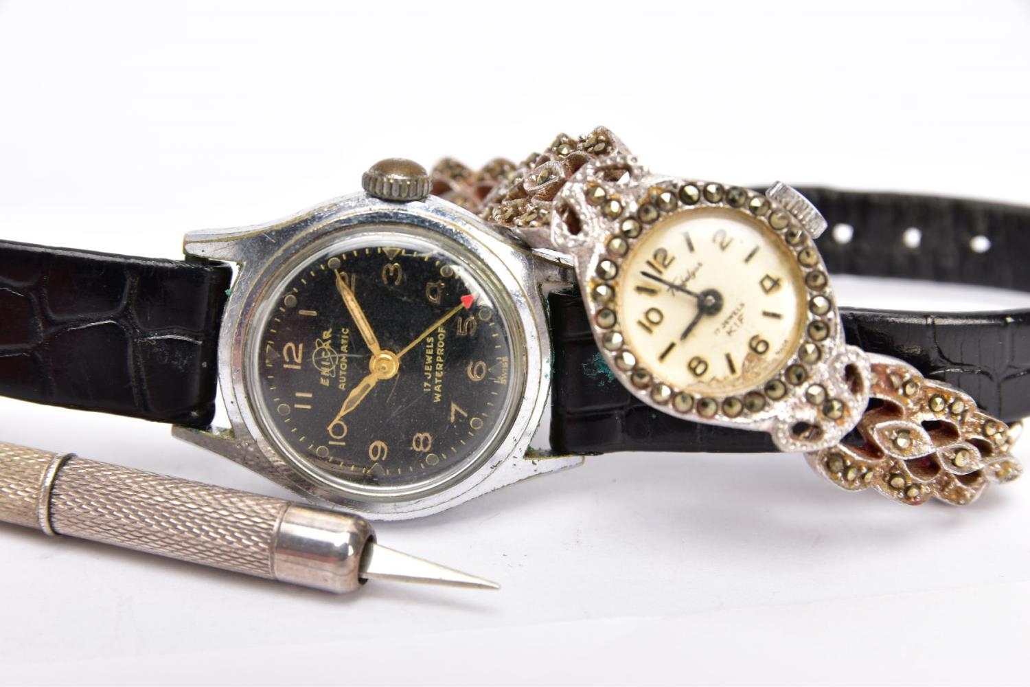 A LADIES 'ENICAR AUTOMATIC' WATCH, A LADIES STAINLESS STEEL MARCASTIE WATCH AND A SILVER CIGAR PIERCER, the gents watch with a round black dial signed 'Enicar, automatic 17 jewels, waterproof', Arabic numerals, gold hands, within a stainless steel case, case back stamped automatic 331A', approximate case width 19.1mm, fitted with a black strap with a yellow metal ardillon buckle, the marcasite watch, with a round cream dial signed 'Trafalgar, 17 jewels' Arabic numerals interspaced with baton markers, within a stainless steel marcasite case fitted with a marcasite openwork bracelet and a fold over clasp, also with an engine turned design cigar piercer, hallmarked 'William Maton' Birmingham 1985, length 55mm, including suspension loop, weight 6.7 grams