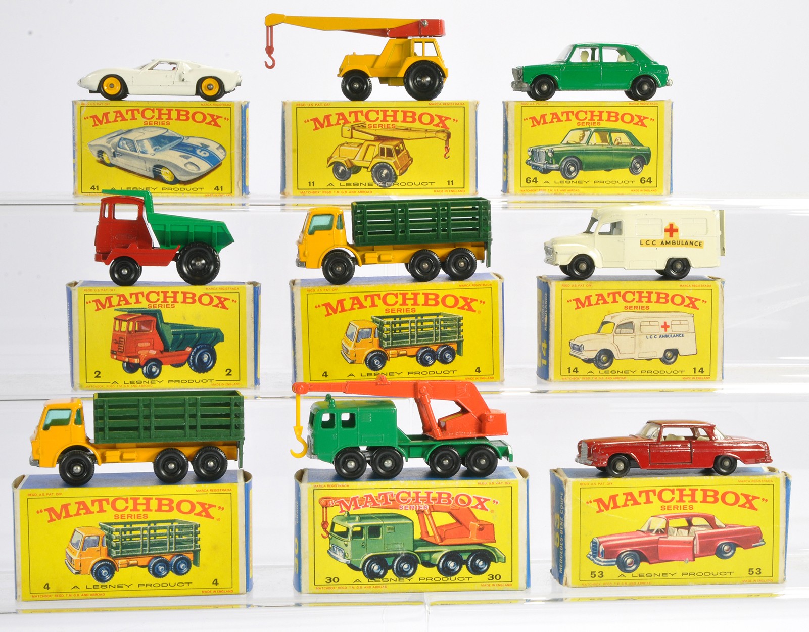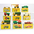 Matchbox Regular wheels comprising nine boxed issues as shown. MG1100, Stake Truck, 8 Wheel Crane, Ford GT etc. Mostly very good or excellent in some good but mostly very good/excellent boxes. Generally Ex-Shop Stock.