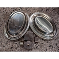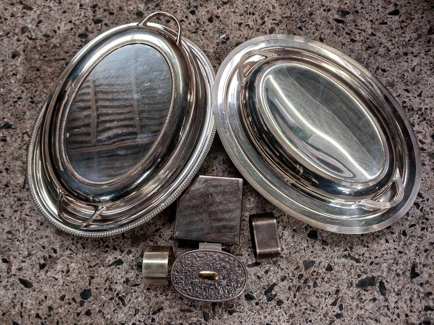 2 WHITE METAL HORS D'OEUVRES DISHES, 2 NAPKIN RINGS & 2 TRINKET BOXES