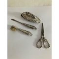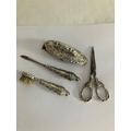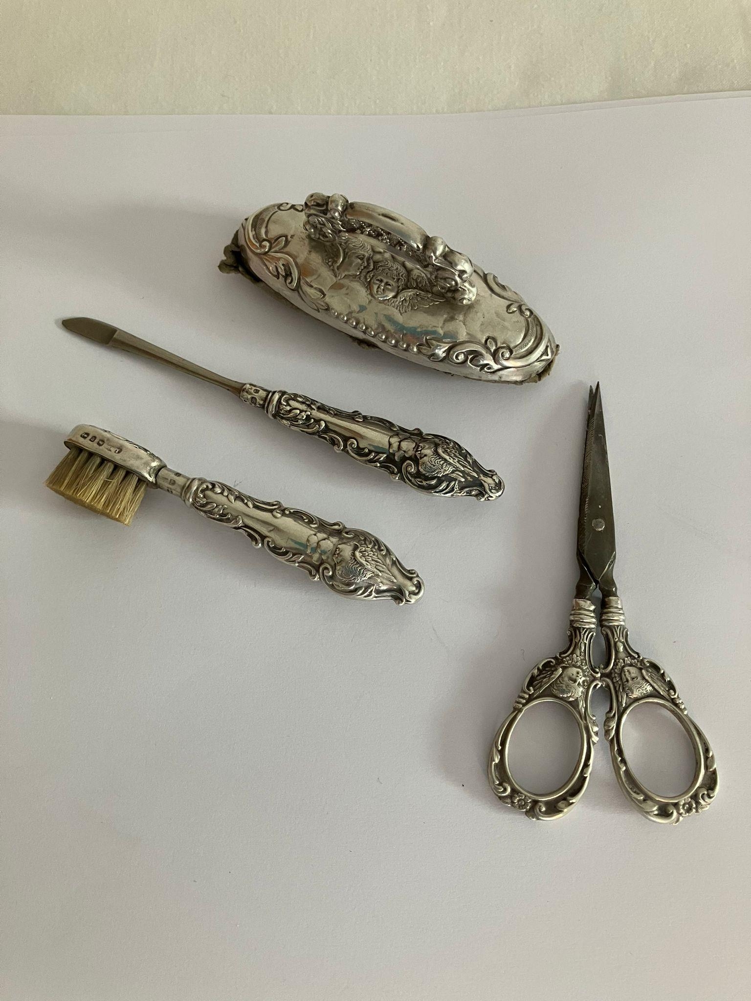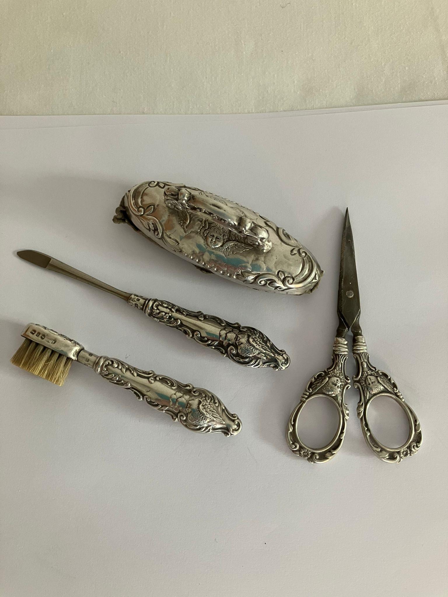 Ladies antique SILVER HANDLED MANICURE/GROOMING set, together with a pair of SILVER handled scissors. Clear hallmark for Levi and Salaman, Birmingham, 1898.